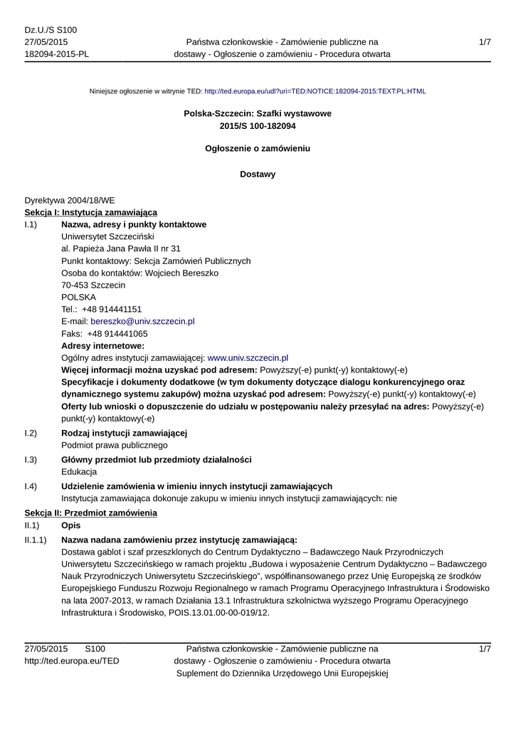 Dz.U./S S100 27/05/2015 182094-2015-PL Państwa członkowskie - Zamówienie publiczne na dostawy - Ogłoszenie o zamówieniu - Procedura otwarta 1/7 Niniejsze ogłoszenie w witrynie TED: http://ted.europa.eu/udl?uri=TED:NOTICE:182094-2015:TEXT:PL:HTML Polska-Szczecin: Szafki wystawowe 2015/S 100-182094 Ogłoszenie o zamówieniu Dostawy Dyrektywa 2004/18/WE Sekcja I: Instytucja zamawiająca I.1) Nazwa, adresy i punkty kontaktowe Uniwersytet Szczeciński al. Papieża Jana Pawła II nr 31 Punkt kontaktowy: Sekcja Zamówień Publicznych Osoba do kontaktów: Wojciech Bereszko 70-453 Szczecin POLSKA Tel.: +48 914441151 E-mail: [email protected] Faks: +48 914441065 Adresy internetowe: Ogólny adres instytucji zamawiającej: www.univ.szczecin.pl Więcej informacji można uzyskać pod adresem: Powyższy(-e) punkt(-y) kontaktowy(-e) Specyfikacje i dokumenty dodatkowe (w tym dokumenty dotyczące dialogu konkurencyjnego oraz dynamicznego systemu zakupów) można uzyskać pod adresem: Powyższy(-e) punkt(-y) kontaktowy(-e) Oferty lub wnioski o dopuszczenie do udziału w postępowaniu należy przesyłać na adres: Powyższy(-e) punkt(-y) kontaktowy(-e) I.2) Rodzaj instytucji zamawiającej Podmiot prawa publicznego I.3) Główny przedmiot lub przedmioty działalności Edukacja I.4) Udzielenie zamówienia w imieniu innych instytucji zamawiających Instytucja zamawiająca dokonuje zakupu w imieniu innych instytucji zamawiających: nie Sekcja II: Przedmiot zamówienia II.1) Opis II.1.1) Nazwa nadana zamówieniu przez instytucję zamawiającą: Dostawa gablot i szaf przeszklonych do Centrum Dydaktyczno – Badawczego Nauk Przyrodniczych Uniwersytetu Szczecińskiego w ramach projektu „Budowa i wyposażenie Centrum Dydaktyczno – Badawczego Nauk Przyrodniczych Uniwersytetu Szczecińskiego”, współfinansowanego przez Unię Europejską ze środków Europejskiego Funduszu Rozwoju Regionalnego w ramach Programu Operacyjnego Infrastruktura i Środowisko na lata 2007-2013, w ramach Działania 13.1 Infrastruktura szkolnictwa wyższego Programu Operacyjnego Infrastruktura i Środowisko, POIS.13.01.00-00-019/12. 27/05/2015 S100 http://ted.europa.eu/TED Państwa członkowskie - Zamówienie publiczne na dostawy - Ogłoszenie o zamówieniu - Procedura otwarta Suplement do Dziennika Urzędowego Unii Europejskiej 1/7 Dz.U./S S100 27/05/2015 182094-2015-PL Państwa członkowskie - Zamówienie publiczne na dostawy - Ogłoszenie o zamówieniu - Procedura otwarta 2/7 II.1.2) Rodzaj zamówienia oraz lokalizacja robót budowlanych, miejsce realizacji dostawy lub świadczenia usług Dostawy Kupno Główne miejsce lub lokalizacja robót budowlanych, miejsce realizacji dostawy lub świadczenia usług: Szczecin. Kod NUTS PL424 II.1.3) Informacje na temat zamówienia publicznego, umowy ramowej lub dynamicznego systemu zakupów (DSZ) Ogłoszenie dotyczy zamówienia publicznego II.1.4) Informacje na temat umowy ramowej II.1.5) Krótki opis zamówienia lub zakupu Dostawa gablot i szaf przeszklonych do Centrum Dydaktyczno – Badawczego Nauk Przyrodniczych Uniwersytetu Szczecińskiego w ramach projektu „Budowa i wyposażenie Centrum Dydaktyczno – Badawczego Nauk Przyrodniczych Uniwersytetu Szczecińskiego”, współfinansowanego przez Unię Europejską ze środków Europejskiego Funduszu Rozwoju Regionalnego w ramach Programu Operacyjnego Infrastruktura i Środowisko na lata 2007-2013, w ramach Działania 13.1 Infrastruktura szkolnictwa wyższego Programu Operacyjnego Infrastruktura i Środowisko, POIS.13.01.00-00-019/12. II.1.6) Wspólny Słownik Zamówień (CPV) 39154100 II.1.7) Informacje na temat Porozumienia w sprawie zamówień rządowych (GPA) Zamówienie jest objęte Porozumieniem w sprawie zamówień rządowych (GPA): tak II.1.8) Części To zamówienie podzielone jest na części: nie II.1.9) Informacje o ofertach wariantowych Dopuszcza się składanie ofert wariantowych: nie II.2) Wielkość lub zakres zamówienia II.2.1) Całkowita wielkość lub zakres: Dostawa gablot i szaf przeszklonych do Centrum Dydaktyczno – Badawczego Nauk Przyrodniczych Uniwersytetu Szczecińskiego w ramach projektu „Budowa i wyposażenie Centrum Dydaktyczno – Badawczego Nauk Przyrodniczych Uniwersytetu Szczecińskiego”, współfinansowanego przez Unię Europejską ze środków Europejskiego Funduszu Rozwoju Regionalnego w ramach Programu Operacyjnego Infrastruktura i Środowisko na lata 2007-2013, w ramach Działania 13.1 Infrastruktura szkolnictwa wyższego Programu Operacyjnego Infrastruktura i Środowisko, POIS.13.01.00-00-019/12. II.2.2) Informacje o opcjach Opcje: nie II.2.3) Informacje o wznowieniach Jest to zamówienie podlegające wznowieniu: nie II.3) Czas trwania zamówienia lub termin realizacji w dniach: 30 (od udzielenia zamówienia) Sekcja III: Informacje o charakterze prawnym, ekonomicznym, finansowym i technicznym III.1) Warunki dotyczące zamówienia III.1.1) Wymagane wadia i gwarancje: 27/05/2015 S100 http://ted.europa.eu/TED Państwa członkowskie - Zamówienie publiczne na dostawy - Ogłoszenie o zamówieniu - Procedura otwarta Suplement do Dziennika Urzędowego Unii Europejskiej 2/7 Dz.U./S S100 27/05/2015 182094-2015-PL Państwa członkowskie - Zamówienie publiczne na dostawy - Ogłoszenie o zamówieniu - Procedura otwarta 3/7 1. Oferta powinna być zabezpieczona wadium w wysokości: 2 000,00 PLN (słownie: dwa tysiące złotych 00/100); Wadium może być wniesione w: — pieniądzu, — poręczeniach bankowych lub SKOK, z tym, że poręczenie SKOK jest zawsze poręczeniem pieniężnym, — gwarancjach ubezpieczeniowych lub bankowych, — poręczeniach udzielanych przez podmioty, o których mowa w art. 6b ust. 5 pkt 2 ustawy z dnia 9 listopada 2000 r. o utworzeniu Polskiej Agencji Rozwoju Przedsiębiorczości (Dz. U. Nr 109, poz. 1158, 2000 r. z późniejszymi zmianami). 1.1. W przypadku wnoszenia wadium w pieniądzu, kwota oznaczona w punkcie 1 powinna zostać przelana na konto Zamawiającego: w banku: Bank