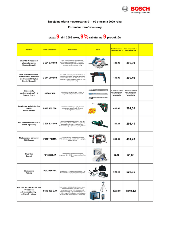 Specjalna oferta noworoczna: 01 - 09 stycznia 2009 roku Formularz zamówieniowy przez 9 dni 2009 roku, 9% rabatu, na 9 produktów Standardowa cena zakupu netto w PLN Cena zakupu netto po rabacie 9% w PLN moc: 1050W; prędkość obrotowa: 5600 obr./min; głębokośc cięcia: 90˚ - 54mm, 45˚ 38mm; średnica tarczy: 160 mm; średnica otworu tarczy: 20mm; waga: 3,6kg 429,00 390,39 0 611 250 900 moc: 620W; udar 2,2J; prędkość obrotowa: do 1000 obr./min; funkcja wiercenia i wiercenia z kuciem; liczba udarów: do 4400 /min; max. śr. wiercenia: w murze / drewnie / metalu: 22 / 30 / 13mm; waga: 2,1kg 439,00 399,49 brzeszczoty z uchwytem typu T i U Osprzęt Bosch cała grupa brzeszczoty z uchwytem typu T oraz U we wszystkich dostępnych opakowaniach 9% rabatu od każdej ceny zakupu netto poszczególnych brzeszczotów Urządzenie wielofunkcyjne UNEO Bosch zielony 0 603 952 020 urządzenie wielofunkcyjne łączące w sobie funkcje młota, wiertarki oraz wkrętarki; technologia litowo-jonowa 430,00 391,30 Piła łańcuchowa AKE 35 S Bosch ogrodowy 0 600 834 500 Piła łańcuchowa z silnikiem o mocy 1800 W, z prowadnicą o długości 350 mm, z prędkością łańcucha 9 m/sek. oraz z systemem SDS beznarzędziowego napinania i wymiany łańcucha 320,23 291,41 Młot udarowo-obrotowy Skil Masters F0151790MA 1100W, 4.0J, 5.6kg, system redukcji drgań VRS, dostosowany do osprzetu SDS+, sprzęgło, rękojeść boczna 540,36 491,73 Glue Gun Dremel F0131200JA Dremel Glue Gun z dwoma zakresami temperatur 120 i 195°C, w zestawie z 6 sztyftami kleju 72,40 65,88 Wyrzynarka Rotozip F012RZ05JA Rotozip 600W , w zestawie 4 przystawki i 7 szt ACC w solidnej i wytrzymalej płóciennej torbie 580,60 528,35 laser rotacyjny: dokładność: ±0,1mm/m; zakres samopoziomowania: ±5º (±8%); czas samopoziomowania: <15s; klasa lasera: 2; widoczność lasera: 30m; dystans roboczy z LR 1: 150m; waga: 1,7 kg. Statyw: wysokość pracy: 90-200cm; max. wysokośćpracy z przedłużką: 2032,00 1849,12 Urządzenie Numer zamówieniowy Skrócony opis GKS 160 Professional pilarka tarczowa Bosch niebieski 0 601 670 000 GBH 2200 Professional młot udarowo-obrotowy z uchwytem SDS-plus Bosch Niebieski GRL 150 HV & LR 1 + BS 200 Professional set: laser rotacyjny + odbiornik + statyw 0 615 990 BA4 Zdjęcie 9% rabatu od każdej ceny zakupu netto poszczególnych brzeszczotów