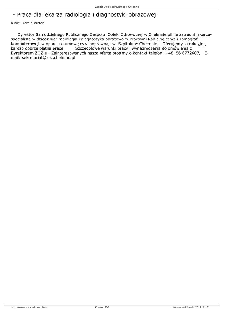 Zespół Opieki Zdrowotnej w Chełmnie - Praca dla lekarza radiologia i diagnostyki obrazowej. Autor: Administrator Dyrektor Samodzielnego Publicznego Zespołu Opieki Zdrowotnej w Chełmnie pilnie zatrudni lekarzaspecjalistę w dziedzinie: radiologia i diagnostyka obrazowa w Pracowni Radiologicznej i Tomografii Komputerowej, w oparciu o umowę cywilnoprawną w Szpitalu w Chełmnie. Oferujemy atrakcyjną bardzo dobrze płatną pracę. Szczegółowe warunki pracy i wynagrodzenia do omówienia z Dyrektorem ZOZ-u. Zainteresowanych nasza ofertą prosimy o kontakt:telefon: +48 56 6772607, Email: [email protected] http://www.zoz.chelmno.pl/zoz Kreator PDF Utworzono 8 March, 2017, 11:52