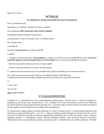 Sygn. akt I C 80/11 WYROK W IMIENIU RZECZYPOSPOLITEJ POLSKIEJ Dnia, 19 kwietnia 2013r. Sąd Rejonowy w Oleśnicy, Wydział I Cywilny w składzie: Przewodniczący SSR Agnieszka Ostrowska-Gołąbek Protokolant Ewelina Grudzień-Wuczkowska po rozpoznaniu w dniu 10 kwietnia 2013r. w Oleśnicy sprawy Przy udziale stron: powód M. S. pozwany Towarzystwo (...) S.A. z/s w W. o zapłatę I. zasądza od strony pozwanej Towarzystwa (...) S.A. z/s w W. na rzecz powódki M. S. kwotę 10.815,20 (dziesięć tysięcy osiemset piętnaście 20/100) złotych wraz z ustawowymi odsetkami liczonymi: - od kwoty 9.123,29zł od dnia 09.02.2011r. do dnia zapłaty; - od kwoty 1.691,91zł od dnia 10.02.2011r. do dnia zapłaty; II. zasądza od strony pozwanej na rzecz powódki kwotę 2.958,00,zł tytułem zwrotu kosztów procesu; III. nakazuje stronie pozwanej aby uiściła na rzecz Skarbu Państwa (Sąd Rejonowy w Oleśnicy) kwotę 692,90zł tytułem wydatków poniesionych tymczasowo przez Skarb Państwa. Z./ 1. kal. 21 dni. 19.04.2013r. Sygn. akt I C 80/11 UZASADNIENIE Powódka M. S., reprezentowana przez profesjonalnego pełnomocnika, wniosła pozew, w którym domagała się zasądzenia od strony pozwanej Towarzystwa (...) S.A. z siedzibą w W. kwoty 10.815 złotych z ustawowymi odsetkami liczonymi od kwoty 9123,29 złotych od dnia 09 lutego 2011 r. i od kwoty 1691,91 złotych od dnia wytoczenia powództwa do dnia zapłaty wraz z kosztami procesu według norm przepisanych. W uzasadnieniu swojego żądania powódka podniosła, iż w dniu 11 sierpnia 2009r. w wyniku kolizji drogowej został uszkodzony pojazd powódki marki (...)o nr rej. (...). Sprawca kolizji posiadał obowiązkowe ubezpieczenie Oc u strony pozwanej. Po zdarzeniu powódka niezwłocznie zgłosiła fakt uszkodzenia auta. W dniu 18 sierpnia 2009r. wykonano oględziny pojazdu, a w późniejszym okresie dokonano kalkulacji szkody , która wyniosła zdaniem towarzystwa ubezpieczeń kwotę 5474,95 złotych i pomimo uznania tej części , odszkodowanie nie zostało wypłacone. Powódka zmuszona była zlecić rzeczoznawcy, na własny koszt, sporządzenie opinii dotyczącej oceny technicznej pojazdu oraz kosztorys naprawy. Według rzeczoznawcy koszt naprawy pojazdu wynosił 16.547,75 złotych i taka kwota powinna zostać wypłacona powódce tytułem odszkodowania. Strona pozwana wypłaciła powódce łączną kwotę 8012,5 złotych. Niniejszym pozwem powódka dochodzi dalszej kwoty tytułem odszkodowania, a nie uznanej przez stronę pozwaną , tj. sumy 8535,25 złotych oraz kosztów opinii-588,04 złotych. Nadto powódka skapitalizowała odsetki za zwłokę, żądając sumy 1691,91 złotych, których zapłaty żąda od chwili wytoczenia o nie powództwa ( art.482§1 k.c.). W odpowiedzi na pozew strona pozwana Towarzystwo (...) S.A. z siedzibą w W., reprezentowana przez profesjonalnego pełnomocnika, wniosła o oddalenie powództwa oraz zasądzenie od powódki kosztów procesu, w tym kosztów zastępstwa procesowego według norm przepisanych. W uzasadnieniu strona pozwana przyznała, iż w dniu 11 sierpnia 2009r. , w którym doszło do zdarzenia komunikacyjnego, z którego powódka wywodzi swoje roszczenie , łączyła ją ze sprawcą zdarzenia obowiązkowa umowa ubezpieczenia odpowiedzialności cywilnej posiadacza pojazdu mechanicznego. Pozwana przyznała również, iż przyjęła zgłoszenie szkody i przeprowadziła stosowne postępowanie likwidacyjne. Decyzja z dnia 20 października 2009r. pozwana przyznała na rzecz powódki kwotę 5474,95 złotych tytułem odszkodowania za uszkodzenie pojazdu, następnie na skutek wniesionych roszczeń pozwana przyznała odszkodowanie w dalszej kwocie 2537,55 złotych. Zdaniem strony pozwanej wypłacona suma odszkodowania w sposób właściwy spełnia charakter kompensacyjny. Ponadto przedstawiona przez powódkę wycena jest niezgodna z oceną techniczną, tj. zakresem uszkodzeń opisanych przez rzeczoznawcę strony pozwanej w trakcie oględzin samochodu. Dodatkowo strona pozwana podniosła, iż wycena ta stanowi wyłącznie dokument prywatny, o pomocniczym znaczeniu, sporządzony wyłącznie na polecenie powódki, pomimo tego, że strona pozwana przedstawiła swoją wiążącą kalkulacją szkody. Sąd ustalił następujący stan faktyczny : W dniu 11 sierpnia 2009r., w wyniku kolizji drogowej, został uszkodzony pojazd należący do powódki M. S.marki (...)o nr rej. (...). Sprawcą kolizji była osoba posiadająca obowiązkowe ubezpieczenie Oc w Towarzystwie (...) S.A.z siedzibą w W.(bezsporne). Powódka niezwłocznie po zdarzeniu zgłosiła u ubezpieczyciela fakt uszkodzenia swojego pojazdu, składając stosowny wniosek o wypłatę odszkodowania. W dniu 18 sierpnia 2009r. pracownik strony pozwanej wykonał oględziny pojazdu. Według załącznika do oceny technicznej (protokołu oględzin)/ kalkulacji z dnia 18 sierpnia 2009r. uszkodzony samochód nie posiadał uszkodzeń nie związanych ze szkodą. Powódka zleciła rzeczoznawcy mgr inż. M. B. na własny koszt sporządzenie opinii dotyczącej oceny technicznej pojazdu oraz kosztorysu naprawy. Według rzeczoznawcy (...) koszt naprawy uszkodzonego pojazdu wyniósł 16.547,75 złotych zgodnie z systemem A.. Powódka na przedmiotową opinię wydatkowała kwotę 588,04 złotych. Dowód: opinia rzeczoznawcy mgr inż. M. B. k-8-21, faktura Vat k-22. Pismem z dnia 18 września 2009r. powódka wezwała pozwane towarzystwo ubezpieczeń o zapłatę kwoty 17.135,79 złotych . Dowód: ostateczne przedsądowe wezwanie do zapłaty k-23. Towarzystwo ubezpieczeń wypłaciło powódce łączną kwotę odszkodowania w wysokości 8012,5 złotych ( 2537,55 złotych oraz 5474,95 złotych) . Dowód: załącznik do oceny technicznej (protokołu oględzin)/kalkulacji k-5, kalkulacja szkody k-6-7, decyzja o przyznaniu odszkodowania k-25 i k-27, kalkulacja szkody k-28-29. W niniejszej sprawie została sporządzona opinia przez biegłego sądowego z zakresu techniki motoryzacyjnej, ruchu d