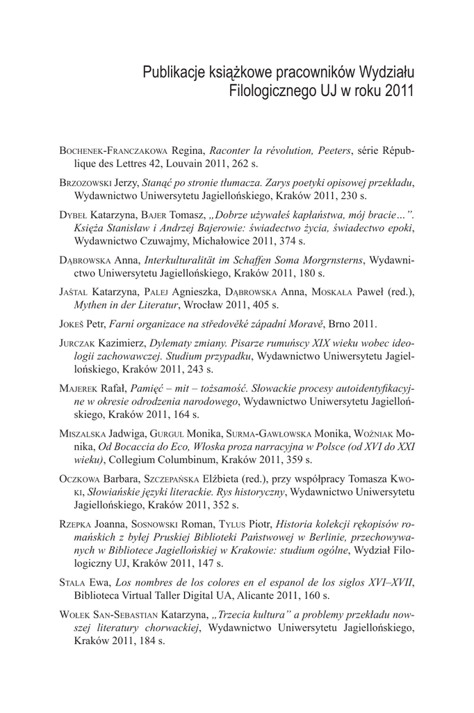 Publikacje książkowe pracowników Wydziału Filologicznego UJ w roku 2011 Bochenek-Franczakowa Regina, Raconter la révolution, Peeters, série République des Lettres 42, Louvain 2011, 262 s. Brzozowski Jerzy, Stanąć po stronie tłumacza. Zarys poetyki opisowej przekładu, Wydawnictwo Uniwersytetu Jagiellońskiego, Kraków 2011, 230 s. Dybeł Katarzyna, Bajer Tomasz, „Dobrze używałeś kapłaństwa, mój bracie…”. Księża Stanisław i Andrzej Bajerowie: świadectwo życia, świadectwo epoki, Wydawnictwo Czuwajmy, Michałowice 2011, 374 s. Dąbrowska Anna, Interkulturalität im Schaffen Soma Morgrnsterns, Wydawnictwo Uniwersytetu Jagiellońskiego, Kraków 2011, 180 s. Jaśtal Katarzyna, Palej Agnieszka, Dąbrowska Anna, Moskała Paweł (red.), Mythen in der Literatur, Wrocław 2011, 405 s. Jokeš Petr, Farní organizace na středověké západní Moravě, Brno 2011. Jurczak Kazimierz, Dylematy zmiany. Pisarze rumuńscy XIX wieku wobec ideologii zachowawczej. Studium przypadku, Wydawnictwo Uniwersytetu Jagiellońskiego, Kraków 2011, 243 s. Majerek Rafał, Pamięć – mit – tożsamość. Słowackie procesy autoidentyfikacyjne w okresie odrodzenia narodowego, Wydawnictwo Uniwersytetu Jagiellońskiego, Kraków 2011, 164 s. Miszalska Jadwiga, Gurgul Monika, Surma-Gawłowska Monika, Woźniak Monika, Od Bocaccia do Eco, Włoska proza narracyjna w Polsce (od XVI do XXI wieku), Collegium Columbinum, Kraków 2011, 359 s. Oczkowa Barbara, Szczepańska Elżbieta (red.), przy współpracy Tomasza Kwoki, Słowiańskie języki literackie. Rys historyczny, Wydawnictwo Uniwersytetu Jagiellońskiego, Kraków 2011, 352 s. Rzepka Joanna, Sosnowski Roman, Tylus Piotr, Historia kolekcji rękopisów romańskich z byłej Pruskiej Biblioteki Państwowej w Berlinie, przechowywanych w Bibliotece Jagiellońskiej w Krakowie: studium ogólne, Wydział Filologiczny UJ, Kraków 2011, 147 s. Stala Ewa, Los nombres de los colores en el espanol de los siglos XVI–XVII, Biblioteca Virtual Taller Digital UA, Alicante 2011, 160 s. Wołek San-Sebastian Katarzyna, „Trzecia kultura” a problemy przekładu nowszej literatury chorwackiej, Wydawnictwo Uniwersytetu Jagiellońskiego, Kraków 2011, 184 s.