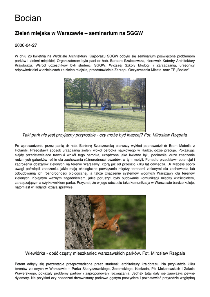 Bocian Zieleń miejska w Warszawie – seminarium na SGGW 2006-04-27 W dniu 26 kwietnia na Wydziale Architektury Krajobrazu SGGW odbyło się seminarium poświęcone problemom parków i zieleni miejskiej. Organizatorem była pani dr hab. Barbara Szulczewska, kierownik Katedry Architektury Krajobrazu. Wśród uczestników byli studenci SGGW, Wyższej Szkoły Ekologii i Zarządzania, urzędnicy odpowiedzialni w dzielnicach za zieleń miejską, przedstawiciele Zarządu Oczyszczania Miasta oraz TP „Bocian”. Taki park nie jest przyjazny przyrodzie - czy może być inaczej? Fot. Mirosław Rzępała Po wprowadzeniu przez panią dr hab. Barbarę Szulczewską pierwszy wykład poprowadził dr Bram Mabelis z Holandii. Przedstawił sposób urządzania zieleni wokół ośrodka naukowego w Hadze, gdzie pracuje. Pokazując slajdy przedstawiające trawniki wokół tego ośrodka, urządzone jako kwietne łąki, podkreślał duże znaczenie rodzimych gatunków roślin dla zachowania różnorodności owadów, w tym motyli. Ponadto przedstawił potencjał i zagrożenia obszarów zielonych na terenie Warszawy, którą już od przeszło kilku lat odwiedza. Dr Mabelis sporo uwagi poświęcił znaczeniu, jakie mają ekologiczne powiązania między terenami zielonymi dla zachowania lub odbudowania ich różnorodności biologicznej, a także znaczenie systemów wodnych Warszawy dla terenów zielonych. Kolejnym ważnym zagadnieniem, jakie poruszył, było budowanie komunikacji między właścicielem, zarządzającym a użytkownikiem parku. Przyznał, że w jego odczuciu taka komunikacja w Warszawie bardzo kuleje, natomiast w Holandii działa sprawnie. . Wiewiórka - dość częsty mieszkaniec warszawskich parków. Fot. Mirosław Rzępała Potem odbyły się prezentacje przeprowadzone przez studentki architektury krajobrazu. Na przykładzie kilku terenów zielonych w Warszawie – Parku Skaryszewskiego, Żeromskiego, Kaskada, Pól Mokotowskich i Zakola Wawerskiego, pokazały problemy parków i zaproponowały rozwiązania. Jednak tutaj dały się zauważyć pewne dylematy. Na przykład czy obsadzać drzewostany parkowe gęstym poszyciem i pozostawiać przyrodzie względną swobodę, zwiększając tym samym ilość siedlisk dla ptaków i innych zwierząt, ale ujmując spacerowiczom poczucie bezpieczeństwa. Czy też może utrzymywać przejrzyste parki, ubogie w poszycie, a zatem i w gatunki zwierząt, ale stwarzające poczucie bezpieczeństwa. Kolejny wykład poprowadził prof. Maciej Luniak. Na przykładzie parków w Berlinie przedstawił znaczenie, jakie ma pozostawianie nie zagrabionych liści pod drzewami i krzewami dla różnorodności dzikiej fauny i flory. Ponadto ukazał dużą ekologiczną wartość spróchniałych pni i gałęzi, które można wykorzystać dodatkowo jako ogrodzenia dla miejsc, w których trzeba zmniejszyć penetrację, a zarazem stwarzających kolejne nowe siedliska dla wielu gatunków, na przykład grzybów. Podkreślił także, że takie rozwiązanie pozwala oszczędzić pieniądze na wywóz, składowanie i ewentualne rozdrabnianie odpadów drzewnych. Również stare drzewa według profesora są nie zastąpione pod względem ekologicznym, ponieważ stwarzają siedliska dla wielu organizmów, od ptaków dziuplaków poczynając, a na bezkręgowcach i grzybach kończąc. Zastąpienie wyciętych dziesięciu starych, dziuplastych drzew posadzeniem tysiąca młodych dla przyrody stanowi bardzo znikomą rekompensatę, albowiem prze kilkadziesiąt lat takie drzewa są praktycznie wyłączone z funkcji ekologicznych, jakie pełnią stare osobniki. Kwiczoł. Fot. Mirosław Rzępała Kolejnym problemem w gospodarowaniu parkami Warszawy, jaki przedstawił prof. Luniak, jest zbyt częste i dokładne wykaszanie trawy. Nawet krzewy są tak przycinane, by pod nimi mogły bez problemu pracować kosiarki. W parkach Berlina pod drzewami i krzewami pozostawia się przestrzeń nie wykaszaną. Dzięki czemu zachowane są refugia, w których może przetrwać drobna fauna. Mniejsza częstotliwość wykaszania trawy pozwala na większą różnorodność gatunkową roślin zielnych. W Berlinie trawniki parkowe są często podlewane, natomiast w Warszawie pomimo o wiele niższej sumy opadów i uboższej sieci hydrologicznej, zamiast podlewać, często się je kosi. Na koniec profesor zaznaczył, że jest możliwość pogodzenia oczekiwań różnych użytkowników parków i ochrony dzikiej fauny. Ostatni wykład poprowadził dr Piotr Sikorski. Zaznaczył, że dla różnorodności biologicznej ma znaczenie również przestrzenny układ drzew i krzewów. Na przykładzie Parku Bródnowskiego, gdzie drzewa posadzone są w równych rzędach tak, że może między nimi przejeżdżać traktor z kosiarką, pokazał jak ubogie jest takie siedlisko. Gleba jest tam ubita i nie wiele gatunków roślin i zwierząt jest w stanie się tam utrzymać. Przedstawił także wyniki badać ukazujące spadek różnorodności biologicznej parków Warszawy na skutek zwiększenia częstości koszenia traw. Szpak. Fot. Mirosław Rzępała Omówił również stare założenia parkowe, które mają znacznie większą różnorodność biologiczną niż nowo posadzone parki, a to ze względu na ich biologicznie dłuższą ciągłość. Jednak nawet stare parki, w porównaniu z okolicznymi rezerwatami leśnymi, ustępują w liczbie gatunków roślin, a to dlatego że sukcesja roślin leśnych jest bardzo powolna i zwykła ścieżka może być dla niej poważna przeszkodą. Autor przedstawił także dylemat, na ile utrzymywać albo przywracać historyczne założenia parkowe, by nie uszczuplić zasobów przyrody oraz na ile pozwolić przyrodzie na swobodę, by jednocześnie park nie przestał być parkiem i stał się lasem. Prelegent zaznaczył również, że współcześnie obserwuje się dwa bardzo różne nurty w tworzeniu nowych parków. Jeden to nurt postmodernistyczny, gdzie parki pełnią rolę wyłącznie wizualną. Efektowna roślinno