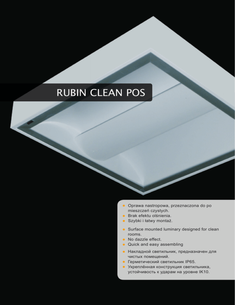 Oprawy clean • Clean luminaires • Светильники для чистых помещений RUBIN CLEAN POS 5 Oprawa nastropowa, przeznaczona do po • mieszczeń czystych. efektu olśnienia. • Brak • Szybki i łatwy montaż. Surface mounted luminary designed for clean • rooms. dazzle effect. • No Quick and easy assembling • Накладной светильник, предназначен для • чистых помещений. светильник IP65. • Герметический Укреплённая конструкция светильника, • устойчивость к ударам на уровне IK10. 5 .1 Oprawy clean • Clean luminaires • Светильники для чистых помещений RUBIN CLEAN POS RUBIN CLEAN POS Oprawa przeznaczona do montażu nastropowego do świetlówek kompaktowych TC-L. Kaseton oprawy wykonany z blachy stalowej, lakierowanej proszkowo na kolor biały. Szyba hartowana montowana w ramce aluminiowej. Układ optyczny składa się z białych odbłyśników i przesłony wykonanej z perforowanej blachy stalowej lakierowanej proszkowo na kolor biały. Konstrukcja oprawy zapobiega powstawaniu efektu olśnienia, bezpośredniego poprzez przesłonięcie źródła światła, półprzepuszczalną przesłoną. Oprawa rekomendowana do pomieszczeń typu: sale chorych, gabinety lekarskie. Akcesoria: elektroniczne układy stabilizująco-zapłonowe z możliwością regulacji strumienia świetlnego. Surface mounted luminary for TC-L compact fluorescents. Luminary coffer made from steel sheet, powder coated in white. Hardened glass in aluminum frame. Optical system consists of white reflectors and screen made from perforated steel sheet powder coated in white. Luminary design prevents from dazzle effect by covering directly the light source with semi permeable screen. Luminary recommended for: wards and consulting rooms. Accessories: electronic stabilizing and ignition system with possible light stream regulation. 5 5 Светильник предназначен для установки для установки на потолок с использованием люминесцентных ламп типа T5 . Корпус светильника изготовлен из стали, покрашен в белый цвет порошковым методом. Светильник устойчив к ударам силок 40Дж. Светильник рекоммендуется к применению в местах повышенного риска повреждения и повышенной влажности. Комплектующие: ЭПРА с функцией регулировки светового потока. .2 Oprawy clean • Clean luminaires • Светильники для чистых помещений RUBIN CLEAN POS RUBIN CLEAN POS RUBIN CLEAN POSREDNI 2X55W TCL SPE SH E IP65 RUBIN CLEAN POSREDNI 2X55W TCL SPE SH E IP65 08 Wymiary / Dimensions / Размеры A B h (mm)(mm)(mm) 2x36W 620 620 100 2x40W 620 620 100 2x55W 620 620 100 1x14W 620 620 100 1x24W 620 620 100 2x14W 620 620 100 2x24W 620 620 100 Opcja z rastrem With louvre/ Вариант с растром 3x36W 3x40W 3x55W 3x14W 3x24W 620 620 620 620 620 620 620 620 620 620 120 120 120 120 120 RUBIN CLEAN POS RUBIN CLEAN POS RUBIN CLEAN POS RUBIN CLEAN POS RUBIN CLEAN POS RUBIN CLEAN POS RUBIN CLEAN POS 2x36W 2x40W 2x55W 1x14W 1x24W 2x14W 2x24W TC-L TC-L TC-L T5 T5 T5 T5 2G11 2G11 2G11 G5 G5 G5 G5 9,20 9,20 9,20 9,20 9,20 9,20 9,20 TC-L TC-L TC-L T5 T5 2G11 2G11 2G11 G5 G5 9,30 9,30 9,30 9,30 9,30 5 Opcja z rastrem With louvre/ Вариант с растром RUBIN CLEAN POS RUBIN CLEAN POS RUBIN CLEAN POS RUBIN CLEAN POS RUBIN CLEAN POS 3x36W 3x40W 3x55W 3x14W 3x24W Sugerowana barwa światła: 830/840/940 Suggested colour of the light: 830/840/940 Рекомендуемая цветовая температура: 830/840/940 Opcje oprawy/Luminaire options/ Характеристика светильника Przesłony / Diffuser/Рассеиватели: Rastry / Louver/ Оптика (зеркальные решётки): SH szyba hartowana tempered glass / стекло калёное PPAR podwójna parabola double parabolic louver / парабола SL szyba laminowana laminated glass / стекло ламинированное PPARM podwójna parabola mat mat double parabolic louver / парабола матовая PC-T przesłona przezroczysta PC PC transparent diffuser / рассеиватель из поликарбоната опаловый Stateczniki / Electronic control gear / Пускорегулирующая аппаратура: E statecznik elektroniczny electronic control gear / ЭПРА ED statecznik elektroniczny DIM 1-10V DIM 1-10V electronic control gear / ЭПРА DIM 1-10V EDD statecznik elektroniczny DIM DALI DIM DALI electronic control gear / ЭПРА DIM DALI EDT statecznik elektroniczny TO UCH DIM TOUCH DIM electronic control gear / ЭПРА TOUCH DIM EDS statecznik elektroniczny DIM DSI DIM DSI electronic control gear / ЭПРА DIM DSI UWAGA!!! Dane techniczne mogą ulec zmianie. Data ostatniej aktualizacji 23.12.2013r. Inne opcje oprawy dostępne na indywidualne zapytanie. WARNING! Technical data may be changed. Last updated 23.12.2013. Other options of the luminaire available on request. ВНИМАНИЕ! Технические характеристики могут изменится. Дата последнего обновления 23.12.2013. Реализация индивидуального варианта возможна по запросу. 5 .3 Oprawy clean • Clean luminaires • Светильники для чистых помещений „Stosowanie opraw oświetleniowych firmy LUXIONA POLAND” Oprawy oświetleniowe firmy LUXIONA POLAND przeznaczone są do pracy w standardowych warunkach, z wyjątkiem opraw o przeznaczeniu specjalnym. Warunki standardowe charakteryzuje temper