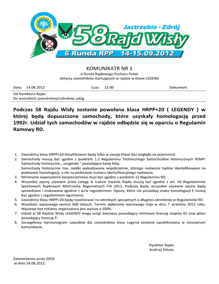 KOMUNIKATR NR 1 6 Runda Rajdowego Pucharu Polski dotyczy zawodników startujących w rajdzie w Klasie LEGEND Data: 14.08.2012 Czas: 12.00 Dokument: Od Dyrektora Rajdu Do wszystkich zawodników/członków załóg Podczas 58 Rajdu Wisły zostanie powołana klasa HRPP+20 ( LEGENDY ) w której będą dopuszczone samochody, które uzyskały homologację przed 1992r. Udział tych samochodów w rajdzie odbędzie się w oparciu o Regulamin Ramowy RD. 1. Zawodnicy klasy HRPP+20 klasyfikowani będą tylko w swojej klasie bez względu na pojemność. 2. Samochody muszą być zgodne z punktem 1.2 Regulaminu Technicznego Samochodów Historycznych RSMP: Samochody historyczne „ oryginały ” posiadające kartę http, Samochody historyczne tzw. repliki wybudowane współcześnie, którego nadwozie będzie identyfikowane na podstawie homologacji, a nie na podstawie numeru identyfikacyjnego nadwozia. 3. Minimalne wyposażenie bezpieczeństwa musi być zgodne z punktem 12 Regulaminu RD. 4. Wszystkie opony używane przez załogę w trakcie trwania Rajdu muszą być zgodne z art. 50 Regulaminów Sportowych Rajdowych Mistrzostw Regionalnych FIA 2012. Podczas Rajdu wszystkie używane opony będą sprawdzane i znakowane zgodnie z w/w regulaminem. Opony, które nie posiadają znaku homologacji E muszą być zgodne z regulaminem ogumienia. 5. Zawodnicy klasy HRPP+20 będą rywalizować na odcinkach specjalnych o długości określonej w Regulaminie RD. 6. Wysokość wpisowego wynosi 600 złotych. Termin wpłacenia wpisowego mija w dniu 7 września 2012 roku. Wpisowe bez reklamy organizatora jest wyższe o 100%. 7. Udział w 58 Rajdzie Wisły LEGENDY mogą wziąć kierowcy posiadający minimum licencję stopnia R2 oraz piloci posiadający licencję P. 8. Szczegółowy harmonogram zawodów dla zawodników klasy Legend zostanie opublikowany w stosownym komunikacie. Dyrektor Rajdu Andrzej Szkuta Zatwierdzono przez GKSS w dniu 14.08.2012.
