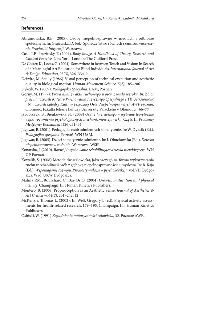 252 Mirosław Górny, Jan Konarski, Ludmila Miklánková References Abramowska, B.E. (2005). Osoby niepełnosprawne w mediach i odbiorze społecznym. In: Grajewska, D. (ed.) Społeczeństwo równych szans. Stowarzyszenie Przyjaciół Integracji. Warszawa Cash T.F., Pruzinsky T. (2004). Body Image. A Handbook of Theory, Research and Clinical Practice. New York–London: The Guilford Press. De Coster, K., Loots, G. (2004). Somewhere in between Touch and Vision: In Search of a Meaningful Art Education for Blind Individuals. International Journal of Art & Design Education, 23(3), 326–334, 9 Deirdre, M. Scully (1986). Visual perception of technical execution and aesthetic quality in biological motion. Human Movement Science, 5(2), 185–206 Dykcik, W. (2009). Pedagogika Specjalna. UAM, Poznań Górny, M. (1997). Próba analizy aktu ruchowego u osób z wadą wzroku. In: Zbiór prac nauczycieli Katedry Wychowania Fizycznego Specjalnego FTK UP Olomouc i Nauczycieli katedry Kultury Fizycznej Osób Niepełnosprawnych AWF Poznań. Olomouc: Fakulta telesne kultury Univerzity Palackeho v Olomouci, 66–77 Izydorczyk, B., Bieńkowska, N. (2008) Obraz Ja cielesnego – wybrane teoretyczne wątki rozumienia psychologicznych mechanizmów zjawiska. Część II. Problemy Medycyny Rodzinnej; 1(26), 51–54 Jugowar, B. (2001). Pedagogika osób odmiennych somatycznie. In: W. Dykcik (Ed.). Pedagogika specjalna. Poznań: WN UAM. Jugowar, B. (2005). Dzieci somatycznie odmienne. In: I. Obuchowska (Ed.). Dziecko niepełnosprawne w rodzinie. Warszawa: WSiP. Konarska, J. (2010). Rozwój i wychowanie rehabilitujące dziecka niewidzącego. WN UP Poznań. Kowalik, S. (2008) Metoda dwuczłowieka, jako szczególna forma wykorzystania ruchu w rehabilitacji osób z głęboką niepełnosprawnością umysłową. In: B. Kaja (Ed.). Wspomaganie rozwoju. Psychostymulacja – psychokorekcja, vol. VII. Bydgoszcz: Wyd. UKW, Bydgoszcz. Malina RM., Bourchard C., Bar-Or O. (2004) Growth, maturation and physical activity. Champaign, Il.: Human Kinetics Publishers. Montero, B. (2006) Proprioception as an Aesthetic Sense. Journal of Aesthetics & Art Criticism, 64(2), 231–242, 12 McKenzie, Thomas L. (2002): In: Welk Gregory J. (ed). Physical activity assessments for health-related research, 179–195. Champaign, Ill.: Human Kinetics Publishers. Osiński, W. (1991) Zagadnienia motoryczności człowieka, 32. Poznań: AWF,. From Studies on Aesthetics of Movement in People with Visual Impairment 253 Ossowski, R. (2005). Wychowanie dzieci niesprawnych sensorycznie. In I. Obuchowska (Ed.). Dziecko niepełnosprawne w rodzinie. Warszawa: WSiP. Pomeroy, V.M., Pramanik, A., Sykes, L., Richards, J., Hill, E. (2003). Agreement between physiotherapists on quality of movement rated via videotape Clinical Rehabilitation; 1(7), 264–272. Ponchillia, S.V., Powell, L.L., Felski, K.A., & Nicklawski, M.T. (1992). The effectiveness of aerobic exercise instruction for totally blind women. Journal of Visual Impairment & Blindness, 86, 174–177. Westbrook, M.T., Legge, V., & Pennay, M. (1993). Attitudes towards disabilities in a multicultural society. Social Science and Medicine, 36, 615–623. Acknowledgments The research was supported and financed by the grant MC IEF – 2007–041326 – AESTH-PRO.
