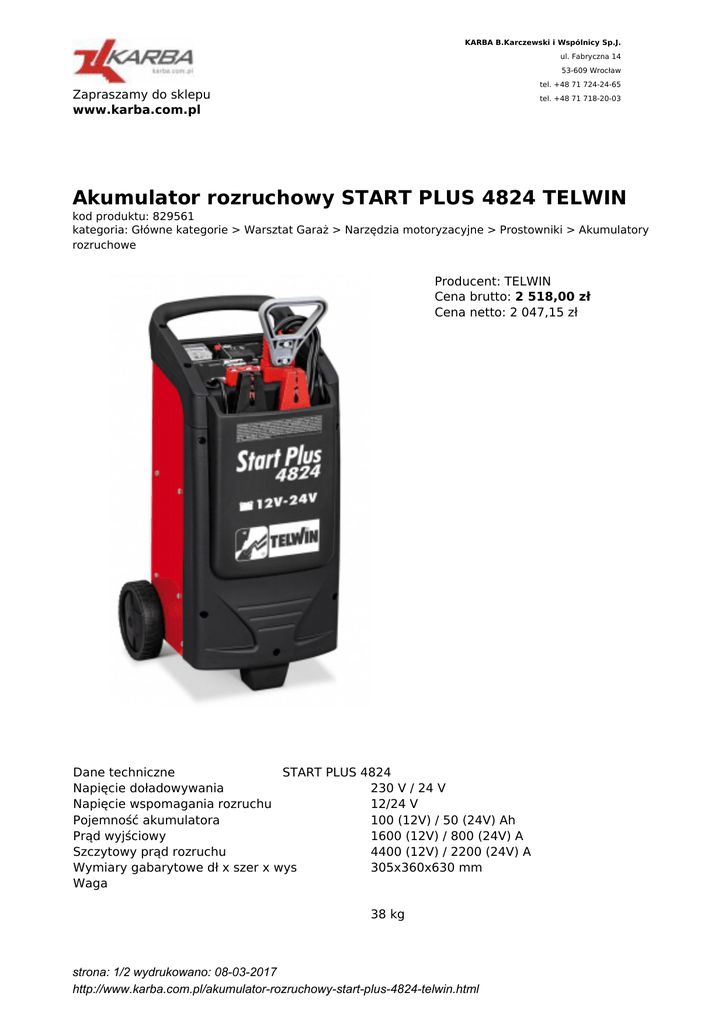 KARBA B.Karczewski i Wspólnicy Sp.J. ul. Fabryczna 14 53-609 Wrocław tel. +48 71 724-24-65 Zapraszamy do sklepu www.karba.com.pl tel. +48 71 718-20-03 Akumulator rozruchowy START PLUS 4824 TELWIN kod produktu: 829561 kategoria: Główne kategorie > Warsztat Garaż > Narzędzia motoryzacyjne > Prostowniki > Akumulatory rozruchowe Producent: TELWIN Cena brutto: 2 518,00 zł Cena netto: 2 047,15 zł Dane techniczne START PLUS 4824 Napięcie doładowywania 230 V / 24 V Napięcie wspomagania rozruchu 12/24 V Pojemność akumulatora 100 (12V) / 50 (24V) Ah Prąd wyjściowy 1600 (12V) / 800 (24V) A Szczytowy prąd rozruchu 4400 (12V) / 2200 (24V) A Wymiary gabarytowe dł x szer x wys 305x360x630 mm Waga 38 kg strona: 1/2 wydrukowano: 08-03-2017 http://www.karba.com.pl/akumulator-rozruchowy-start-plus-4824-telwin.html Akumulator do wspomagania rozruchu pojazdów i maszyn zasilanych napięciem 12V i 24V. Umożliwia rozruch motocykli, samochodów osobowych, dostawczych i ciężarowych, maszyn rolniczych i generatorów prądu. Jest bezpieczny dla układów elektronicznych w samochodzie (ABS, poduszki powietrzne). Funkcja PODTRZYMANIA uaktywnia się poprzez podłączenie akumulatora STARTPLUS 4824 do klem samochodu. Umożliwia odłączenie i wymianę akumulatora bez utraty ustawień urządzeń elektronicznych w samochodzie. Umożliwia wielokrotny rozruch pojazdu bez ładowania. Może służyć jako źródło zasilania 12V i 24V. Może być doładowywany z 230V za pomocą dołączonego zasilacza lub z gniazda zapalniczki samochodowej (tylko o napięciu 24V). Miernik napięcia na akumulatorze. Cena urządzenia z przewodami do wspomagania rozruchu, zasilaczem sieciowym, podłączeniem do gniazda zapalniczki samochodowej. Gwarancja 12 miesięcy. *Przy zakupie na Fakturę VAT gwarancja 1 rok strona: 2/2 wydrukowano: 08-03-2017 http://www.karba.com.pl/akumulator-rozruchowy-start-plus-4824-telwin.html