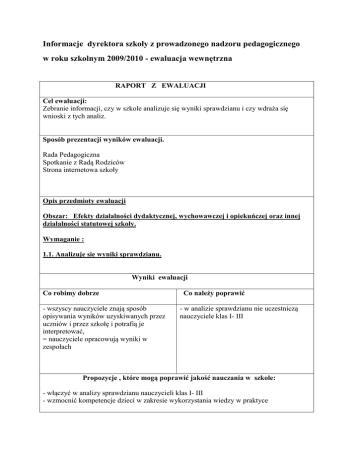 Informacje dyrektora szkoły z prowadzonego nadzoru pedagogicznego w roku szkolnym 2009/2010 - ewaluacja wewnętrzna RAPORT Z EWALUACJI Cel ewaluacji: Zebranie informacji, czy w szkole analizuje się wyniki sprawdzianu i czy wdraża się wnioski z tych analiz. Sposób prezentacji wyników ewaluacji. Rada Pedagogiczna Spotkanie z Radą Rodziców Strona internetowa szkoły Opis przedmioty ewaluacji Obszar: Efekty działalności dydaktycznej, wychowawczej i opiekuńczej oraz innej działalności statutowej szkoły. Wymaganie : 1.1. Analizuje sie wyniki sprawdzianu. Wyniki ewaluacji Co robimy dobrze - wszyscy nauczyciele znają sposób opisywania wyników uzyskiwanych przez uczniów i przez szkołę i potrafią je interpretować, = nauczyciele opracowują wyniki w zespołach Co należy poprawić - w analizie sprawdzianu nie uczestniczą nauczyciele klas I- III Propozycje , które mogą poprawić jakość nauczania w szkole: - włączyć w analizy sprawdzianu nauczycieli klas I- III - wzmocnić kompetencje dzieci w zakresie wykorzystania wiedzy w praktyce RAPORT Z EWALUACJI Cel ewaluacji: Poznanie poziomu pracy świetlicy szkolnej oraz potrzeb dzieci i rodziców. Sposób prezentacji wyników ewaluacji. Rada Pedagogiczna Spotkanie z Radą Rodziców Strona internetowa szkoły Opis przedmioty ewaluacji Obszar: Funkcjonowanie szkoły w środowisku lokalnym. Wymaganie : 3.4. Rodzice są partnerami szkoły. Wyniki ewaluacji Co robimy dobrze - dzieci czują się bezpiecznie w świetlicy, - nauczyciele dobrze wykonują swoje obowiązki, - prowadzone są różnorodne formy zajęć, - realizowane są ciekawe programy edukacyjne Co należy poprawić - stworzyć dodatkowe pomieszczenie dla dzieci, - dokonać podziału wiekowego dzieci - zmienić stosunek niektórych nauczycieli do dzieci Propozycje , które mogą poprawić pracę świetlicy szkoły: - utworzyć dodatkową świetlicę, - dokonać podziału wiekowego uczniów, - opracować harmonogram pracy wychowawców świetlicy zgodny z podziałem uczniów RAPORT Z EWALUACJI Cel ewaluacji: Dostarczenie wiedzy, czy organizowanie uroczystości szkolnych wpływa na poprawę zachowania uczniów. Sposób prezentacji wyników ewaluacji. Rada Pedagogiczna Spotkanie z Radą Rodziców Strona internetowa szkoły Opis przedmioty ewaluacji Obszar: Efekty działalności dydaktycznej, wychowawczej i opiekuńczej oraz innej działalności statutowej szkoły. Wymaganie : 1.4. Respektowane są normy społeczne. Wyniki ewaluacji Co robimy dobrze - wszyscy nauczyciele chętnie organizują uroczystości szkolne, - uczniowie są zawsze włączani w przygotowanie uroczystości, - wszyscy uczniowie uczestniczą w uroczystościach szkolnych, Co należy poprawić - zastosować podział wiekowy uczniów na uroczystościach, - pracować nad zachowaniem uczniów podczas uroczystości, - włączyć w pracę porządkową podczas uroczystości SU, Propozycje , które mogą poprawić dyscyplinę uczniów w szkole: - włączyć w prace porządkową SU, - dokonać podziału wiekowego uczniów,
