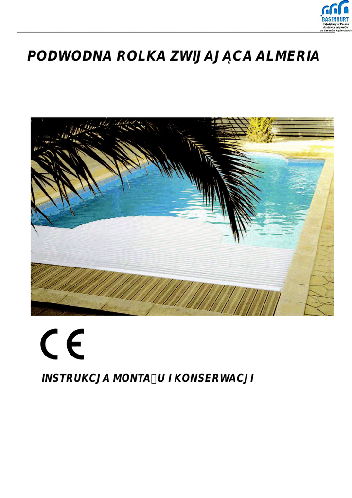 PODWODNA ROLKA ZWIJAJĄCA ALMERIA INSTRUKCJA MONTAŻU I KONSERWACJI SPIS TREŚCI - Personel i materiały wymagane do rozładunku i montażu Strona 2 - Komponenty rolki zwijającej Almeria Strona 3 - Roboty montażowe basenu bez ścianki działowej Strona 4 - Schemat umieszczenia elementów Strona 5 - Ustawianie mechanizmu jezdnego Strona 6 - Zapewnienie wodoszczelności Strona 6 - Mocowanie wału silnika do rurki w ścianie Strona 7 - Mocowanie wału rolki Strona 8 - Mocowanie wału po stronie łożyska Strona 8 - Podłączanie wału silnika i wału rolki Strona 8 - Mocowanie uszczelnienia mechanicznego Strona 9 - Montaż paneli Strona 10 - Kierunek paneli Strona 11 - Łączenie paneli Strona 11 - Montaż paneli z wtopionymi nasadkami Strona 12 - Ustawianie schodka Strona 13 - Mocowanie odciążnika do belki Strona 14 - Mocowanie przekładni silnika Strona 15 - Instalacja elektryczna Strona 15 - Schemat instalacji Strona 16 - Regulacja przełącznika krańcowego Strona 17 - Regulacja otwierania i zamykania żaluzji Strona 17 - Wymiary żaluzji po nawinięciu na wałek Strona 18 1 ROZŁADUNEK LUB NARZĘDZIA WYMAGANE PODCZAS MONTAŻU Wiertarka i wiertła do betonu Ø6 i Ø10 Śrubokręty płaskie, poziomica Klucz 10-13-17 Szczypce Przyrządy do usuwania izolacji Klucz imbusowy 5-6-17 Młotek Standardowa taśma pomiarowa (1 m długości) Smar Piła do metalu PRZEWIDYWANY CZAS MONTAŻU PRZEWIDYWANY CZAS ROZŁADUNKU 0 h 30 10 h 00 2 KOMPONENTY ROLKI ZWIJAJĄCEJ ALMERIA Zestaw zanurzeniowy (jeśli wymagany) Mechanizm zwijania Segment paneli i pasków Instrukcja montażu, obsługi, konserwacji i zabezpieczania przed mrozem 3 ROBOTY MONTAŻOWE BASENU BEZ ŚCIANKI DZIAŁOWEJ Poziom ściany Mocowanie wkładki Poziom wody Zgarniacz Belka Odpływ przelewowy Pokrywa Główny odpływ Otwór 750 x 750 z dotlenianiem i usuwaniem wody Uwaga: Silnik lub komorę można zamontować po lewej lub po prawej stronie o Wymagany kąt 90 ) Zgarniacz Główny odpływ W przypadku użycia paneli słonecznych, należy sprawdzić, czy na schodkach znajduje się dysza Zgarniacz 4 SCHEMAT UMIESZCZENIA ELEMENTÓW Widok od strony A Widok od strony F Wymagany kąt prosty Wymiar X Wymagane wyrównanie w płaszczyźnie pionowej Wymagany odpływ przelewowy Wymagany regulator poziomu Wymagany kąt prosty A Wbudowane części podparcia belki F Wbudowane podparcie łożyskowania WSKAZÓWKA Po wsunięciu należy pamiętać o nałożeniu kleju na brzegu basenu, uszczelnienie podpory łożyska oraz uszczelnienie kanału kablowego. Wymiar X: Zależny od długości basenu, rodzaju profili żaluzji i średnicy żaluzji po zwinięciu. Patrz osobny schemat. 5 USTAWIENIE MECHANIZMU JEZDNEGO Rowek klinowy Łożysko Ogranicznik łożyska ze stali nierdzewnej Uszczelki Podpora silnika silnik Wbudowana część Basen Płyta mocująca paska Kanał kablowy w ścianie Komora silnika Wał rolki Wał Wał O30 Prowadnica silnik Ściana komory silnika Podpora belki Ściana basenu Ściana basenu Belka Łożysko ZAPEWNIENIE WODOSZCZELNOŚCI 1: Sprawdzić, czy uszczelka znajduje się pod prowadnicą. 2: Rozpocząć napełnianie basenu. Przerwać napełnianie wodą przy poziomie wody 10 cm od krawędzi. 3: Zaznaczyć pod prowadnicą, po czym przewiercić dwa otwory, aby można było ustawić wał. Prowadnica Uszczelnienie Wsunięta część 6 ZAPEWNIENIE WODOSZCZELNOŚCI 1: Sprawdzić, czy uszczelka znajduje się za prowadnicą. 2: Rozpocznąć napełnianie basenu. Przerwać napełnianie basenu przy poziomie wody 10 cm poniże krawędzi. 3: Zaznaczyć, po czym przewiercić pod prowadnicą cztery otwory o średnicy 8 mm. 4: Przykleić uszczelkę o średnicy 1 mm za przednim kołnierzem. 5: Zamocować kołnierz, za pomocą czterech śrub o średnicy 8 mm. 6: Wyciąć prowadnicę na środku kołnierza. Prowadnica Rurka w ścianie Ściana basenu Strona Silnika Uszczelnienie rurki w ścianie Strona basenu Kołnierz kanału kablowego w ścianie Uszczelnienie rurki w ścianie MOCOWANIE WAŁU SILNIKA DO RURKI W ŚCIANIE 1: Usunąć ochronny klej z rurki w ścianie po stronie sklepienia obudowy silnika. 2: Sprawdzić, czy w otworze rurki w ścianie nie ma żadnych obcych przedmiotów, oraz, czy wewnętrznapowierzchnia jest czysta. 3: Włożyć wał po wcześniejszym oczyszczeniu i nasmarowaniu smarem, od strony basenu w kierunku komory obudowy silnika, z rowkiem klinowym skierowanym do przodu. Ściana basenu Rurka w ścianie Strona basenu Rowek klinowy Strona Silnika Kierunek wsuwania wału napędu do rurki w ścianie 7 MOCOWANIE WAŁU ROLKI 1: Obniżyć wał i umieścić w komorze. 2: Ustawić wał poziomo, zachowując ostrożność, aby uniknąć uszkodzenia powłoki wierzchniej basenu. MOCOWANIE WAŁU PO STRONIE ŁOŻYSKA 1: Przykleić uszczelkę za ogranicznikiem łożyska. 2: Przełożyć dwa sworznie z łbami sześciokątnymi i podkładkami przez: Łożysko Ogranicznik łożyska Uszczelnienie 3: Wkręcić dwie śruby przez prowadnicę, po przewierceniu. Uwaga: Należy sprawdzić, czy wał rolki znajduje się pod kątem 90 stopni do ścianek po podłączeniu rolki z wałem silnika po przeciwnej stronie. M10x70 + gładka podkładka Wał O30 Prowadnica Nierdzewny stalowy ogranicznik łożyska Uszczelka łożyska Wsunięta część Wał rolki Łożysko Sworzeń O 8mm PODŁĄCZANIE WAŁU SILNIKA I WAŁU ROLKI 1: Wsunąć wał silnika do basenu, umieszczając go w miejscu sprzęgu oraz zamontować za pomcą sworzeni ze stali nierdzewnej 8x6 mm oraz podkładek kontrujących. 2: Sprawdzić, czy zachowany jest kwadratowy kształt wału rolki lub kielicha podczas zwijania. Jeśli konieczne, wyregulować poziome przesunięcie łożyska, po czym dokręcić dwa sześciokątne wkręty łożyska. Śruba M8 x60 Wał rolki Gładka podkładka Rurka w ścianie Nakrętka M8 Basen Basen 8 MOCOWANIE USZCZELNIENIA MECHANICZNEGO 1: Sprawdzić, czy część tylnia uszczelnienia mechanicznego nie jest uszkodzona oraz, czy jest czysta .. 2: Wsunąć pierścień do wału rolki. UWAGA
