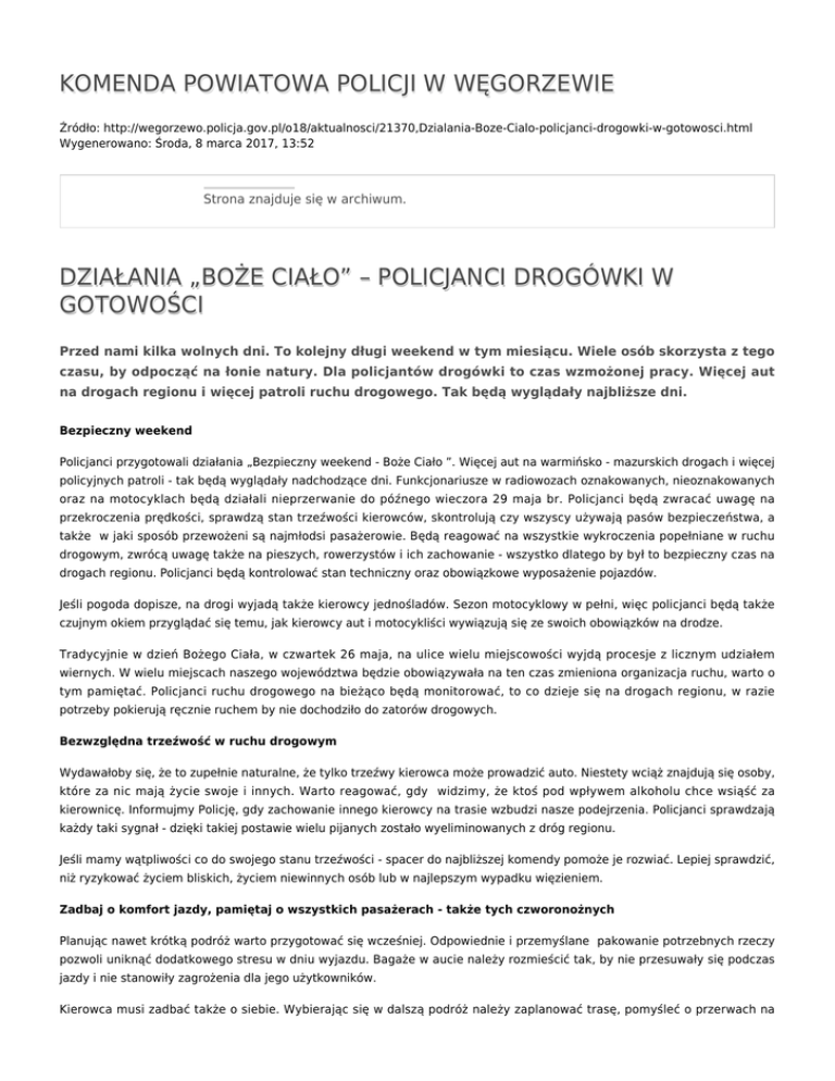 KOMENDA POWIATOWA POLICJI W WĘGORZEWIE Źródło: http://wegorzewo.policja.gov.pl/o18/aktualnosci/21370,Dzialania-Boze-Cialo-policjanci-drogowki-w-gotowosci.html Wygenerowano: Środa, 8 marca 2017, 13:52 Strona znajduje się w archiwum. DZIAŁANIA „BOŻE CIAŁO” – POLICJANCI DROGÓWKI W GOTOWOŚCI Przed nami kilka wolnych dni. To kolejny długi weekend w tym miesiącu. Wiele osób skorzysta z tego czasu, by odpocząć na łonie natury. Dla policjantów drogówki to czas wzmożonej pracy. Więcej aut na drogach regionu i więcej patroli ruchu drogowego. Tak będą wyglądały najbliższe dni. Bezpieczny weekend Policjanci przygotowali działania „Bezpieczny weekend - Boże Ciało ”. Więcej aut na warmińsko - mazurskich drogach i więcej policyjnych patroli - tak będą wyglądały nadchodzące dni. Funkcjonariusze w radiowozach oznakowanych, nieoznakowanych oraz na motocyklach będą działali nieprzerwanie do późnego wieczora 29 maja br. Policjanci będą zwracać uwagę na przekroczenia prędkości, sprawdzą stan trzeźwości kierowców, skontrolują czy wszyscy używają pasów bezpieczeństwa, a także w jaki sposób przewożeni są najmłodsi pasażerowie. Będą reagować na wszystkie wykroczenia popełniane w ruchu drogowym, zwrócą uwagę także na pieszych, rowerzystów i ich zachowanie - wszystko dlatego by był to bezpieczny czas na drogach regionu. Policjanci będą kontrolować stan techniczny oraz obowiązkowe wyposażenie pojazdów. Jeśli pogoda dopisze, na drogi wyjadą także kierowcy jednośladów. Sezon motocyklowy w pełni, więc policjanci będą także czujnym okiem przyglądać się temu, jak kierowcy aut i motocykliści wywiązują się ze swoich obowiązków na drodze. Tradycyjnie w dzień Bożego Ciała, w czwartek 26 maja, na ulice wielu miejscowości wyjdą procesje z licznym udziałem wiernych. W wielu miejscach naszego województwa będzie obowiązywała na ten czas zmieniona organizacja ruchu, warto o tym pamiętać. Policjanci ruchu drogowego na bieżąco będą monitorować, to co dzieje się na drogach regionu, w razie potrzeby pokierują ręcznie ruchem by nie dochodziło do zatorów drogowych. Bezwzględna trzeźwość w ruchu drogowym Wydawałoby się, że to zupełnie naturalne, że tylko trzeźwy kierowca może prowadzić auto. Niestety wciąż znajdują się osoby, które za nic mają życie swoje i innych. Warto reagować, gdy widzimy, że ktoś pod wpływem alkoholu chce wsiąść za kierownicę. Informujmy Policję, gdy zachowanie innego kierowcy na trasie wzbudzi nasze podejrzenia. Policjanci sprawdzają każdy taki sygnał - dzięki takiej postawie wielu pijanych zostało wyeliminowanych z dróg regionu. Jeśli mamy wątpliwości co do swojego stanu trzeźwości - spacer do najbliższej komendy pomoże je rozwiać. Lepiej sprawdzić, niż ryzykować życiem bliskich, życiem niewinnych osób lub w najlepszym wypadku więzieniem. Zadbaj o komfort jazdy, pamiętaj o wszystkich pasażerach - także tych czworonożnych Planując nawet krótką podróż warto przygotować się wcześniej. Odpowiednie i przemyślane pakowanie potrzebnych rzeczy pozwoli uniknąć dodatkowego stresu w dniu wyjazdu. Bagaże w aucie należy rozmieścić tak, by nie przesuwały się podczas jazdy i nie stanowiły zagrożenia dla jego użytkowników. Kierowca musi zadbać także o siebie. Wybierając się w dalszą podróż należy zaplanować trasę, pomyśleć o przerwach na regenerację. Kiedy spada koncentracja, to obniża się refleks, a wtedy bezwzględnie należy zrobić sobie kilkunastominutową przerwę w podróży, pooddychać świeżym powietrzem, zjeść lekki posiłek czy napić się czegoś ciepłego. Za kierownicę trzeba wsiadać wypoczętym i wyspanym, a przede wszystkim prowadząc auto należy zachować bezwzględną trzeźwość. Podczas przygotowań do podróży nie można zapomnieć o dzieciach - kiedy się nudzą skutecznie potrafią rozproszyć uwagę - trzeba zapewnić im komfort podróżowania. W żadnym wypadku nie należy zostawiać choćby na chwilę dzieci w zamkniętym samochodzie - takie nierozsądne zachowanie może mieć naprawdę tragiczne skutki. Często w podróżach towarzyszą nam czworonożni przyjaciele. Prawo o ruchu drogowym nie reguluje sposobu przewożenia zwierząt domowych, ale są pewne zasady, którymi należy się kierować. Przede wszystkim warto pamiętać, że zwierzak, choćby najukochańszy może rozproszyć uwagę kierowcy. Nie może więc swobodnie przemieszczać się w aucie. Dla zwierząt dostępne są specjalne transportery do przewożenia kotów czy mniejszych psów, szelki, czy też maty - takie urządzenia zapewnią bezpieczeństwo zwierzakom, a kierowcom komfort jazdy. Podczas dalszych podróży trzeba pamiętać o regularnych przerwach, by zwierzęta mogły wyhasać się, napić się wody, czy zjeść. Nigdy też nie można zostawić zwierzaka w zamkniętym aucie podczas upału. Długi weekend w policyjnych statystykach Działania w roku Liczba wypadków Liczba zabitych Liczba rannych Liczba kolizji Ujawnieni nietrzeźwi kierujący 18.06.2014 19.06.2014 20.06.2014 21.06.2014 22.06.2014 Razem 03.06.2015 04.06.2015 05.06.2015 06.06.2015 07.06.2015 Razem 6 5 6 4 3 24 12 5 6 0 2 25 0 1 0 3 0 4 1 1 0 0 0 2 6 4 6 3 3 22 21 4 6 0 2 33 61 13 39 42 34 189 22 36 34 42 56 190 12 17 15 16 16 76 17 4 8 11 26 66 Ocena: 0/5 (0) Tweetnij