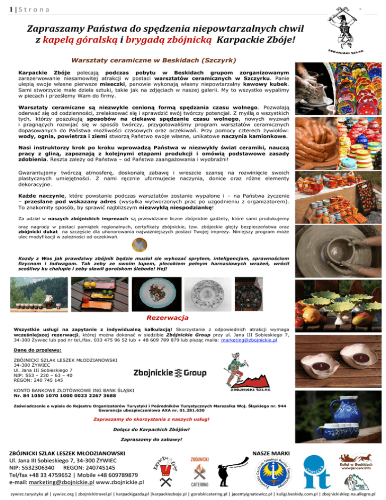 1|Strona Zapraszamy Państwa do spędzenia niepowtarzalnych chwil z kapelą góralską i brygadą zbójnicką Karpackie Zbóje! Warsztaty ceramiczne w Beskidach (Szczyrk) Karpackie Zbóje polecają podczas pobytu w Beskidach grupom zorganizowanym zarezerwowanie niesamowitej atrakcji w postaci warsztatów ceramicznych w Szczyrku. Panie ulepią swoje własne pierwsze miseczki, panowie wykonają własny niepowtarzalny kawowy kubek. Sami stworzycie małe dzieła sztuki, takie jak na zdjęciach w naszej galerii. My to wszystko wypalimy w piecach i prześlemy Wam do firmy. Warsztaty ceramiczne są niezwykle cenioną formą spędzania czasu wolnego. Pozwalają oderwać się od codzienności, zrelaksować się i sprawdzić swój twórczy potencjał. Z myślą o wszystkich tych, którzy poszukują sposobów na ciekawe spędzanie czasu wolnego, nowych wyzwań i pragnących rozwijać się w sposób twórczy, przygotowaliśmy program warsztatów ceramicznych dopasowanych do Państwa możliwości czasowych oraz oczekiwań. Przy pomocy czterech żywiołów: wody, ognia, powietrza i ziemi stworzą Państwo swoje własne, unikatowe naczynia kamionkowe. Nasi instruktorzy krok po kroku wprowadzą Państwa w niezwykły świat ceramiki, nauczą pracy z gliną, zapoznają z kolejnymi etapami produkcji i omówią podstawowe zasady zdobienia. Reszta zależy od Państwa – od Państwa zaangażowania i wyobraźni! Gwarantujemy twórczą atmosferę, doskonałą zabawę i wreszcie szansę na rozwinięcie swoich plastycznych umiejętności. Z nami ręcznie uformujecie naczynia, donice oraz różne elementy dekoracyjne. Każde naczynie, które powstanie podczas warsztatów zostanie wypalone i – na Państwa życzenie – przesłane pod wskazany adres (wysyłka wytworzonych prac po uzgodnieniu z organizatorem). To znakomity sposób, by sprawić najbliższym niezwykłą niespodziankę! Za udział w naszych zbójnickich imprezach są przewidziane liczne zbójnickie gadżety, które sami produkujemy oraz nagrody w postaci pamiątek regionalnych, certyfikaty zbójnickie, tzw. zbójeckie glejty bezpieczeństwa oraz zbójnicki dukat na szczęście dla uhonorowania najważniejszych postaci Twojej imprezy. Niniejszy program może ulec modyfikacji w zależności od oczekiwań. Kozdy z Wos jak prawdziwy zbójnik będzie musioł sie wykozać sprytem, inteligencjom, sprawnościom fizycnom i łodwagom. Tak zeby ze swoim łupem, plecokiem pełnym harnasiowych wrażeń, wrócił scośliwy ku chałupie i zeby sławił gorolskom ślebode! Hej! Rezerwacja Wszystkie usługi na zapytanie z indywidualną kalkulacją! Skorzystanie z odpowiednich atrakcji wymaga wcześniejszej rezerwacji, której można dokonać w siedzibie Zbójnickie Group przy ul. Jana III Sobieskiego 7, 34-300 Żywiec lub pod nr tel./fax. 033 475 96 52 lub + 48 609 789 879 lub pisząc maila: [email protected] Dane do przelewu: ZBÓJNICKI SZLAK LESZEK MŁODZIANOWSKI 34-300 ŻYWIEC Ul. Jana III Sobieskiego 7 NIP: 553 – 230 – 63 – 40 REGON: 240 745 145 KONTO BANKOWE ZŁOTÓWKOWE ING BANK ŚLĄSKI Nr. 84 1050 1070 1000 0023 2267 3688 Zaświadczenie o wpisie do Rejestru Organizatorów Turystyki i Pośredników Turystycznych Marszałka Woj. Śląskiego nr. 944 Gwarancja ubezpieczeniowa AXA nr. 01.281.630 Zapraszamy do skorzystania z naszych usług! Dołącz do Karpackich Zbójów! Zapraszamy do zabawy! ZBÓJNICKI SZLAK LESZEK MŁODZIANOWSKI Ul. Jana III Sobieskiego 7, 34-300 ŻYWIEC NIP: 5532306340 REGON: 240745145 Tel/fax +48 33 4759652 | Mobile +48 609789879 e-mail: [email protected] www.zbojnickie.pl NASZE MARKI zywiec.turystyka.pl | zywiec.org | zbojnickitravel.pl | karpackigazda.pl |karpackiezboje.pl | goralskicatering.pl | jacentyignatowicz.pl | kuligi.beskidy.com.pl | zbojnickisklep.na.allegro.pl