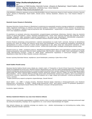 http://kulturalnybytom.pl/ wa Wystawy w CSW Kronika: Dominik Cymer „Dreams & Marketing”, Daniil Galkin „Paraliż senny”, Bartosz Zaskórski „Historia rury i inne historie miłosne”http://kulturalnybytom.pl/ CSW KRONIKA w Bytomiu zaprasza na koncert WILHELM BRAS. Koncert towarzyszy otwarciu trzech wystaw w Kronice: Dominik Cymer „Dreams & Marketing”, Daniil Galkin „Paraliż senny”, Bartosz Zaskórski „Historia rury i inne historie miłosne” + afterparty! Dominik Cymer Dreams & Marketing Wystawa Dominika Cymera Dreams & Marketing to autokrytyczna wypowiedź wizualna znanego projektanta i przedsiębiorcy wobec zagadnień marketingu czy reklamy oraz wzorców myślenia i wyobrażeń o związkach sztuki i biznesu czy fantazmacie sukcesu. Za designem i reklamą kryją się wymierne cele. W projektowaniu – użyteczności, a w promowaniu - kreowaniu mitu marki oraz napędzania pożądań. W powołanej na wystawie sztucznej rzeczywistości, przypominającej prezentację reklamową, klientem stają się marzenia artysty ze swoimi potrzebami i celami. Powstają przedsiębiorstwa i marki, które realizują strategie jego wyobraźni. Artysta używając infografik, zdjęć powstałych podczas wymyślonych z tej okazji sesji reklamowych, szkicowników projektanta i założeń marketingu, snuje opowieść w trzech rozdziałach Dreams Products, Startups i Moodboard. Dreams Products prezentują urzeczywistnione i rzekomo wprowadzone na rynek marki i pomysły. Startups to identyfikacje wizualne firm, które nie istnieją, ale rzekomo zleciły pracę nad brandingiem. Firmy te proponują rozwiązania niemożliwe do wprowadzenia na rynek, a artysta ze swoim studio przygotowuje je tak, jakby miały być rzeczywiście wdrażane. Z kolei Moodboard pokazuje własne kierunki rozwoju Cymera - analizę stylu graficznego i strategię marketingową własnej osoby. Dominik Cymer (ur. 1976) – projektant graficzny. Współtworzył kolektyw Będzin Beat. Autor identyfikacji i projektu graficznego książki-przewodnika Indunature Marcina Dosia (wydawnictwo CSW Kronika w Bytomiu 2009), która zainicjowała na Śląsku model alternatywnej turystyki i modę na „śląski dizajn". Wielokrotnie nagradzany w konkursach designu i reklamy. Współtwórca Cyber Kids on Real. Mieszka i pracuje w Warszawie. Kurator wystawy:Stanisław Ruksza, współpraca: Jacek Kołodziejski, produkcja: Cyber Kids on Real Daniil Galkin Paraliż senny Wystawa Daniila Galkina Paraliż senny składa się z dwóch części: A Trampoline or Social Critical Voyeurism (Trampolina lub Społeczne Podglądactwo Krytyczne) i Restless Dreams (Niespokojne sny). Jest też częścią długofalowego projektu Lower State, odzwierciedlającego szereg zachodzących w systemie społeczno-politycznym sytuacji, będących filarem istniejącego porządku społecznego oraz opinie kwestionujące standardy moralne, polityczne, prawne i etyczne. Projekt ma drugi tytuł: Dissociative Resocialization – termin, którego definicja pomaga opisać pole zainteresowań artystycznych Galkina. Jest to psychologiczny mechanizm obronny; repetytywna socjalizacja, która pojawia się w ciągu całego życia jednostki i zmienia jej postawę, cele, normy i wartości. Projekt powstał przy wsparciu programu stypendialnego „Gaude Polonia”. Daniil Galkin – (ur. 1985 r.) artysta wizualny. Absolwent Wyższej Szkoły Teatralnej w Dniepropietrowsku oraz Akademii Budownictwa i Architektury. W 2009 r. założył grupę artystyczną „2222”. Brał udział w ponad 70 wystawach grupowych i indywidualnych. Stypendysta Gaude Polonia 2016. Mieszka i pracuje w Dniepropietrowsku. Kuratorka: Agata Cukierska Bartosz Zaskórski Historia rury oraz inne historie miłosne Historia rury to słuchowisko opowiadające o młodym artyście, który w wyniku przeżytego zawodu miłosnego postanowił zająć się sztuką konceptualną, skupiając się na zagadnieniu rur, a tym samym doprowadzając do tragedii. Głos lektorki dobywa się z głośnika ukrytego we wnętrzu rury – obiektu stylizowanego na minimalistyczną rzeźbę, którą mógłby zbudować bohater opowieści. 1/2 http://kulturalnybytom.pl/ wa Wystawy w CSW Kronika: Dominik Cymer „Dreams & Marketing”, Daniil Galkin „Paraliż senny”, Bartosz Zaskórski „Historia rury i inne historie miłosne”http://kulturalnybytom.pl/ Bartosz Zaskórski (ur. 1987) – studiuje na ASP Katowice. Zajmuje się rysunkiem, projektuje książki, pisze i nagrywa słuchowiska, tworzy obiekty. Jako muzyk działa pod nazwą Mchy i porosty. Pochodzi ze wsi Żytno. Kurator: Stanisław Ruksza Wernisaż: 16 kwietnia (sobota), godz. 19.00 - podczas otwarcia zapraszamy dodatkowo na koncert Wilhelm Bras Wystawa potrwa do 11 czerwca 2016 CSW Kroniak, Rynek 26, Bytom Wstęp wolny 2/2 Powered by TCPDF (www.tcpdf.org)