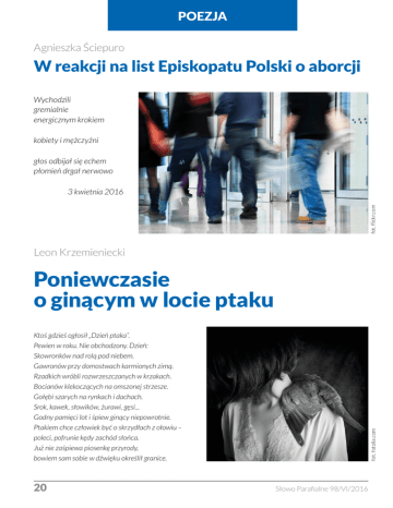 POEZJA Agnieszka Ściepuro W reakcji na list Episkopatu Polski o aborcji Wychodzili gremialnie energicznym krokiem kobiety i mężczyźni głos odbijał się echem płomień drgał nerwowo fot. flickr.com 3 kwietnia 2016 Leon Krzemieniecki Poniewczasie o ginącym w locie ptaku 20 fot. fotolia.com Ktoś gdzieś ogłosił „Dzień ptaka”. Pewien w roku. Nie obchodzony. Dzień: Skowronków nad rolą pod niebem. Gawronów przy domostwach karmionych zimą. Rzadkich wróbli rozwrzeszczanych w krzakach. Bocianów klekoczących na omszonej strzesze. Gołębi szarych na rynkach i dachach. Srok, kawek, słowików, żurawi, gęsi... Godny pamięci lot i śpiew ginący niepowrotnie. Ptakiem chce człowiek być o skrzydłach z ołowiu – poleci, pofrunie kędy zachód słońca. Już nie zaśpiewa piosenkę przyrody, bowiem sam sobie w dźwięku określił granice. Słowo Parafialne 98/VI/2016 POEZJA Leon Krzemieniecki Topola X fot. kwiatki.org Spójrz wstecz. Bóg dał ci wiele piękna przez dziesiątki lat. Możesz je przeżyć ponownie. Wracające wyraźnie, co również darem Łaski Boga. Znajdź się na zielonej łące dobrej młodości. Ją pamiętam i kaczeńce. Łamali, rwali, targali topolkę na placu Zamenhoffa. Chłopaczyska, nieuki, wandale. Nie złamali jej, rosła, aż urosła śmigła w pionie, wysoka. Gwiazd dotyka nocą, za dnia patrzy na życie miasta, dumna, prosta, bystrooka. Figurą, postawą rzecze, że jest drzewem, królewską żyrafą wśród botanik, równą czapom wielopięter. Słowo Parafialne 98/VI/2016 21