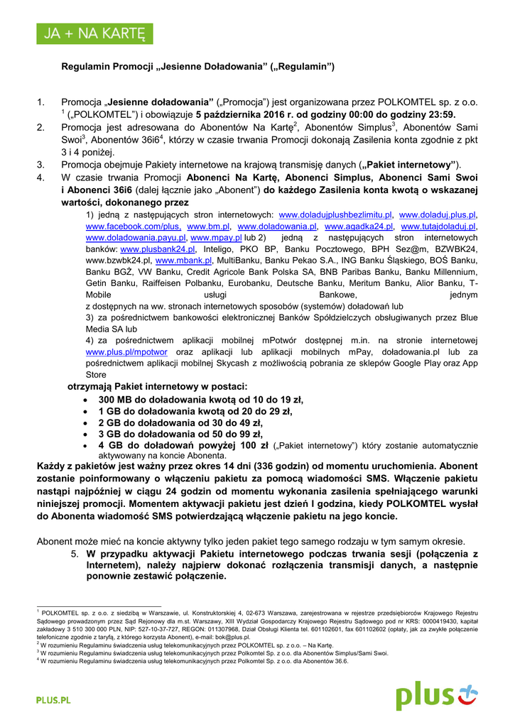 Regulamin Promocji „Jesienne Doładowania” („Regulamin”) 1. 2. 3. 4. Promocja „Jesienne doładowania” („Promocja”) jest organizowana przez POLKOMTEL sp. z o.o. 1 („POLKOMTEL”) i obowiązuje 5 października 2016 r. od godziny 00:00 do godziny 23:59. Promocja jest adresowana do Abonentów Na Kartę2, Abonentów Simplus3, Abonentów Sami Swoi3, Abonentów 36i64, którzy w czasie trwania Promocji dokonają Zasilenia konta zgodnie z pkt 3 i 4 poniżej. Promocja obejmuje Pakiety internetowe na krajową transmisję danych („Pakiet internetowy”). W czasie trwania Promocji Abonenci Na Kartę, Abonenci Simplus, Abonenci Sami Swoi i Abonenci 36i6 (dalej łącznie jako „Abonent”) do każdego Zasilenia konta kwotą o wskazanej wartości, dokonanego przez 1) jedną z następujących stron internetowych: www.doladujplushbezlimitu.pl, www.doladuj.plus.pl, www.facebook.com/plus, www.bm.pl, www.doladowania.pl, www.agadka24.pl, www.tutajdoladuj.pl, www.doladowania.payu.pl, www.mpay.pl lub 2) jedną z następujących stron internetowych banków: www.plusbank24.pl, Inteligo, PKO BP, Banku Pocztowego, BPH Sez@m, BZWBK24, www.bzwbk24.pl, www.mbank.pl, MultiBanku, Banku Pekao S.A., ING Banku Śląskiego, BOŚ Banku, Banku BGŻ, VW Banku, Credit Agricole Bank Polska SA, BNB Paribas Banku, Banku Millennium, Getin Banku, Raiffeisen Polbanku, Eurobanku, Deutsche Banku, Meritum Banku, Alior Banku, TMobile usługi Bankowe, jednym z dostępnych na ww. stronach internetowych sposobów (systemów) doładowań lub 3) za pośrednictwem bankowości elektronicznej Banków Spółdzielczych obsługiwanych przez Blue Media SA lub 4) za pośrednictwem aplikacji mobilnej mPotwór dostępnej m.in. na stronie internetowej www.plus.pl/mpotwor oraz aplikacji lub aplikacji mobilnych mPay, doładowania.pl lub za pośrednictwem aplikacji mobilnej Skycash z możliwością pobrania ze sklepów Google Play oraz App Store otrzymają Pakiet internetowy w postaci: 300 MB do doładowania kwotą od 10 do 19 zł, 1 GB do doładowania kwotą od 20 do 29 zł, 2 GB do doładowania od 30 do 49 zł, 3 GB do doładowania od 50 do 99 zł, 4 GB do doładowań powyżej 100 zł („Pakiet internetowy”) który zostanie automatycznie aktywowany na koncie Abonenta. Każdy z pakietów jest ważny przez okres 14 dni (336 godzin) od momentu uruchomienia. Abonent zostanie poinformowany o włączeniu pakietu za pomocą wiadomości SMS. Włączenie pakietu nastąpi najpóźniej w ciągu 24 godzin od momentu wykonania zasilenia spełniającego warunki niniejszej promocji. Momentem aktywacji pakietu jest dzień I godzina, kiedy POLKOMTEL wysłał do Abonenta wiadomość SMS potwierdzającą włączenie pakietu na jego koncie. Abonent może mieć na koncie aktywny tylko jeden pakiet tego samego rodzaju w tym samym okresie. 5. W przypadku aktywacji Pakietu internetowego podczas trwania sesji (połączenia z Internetem), należy najpierw dokonać rozłączenia transmisji danych, a następnie ponownie zestawić połączenie. 1 POLKOMTEL sp. z o.o. z siedzibą w Warszawie, ul. Konstruktorskiej 4, 02-673 Warszawa, zarejestrowana w rejestrze przedsiębiorców Krajowego Rejestru Sądowego prowadzonym przez Sąd Rejonowy dla m.st. Warszawy, XIII Wydział Gospodarczy Krajowego Rejestru Sądowego pod nr KRS: 0000419430, kapitał zakładowy 3 510 300 000 PLN, NIP: 527-10-37-727, REGON: 011307968, Dział Obsługi Klienta tel. 601102601, fax 601102602 (opłaty, jak za zwykłe połączenie telefoniczne zgodnie z taryfą, z którego korzysta Abonent), e-mail: [email protected]. 2 W rozumieniu Regulaminu świadczenia usług telekomunikacyjnych przez POLKOMTEL sp. z o.o. – Na Kartę. 3 W rozumieniu Regulaminu świadczenia usług telekomunikacyjnych przez Polkomtel Sp. z o.o. dla Abonentów Simplus/Sami Swoi. 4 W rozumieniu Regulaminu świadczenia usług telekomunikacyjnych przez Polkomtel Sp. z o.o. dla Abonentów 36.6. 6. Abonent może korzystać z Pakietu internetowego, gdy posiada dodatnią wartość swojego konta (min. 1 grosz) i jednocześnie znajduje się w Okresie ważności dla usług wychodzących (posiada aktywne konto). 7. Pakiet internetowy obejmuje krajową transmisję danych w technologii LTE4, HSPA+, HSPA, HSDPA, 3G (UMTS), EDGE, GPRS. 8. W technologii HSPA+, HSPA, HSDPA, 3G (UMTS), EDGE, GPRS: a. Pakiet internetowy obejmuje dostęp do internetu poprzez Punkty Dostępu (APN): WAP (wap, wap.plusgsm.pl, plus); internet (Internet, www.plusgsm.pl, plus), b. Pakiet internetowy nie obejmuje pakietowej transmisji danych w ramach usług: MMS, video streaming oraz innych usług, w tym usług audio, które korzystają z protokołu RTSP (Real Time Streaming Protocol), np.: aplikacje obsługujące radio, które to transmisje danych rozliczane są odpowiednio zgodnie z Cennikiem Taryfy, z której korzysta Abonent bądź regulaminem promocyjnej usługi „Videorozmowa – spróbuj i zobacz” oraz „Transmisja Video Streaming”, c. transmisja danych przy połączeniach z portalem Plus.pl nie pomniejsza jednostek dostępnych w ramach Pakietu internetowego, pod warunkiem korzystania zgodnie z Regulaminem Promocji „Plus.pl najlepszy portal w komórce bez dodatkowych opłat”. W technologii LTE: a. Pakiet internetowy obejmuje dostęp do internetu poprzez Punkt Dostępu (APN): plus, b. Pakiet internetowy nie obejmuje pakietowej transmisji danych w ramach usług: MMS, video streaming oraz innych usług, w tym usług audio, które korzystają z protokołu RTSP (Real Time Streaming Protocol), np.: aplikacje obsługujące radio, które to transmisje danych rozliczane są odpowiednio zgodnie z Cennikiem Taryfy, z której korzysta Abonent bądź regulaminem promocyjnej usługi „Videorozmowa – spróbuj i zobacz” oraz „Transmisja Video Streaming”, c. transmisja danych przy połączeniach z portalem Plus.pl nie pomniejsza jednostek dostępnych w ramach Pakietu internetowego, pod warunkiem korzystania zgodnie z Regulaminem Promocji „Plus.pl najleps