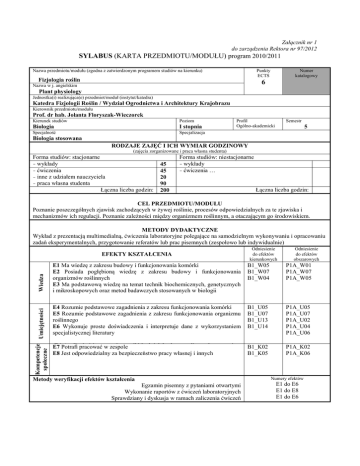 Załącznik nr 1 do zarządzenia Rektora nr 97/2012 SYLABUS (KARTA PRZEDMIOTU/MODUŁU) program 2010/2011 Nazwa przedmiotu/modułu (zgodna z zatwierdzonym programem studiów na kierunku) Punkty ECTS Fizjologia roślin Numer katalogowy 6 Nazwa w j. angielskim Plant physiology Jednostka(i) realizująca(e) przedmiot/moduł (instytut/katedra) Katedra Fizjologii Roślin / Wydział Ogrodnictwa i Architektury Krajobrazu Kierownik przedmiotu/modułu Prof. dr hab. Jolanta Floryszak-Wieczorek Kierunek studiów Poziom Biologia I stopnia Specjalność Specjalizacja Profil Ogólno-akademicki Semestr 5 Biologia stosowana RODZAJE ZAJĘĆ I ICH WYMIAR GODZINOWY (zajęcia zorganizowane i praca własna studenta) Forma studiów: stacjonarne wykłady ćwiczenia inne z udziałem nauczyciela praca własna studenta Łączna liczba godzin: 45 45 20 90 200 Forma studiów: niestacjonarne wykłady ćwiczenia … Łączna liczba godzin: CEL PRZEDMIOTU/MODUŁU Poznanie poszczególnych zjawisk zachodzących w żywej roślinie, procesów odpowiedzialnych za te zjawiska i mechanizmów ich regulacji. Poznanie zależności między organizmem roślinnym, a otaczającym go środowiskiem. METODY DYDAKTYCZNE Wykład z prezentacją multimedialną, ćwiczenia laboratoryjne polegające na samodzielnym wykonywaniu i opracowaniu zadań eksperymentalnych, przygotowanie referatów lub prac pisemnych (zespołowo lub indywidualnie) Kompetencje Umiejętności społeczne Wiedza EFEKTY KSZTAŁCENIA Odniesienie do efektów kierunkowych Odniesienie do efektów obszarowych E1 Ma wiedzę z zakresu budowy i funkcjonowania komórki E2 Posiada pogłębioną wiedzę z zakresu budowy i funkcjonowania organizmów roślinnych E3 Ma podstawową wiedzę na temat technik biochemicznych, genetycznych i mikroskopowych oraz metod badawczych stosowanych w biologii B1_W05 B1_W07 B1_W04 P1A_W01 P1A_W07 P1A_W05 E4 Rozumie podstawowe zagadnienia z zakresu funkcjonowania komórki E5 Rozumie podstawowe zagadnienia z zakresu funkcjonowania organizmu roślinnego E6 Wykonuje proste doświadczenia i interpretuje dane z wykorzystaniem specjalistycznej literatury B1_U05 B1_U07 B1_U13 B1_U14 P1A_U05 P1A_U07 P1A_U02 P1A_U04 P1A_U06 E6Potrafi Analizuje i interpretuje wyniki badań lub obserwacji z wykorzystaniem E7 pracować w zespole specjalistycznej literatury E8 Jest odpowiedzialny za bezpieczeństwo pracy własnej i innych B1_K02 B1_K05 P1A_K02 P1A_K06 Metody weryfikacji efektów kształcenia Egzamin pisemny z pytaniami otwartymi Wykonanie raportów z ćwiczeń laboratoryjnych Sprawdziany i dyskusja w ramach zaliczenia ćwiczeń Numery efektów E1 do E6 E1 do E8 E1 do E6 TREŚCI KSZTAŁCENIA Wykłady: Zróżnicowanie strukturalne i funkcjonalne komórki roślinnej w odniesieniu do komórki zwierzęcej. Transport przez błony biologiczne. Odbiór, przekazywanie i przetwarzanie sygnałów w komórce roślinnej. Regulacja procesów fizjologicznych z udziałem hormonów roślinnych. Gospodarka wodna komórki i rośliny. Mineralne odżywianie roślin. Przemiany anaboliczne - fotosynteza. Przewodzenie, dystrybucja i akumulacja związków organicznych w roślinie. Procesy kataboliczne w roślinie. Wybrane zagadnienia z metabolizmu wtórnego. Spoczynek i kiełkowanie nasion. Rozwój wegetatywny roślin. Fizjologia kwitnienia. Ruchy roślin. Starzenie się i zamieranie komórek, organów i roślin. Fizjologia reagowania roślin na stresowe czynniki środowiska. Ćwiczenia: Ćwiczenia obejmują wszystkie podstawowe działy fizjologii roślin omawiane na wykładach. Wykonywanie analiz i przeprowadzanie obserwacji w oparciu o wiedzę teoretyczną na temat podstawowych procesów fizjologiczno-biochemicznych przebiegających w komórce, poszczególnych organach i całej roślinie. Wybrane analizy laboratoryjne: Wyznaczanie kierunku osmozy w układach osmotycznych Pomiar potencjału wody w tkance miękiszowej Pomiar potencjału osmotycznego soku komórkowego metodą plazmolizy granicznej Wykazanie indukcji aktywności reduktazy azotanowej przez azotany Oznaczanie zawartości azotanów Wykazanie zależności fazy ciemnej od fazy jasnej fotosyntezy Pomiar intensywności transpiracji czy oddychania w zależności od zastosowanych czynników zewnętrznych Przygotowanie protokołów z ćwiczeń oraz prezentacja i interpretacja rezultatów obserwacji i wyników przeprowadzonych doświadczeń Praca w zespole 2-3 osobowym, niektóre doświadczenia prowadzone są samodzielnie i referowane pozostałym uczestnikom zajęć. Przygotowanie prezentacji w języku polskim i obcym w oparciu o dane literaturowe z wybranych działów fizjologii, np. z indukcji kwitnienia Formy i kryteria zaliczenia przedmiotu/modułu - Ocena z ćwiczeń na podstawie wyników ze sprawdzianów i aktywności studenta - Ocena z pisemnego egzaminu z treści wykładów Procentowy udział w końcowej ocenie 20% 80% WYKAZ LITERATURY Podstawowa 1. Kopcewicz J. i Lewak S. (2007) Fizjologia roślin. Wydawnictwo naukowe PWN, Warszawa 2. Kozłowska M., red (2007) Fizjologia roślin – od teorii do nauk stosowanych. Wydawnictwo PWRiL, Poznań 3. Malepszy S., red (2009) Biotechnologia roślin. PWN Warszawa 4. Szweykowska A. (1997) Fizjologia roślin. Wydawnictwo naukowe UAM Poznań Uzupełniająca 5. Grzesiuk S. (1999) Fizjologiczne podstawy odporności roślin na choroby. Wydawnictwo ART. 6. Jankiewicz L., red (1997) Regulatory wzrostu i rozwoju roślin. Wydawnictwo naukowe PWN, Warszawa 7. Starck Z., Niemyska B. (1997) Fizjologiczne reakcje roślin na niekorzystne czynniki środowiska. Wydawnictwo SGGW Warszawa