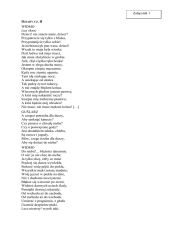 Załącznik 1 DZIADY CZ. II WIDMO (zza okna) Dzieci! nie znacie mnie, dzieci? Przypatrzcie się tylko z bliska, Przypomnijcie tylko sobie! Ja nieboszczyk pan wasz, dzieci! Wszak to moja była wioska. Dziś ledwo rok mija trzeci, Jak mnie złożyliście w grobie. Ach, zbyt ciężka ręka boska! Jestem w złego ducha mocy, Okropne cierpię męczarnie. Kędy noc ziemię ogarnie, Tam idę szukając nocy; A uciekając od słońca Tak pędzę żywot tułaczy, A nie znajdę błędom końca. Wiecznych głodów jestem pastwą; A któż mię nakarmić raczy? Szarpie mię żarłoczne ptastwo; A któż będzie mój obrońca? Nie masz, nie masz mękom końca! […] GUŚLARZ A czegoż potrzeba dla duszy, Aby uniknąć katuszy? Czy prosisz o chwałę nieba? Czy o poświęcone gody? Jest dostatkiem mleka, chleba, Są owoce i jagody. Mów, czego trzeba dla duszy, Aby się dostać do nieba? WIDMO Do nieba?... bluźnisz daremnie. O nie! ja nie chcę do nieba; Ja tylko chcę, żeby ze mnie Prędzej się dusza wywlekła. Stokroć wolę pójść do piekła, Wszystkie męki zniosę snadnie; Wolę jęczeć w piekle na dnie, Niż z duchami nieczystemi Błąkać się wiecznie po ziemi, Widzieć dawnych uciech ślady, Pamiątki dawnej szkarady; Od wschodu aż do zachodu, Od zachodu aż do wschodu Umierać z pragnienia, z głodu I karmić drapieżne ptaki. Lecz niestety! wyrok taki, Że dopóty w ciele muszę Potępioną włóczyć duszę, Nim kto z was, poddani moi, Pożywi mię i napoi. Ach, jak mnie pragnienie pali; Gdyby mała wody miarka! Ach! gdybyście mnie podali Choćby dwa pszenicy ziarka! […] KRUK Nie lubisz umierać z głodu! A pomnisz, jak raz w jesieni Wszedłem do twego ogrodu? Gruszka dojrzewa, jabłko się czerwieni; Trzy dni nic nie miałem w ustach, Otrząsnąłem jabłek kilka. Lecz ogrodnik skryty w chrustach Zaraz narobił hałasu I poszczuł psami jak wilka. Nie przeskoczyłem tarasu, Dopędziła mię obława; Przed panem toczy się sprawa, O co? o owoce z lasu, Które na wspólną wygodę Bóg dał jak ogień i wodę. Ale pan gniewny zawoła: „Potrzeba dać przykład grozy”. Zbiegł się lud z całego sioła, Przywiązano mnie do sochy, Zbito dziesięć pęków łozy. Każdą kość, jak z kłosa żyto, Jak od suchych strąków grochy, Od skóry mojej odbito! Nie znałeś litości, panie! […] WIDMO Nie ma, nie ma dla mnie rady! Darmo podajesz talerze, Co dasz, to ptastwo zabierze. Nie dla mnie, nie dla mnie Dziady! Tak, muszę dręczyć się wiek wiekiem, Sprawiedliwe zrządzenia Boże! Bo kto nie był ni razu człowiekiem, Temu człowiek nic nie pomoże. CHÓR Tak, musisz dręczyć się wiek wiekiem, Sprawiedliwe zrządzenia Boże! Bo kto nie był ni razu człowiekiem, Temu człowiek nic nie pomoże. [422 słowa] Adam Mickiewicz, Dziady cz. II, [w:] tegoż, Utwory dramatyczne, Warszawa 1982.