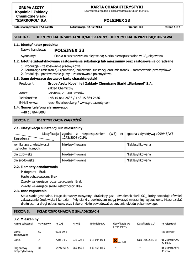 KARTA CHARAKTERYSTYKI GRUPA AZOTY Kopalnie i Zakłady Chemiczne Siarki "SIARKOPOL" S.A. Sporządzona zgodnie z Rozporządzeniem UE nr 453/2010 POLSINEX 33 Data sporządzenia: 07.05.2007 SEKCJA 1. Aktualizacja: 11.12.2014 Wersja: 3.0 Strona 1 z 7 IDENTYFIKACJA SUBSTANCJI/MIESZANINY I IDENTYFIKACJA PRZEDSIĘBIORSTWA 1.1. Identyfikator produktu Nazwa handlowa: POLSINEX Synonimy: 33 Siarka nierozpuszczalna olejowana; Siarka nierozpuszczalna w CS2 olejowana 1.2. Istotne zidentyfikowane zastosowania substancji lub mieszaniny oraz zastosowania odradzane 1. Produkcja – zastosowanie przemysłowe. 2. Formulacja (mieszanie) i (ponowne) pakowanie substancji oraz mieszanek – zastosowanie przemysłowe. 2. Produkcja i przetwarzanie gumy – zastosowanie przemysłowe. 1.3. Dane dotyczące dostawcy karty charakterystyki Producent: Grupa Azoty Kopalnie i Zakłady Chemiczne Siarki „Siarkopol” S.A. Zakład Chemiczny Adres: Grzybów, 28-200 Staszów Telefon/Fax: +48 15 864 2636 / +48 15 864 2636 E-Mail /www: [email protected] / www.grupaazoty.com 1.4. Numer telefonu alarmowego: +48 15 864 8008 SEKCJA 2. IDENTYFIKACJA ZAGROŻEŃ 2.1. Klasyfikacja substancji lub mieszaniny Klasyfikacja Zagrożenia zgodna z rozporządzeniem 1272/2008 (CLP): (WE) nr zgodna z dyrektywą 1999/45/WE: wynikające z właściwości fizykochemicznych: Nieklasyfikowana Nieklasyfikowana dla człowieka: Nieklasyfikowana Nieklasyfikowana dla środowiska: Nieklasyfikowana Nieklasyfikowana 2.2. Elementy oznakowania Piktogram: Brak Hasło ostrzegawcze: Brak Zwroty wskazujące rodzaj zagrożenia: Brak Zwroty wskazujące środki ostrożności: Brak 2.3. Inne zagrożenia Stała siarka jest palna. Paląc się tworzy toksyczny i drażniący gaz – dwutlenek siarki SO2, który powoduje również zakwaszenie środowiska i korozję. . Pyły siarki z powietrzem mogą tworzyć mieszaniny wybuchowe. Może działać drażniąco na drogi oddechowe, oczy i skórę. Może powodować zaburzenia układu pokarmowego. SEKCJA 3. SKŁAD/INFORMACJA O SKŁADNIKACH 3.2. Mieszaniny Nazwa substancji % wagowy Nr CAS Nr WE Nr indeksowy Siarka polimeryczna 60 9035-99-8 – Siarka 7 7704-34-9 231-722-6 016-094-00-1 Olej bazowy – niespecyfikowany 33 64742-52-5 265-155-0 649-465-00-7 – Klasyfikacja wg 67/548/EWG Klasyfikacja CLP Nr rejestracji – – Nie dotyczy Skin Irrit. 2, H315 01-211948729527-0036 –* 01-211946717045-xxxx Xi, R38 –* KARTA CHARAKTERYSTYKI GRUPA AZOTY Kopalnie i Zakłady Chemiczne Siarki "SIARKOPOL" S.A. Data sporządzenia: 07.05.2007 Sporządzona zgodnie z Rozporządzeniem UE nr 453/2010 POLSINEX 33 Aktualizacja: 11.12.2014 Wersja: 3.0 Strona 2 z 7 *Substancji oznaczonej notą L nie klasyfikuje się jako rakotwórczej, jeżeli można wykazać, że zawiera mniej niż 3 % ekstraktu DMSO, zgodnie z pomiarem metodą określoną w IP 346. Lista zwrotów R i H – zob. sekcja 16 karty charakterystyki. SEKCJA 4. ŚRODKI PIERWSZEJ POMOCY 4.1. Opis środków pierwszej pomocy Wdychanie: Poszkodowanego wyprowadzić lub wynieść ze skażonego terenu na świeże powietrze. W przypadku zaburzeń oddychania lub utrzymującego się złego samopoczucia natychmiast zapewnić pomoc lekarską. Kontakt ze skórą: Zdjąć zanieczyszczoną odzież. Zanieczyszczoną skórę zmyć dokładnie wodą z mydłem, a następnie spłukać wodą. W przypadku utrzymującego się podrażnienia skonsultować się z lekarzem. Kontakt z oczami: Płukać oczy ciągłym strumieniem wody przez kilka minut, wcześniej usunąć szkła kontaktowe. Nie pocierać oczu. W przypadku utrzymującego się podrażnienia, złego widzenia skonsultować się z lekarzem. Połknięcie: Natychmiast wypłukać jamę ustną, nie powodować wymiotów. Zapewnić pomoc lekarską. 4.2. Najważniejsze ostre i opóźnione objawy oraz skutki narażenia Po spożyciu może wystąpić efekt przeczyszczający. Może wystąpić podrażnienie lub oparzenie skóry i/lub oczu. 4.3. Wskazania dotyczące wszelkiej natychmiastowej pomocy lekarskiej i szczególnego postępowania z poszkodowanym Pokazać kartę charakterystyki lub etykietę/opakowanie personelowi medycznemu udzielającemu pomocy. Wskazówki dla lekarza: leczenie objawowe. SEKCJA 5. POSTĘPOWANIE W PRZYPADKU POŻARU 5.1. Środki gaśnicze Odpowiednie środki gaśnicze: dwutlenek węgla, proszek gaśniczy, piana, rozproszone prądy wody, ziemia, piasek. Niewłaściwe środki gaśnicze: zwarte prądy wody. Istnieje niebezpieczeństwo rozprzestrzeniania się palącej cieczy na powierzchni wody. 5.2. Szczególne zagrożenia związane z substancją lub mieszaniną Produkt palny. Pyły i pary z powietrzem tworzą mieszaniny wybuchowe. Podczas palenia się siarka wydziela tlenki siarki (SO2, SO3) i siarkowodór (H2S). 5.3. Informacje dla straży pożarnej Pojemniki narażone na działanie ognia lub wysokiej temperatury chłodzić wodą i w miarę możliwości usunąć z zagrożonego obszaru. W przypadku dużego pożaru lub słabej wentylacji stosować specjalne ubranie przeciwpożarowe oraz aparaty izolujące drogi oddechowe. SEKCJA 6. POSTĘPOWANIE W PRZYPADKU NIEZAMIERZONEGO UWOLNIENIA DO ŚRODOWISKA 6.1. Indywidualne środki ostrożności, wyposażenie ochronne i procedury w sytuacjach awaryjnych Zawiadomić otoczenie o awarii. Usunąć z obszaru zagrożenia wszystkie osoby niebiorące udziału w likwidacji skutków zdarzenia. W razie konieczności zarządzić ewakuację i powiadomić odpowiednie służby ratownicze. W akcji ratunkowej mogą brać udział jedynie osoby przeszkolone, wyposażone we właściwą odzież i sprzęt ochronny. Usunąć wszelkie źródła zapłonu. Unikać rozprzestrzeniania się pyłu/oparów. Stosować środki ochrony indywidualnej – zob. sekcja 8 karty charakterystyki. 6.2. Środki ostrożności w zakresie ochrony środowiska Nie dopuścić do przedostania się produktu do kanalizacji, wód powierzchniowych, gruntowych i akwenów. Zebrać pyły produktu z powierzchni wody. W razie konieczności powiadomić odpowiednie sł
