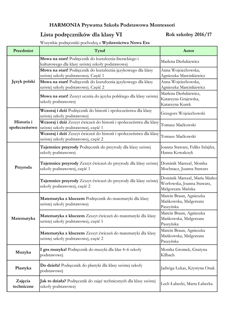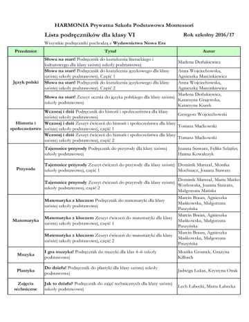 HARMONIA Prywatna Szkoła Podstawowa Montessori Lista podręczników dla klasy VI Rok szkolny 2016/17 Wszystkie podręczniki pochodzą z Wydawnictwa Nowa Era Przedmiot Tytuł Słowa na start! Podręcznik do kształcenia literackiego i kulturowego dla klasy szóstej szkoły podstawowej Słowa na start! Podręcznik do kształcenia językowego dla klasy szóstej szkoły podstawowej. Część 1 Słowa na start! Podręcznik do kształcenia językowego dla klasy szóstej szkoły podstawowej. Część 2 Autor Marlena Derlukiewicz Anna Wojciechowska, Agnieszka Marcinkiewicz Język polski Anna Wojciechowska, Agnieszka Marcinkiewicz Marlena Derlukiewicz, Słowa na start! Zeszyt ucznia do języka polskiego dla klasy szóstej Katarzyna Grajewska, szkoły podstawowej Katarzyna Kurek Wczoraj i dziś Podręcznik do historii i społeczeństwa dla klasy Grzegorz Wojciechowski szóstej szkoły podstawowej Historia i Wczoraj i dziś Zeszyt ćwiczeń do historii i społeczeństwa dla klasy Tomasz Maćkowski społeczeństwo szóstej szkoły podstawowej, część 1 Wczoraj i dziś Zeszyt ćwiczeń do historii i społeczeństwa dla klasy Tomasz Maćkowski szóstej szkoły podstawowej, część 2 Tajemnice przyrody Podręcznik do przyrody dla klasy szóstej szkoły podstawowej Przyroda Joanna Stawarz, Feliks Szlajfer, Hanna Kowalczyk Tajemnice przyrody Zeszyt ćwiczeń do przyrody dla klasy szóstej Dominik Marszał, Monika szkoły podstawowej, część 1 Mochnacz, Joanna Stawarz Dominik Marszał, Maria MarkoTajemnice przyrody Zeszyt ćwiczeń do przyrody dla klasy szóstej Worłowska, Joanna Stawarz, szkoły podstawowej, część 2 Małgorzata Mańska Matematyka z kluczem Podręcznik do matematyki dla klasy szóstej szkoły podstawowej Matematyka Matematyka z kluczem Zeszyt ćwiczeń do matematyki dla klasy szóstej szkoły podstawowej, część 1 Matematyka z kluczem Zeszyt ćwiczeń do matematyki dla klasy szóstej szkoły podstawowej, część 2 Marcin Braun, Agnieszka Mańkowska, Małgorzata Paszyńska Marcin Braun, Agnieszka Mańkowska, Małgorzata Paszyńska Marcin Braun, Agnieszka Mańkowska, Małgorzata Paszyńska Muzyka I gra muzyka! Podręcznik do muzyki dla klas 4–6 szkoły podstawowej Monika Gromek, Grażyna Kilbach Plastyka Do dzieła! Podręcznik do plastyki dla klasy szóstej szkoły podstawowej Jadwiga Lukas, Krystyna Onak Jak to działa? Podręcznik do zajęć technicznych dla klasy szóstej szkoły podstawowej Lech Łabecki, Marta Łabecka Zajęcia techniczne