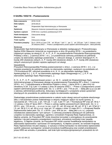 Centralna Baza Orzeczeń Sądów Administracyjnych Str 1 / 9 II SA/Wa 1652/16 - Postanowienie Data orzeczenia 2016-12-29 Data wpływu 2016-09-23 Sąd Wojewódzki Sąd Administracyjny w Warszawie Sędziowie Sławomir Antoniuk /przewodniczący sprawozdawca/ Symbol z opisem 6199 Inne o symbolu podstawowym 619 Hasła tematyczne Odrzucenie skargi Skarżony organ Inne Treść wyniku Odrzucono skargę Powołane przepisy Dz.U. 2016 nr 0 poz 718; art. 58 par. 1 pkt 1 i par. 3, art. 232 par. 1 pkt 1; Ustawa z dnia 30 sierpnia 2002 r. - Prawo o postępowaniu przed sądami administracyjnymi - tekst jednolity Sentencja Wojewódzki Sąd Administracyjny w Warszawie w składzie następującym: Przewodniczący Sędzia WSA Sławomir Antoniuk po rozpoznaniu w dniu 29 grudnia 2016 r. na posiedzeniu niejawnym sprawy ze skargi K. H., A. P., A. P. na postanowienie Prezydenta Rzeczypospolitej Polskiej z dnia [...] czerwca 2016 r. nr [...] w przedmiocie odmowy powołania do pełnienia urzędu na stanowisku sędziego postanawia: 1. odrzucić skargę; 2. zwrócić skarżącym K. H. kwotę 200 (dwieście) złotych, A. P. kwotę 200 (dwieście) złotych, A. P. kwotę 200 (dwieście) złotych uiszczonych tytułem wpisów sądowych od skargi. Uzasadnienie Prezydent Rzeczypospolitej Polskiej postanowieniem z dnia [...] czerwca 2016 r. nr [...] w sprawie powołania do pełnienia urzędu na stanowisku sędziego, wydanym na podstawie art. 179 Konstytucji RP, odmówił powołania m.in. K. H. na stanowisko sędziego Sądu Apelacyjnego w [...], A. P. na stanowisko sędziego Sądu Okręgowego w [...], A. P. na stanowisko sędziego Sądu Rejonowego [...]. K. H., A. P., A. P., reprezentowani przez r. pr. M. C., wnieśli do Wojewódzkiego Sądu Administracyjnego w Warszawie skargę na postanowienie Prezydenta RP z dnia [...] czerwca 2016 r. nr [...] (opublikowane w Monitorze Polskim z dnia [...] lipca 2016 r.), jako inny niż określony w art. 3 § 2 pkt 1-3 ustawy z dnia 30 sierpnia 2002 r. – Prawo o postępowaniu przed sądami administracyjnymi (tekst jedn. Dz. U. z 2016 r. poz. 718 ze zm. – dalej jako p.p.s.a) akt z zakresu administracji publicznej, dotyczący wynikających z przepisów prawa uprawnień skarżących do powołania do pełnienia urzędu na stanowisku sędziego. Zaskarżając przedmiotowe postanowienie w całości autor skargi zarzucił wydanie skarżonego aktu z naruszeniem prawa materialnego w stopniu mającym wpływ na wynik sprawy, tj.: naruszenie art. 179 w zw. z art. 144 ust. 1 i ust. 3 pkt 17 i art. 7 Konstytucji RP oraz art. 55 § 1 i 2 ustawy z dnia 27 lipca 2001 r. Prawo o ustroju sądów powszechnych (tekst jedn. Dz. U. z 2015 r. poz. 133 ze zm. – p.u.s.p.) w zw. z art. 61, art. 63 oraz art. 64, art. 57 § 1, art. 57ah § 1 i 5, art. 58 § 2 i 4, art. 60 p.u.s.p. oraz art. 37 ustawy z dnia 12 maja 2011 r. o Krajowej Radzie Sądownictwa (tekst jedn. Dz. U. z 2016 r. poz. 976 ze zm. - dalej jako u.k.r.s.), poprzez niewłaściwe zastosowanie i tym samym: 1) odmowę powołania skarżących do pełnienia urzędów na stanowisku sędziego, zgodnie z wnioskiem Krajowej Rady Sądownictwa, 2) błędne uznanie, że Prezydent RP może dowolnie korzystać z prerogatywy do powoływania sędziów i nie jest związany przesłankami nominacji, procedurą nominacji oraz zasadą legalizmu, 3) błędne uznanie, że Prezydent RP może oceniać kwalifikacje kandydatów na stanowiska sędziowskie i opiniować ich kandydatury, 4) błędne uznanie, że wniosek Krajowej Rady Sądownictwa nie jest wiążący, w sytuacji w której kandydaci na stanowiska sędziowskie spełnili ustawowe wymagania i przeszli procedurę kwalifikacyjną oraz zostali przedstawieni przez KRS we wniosku o powołanie, zaś brak było konstytucyjnoprawnych przeszkód do ich 2017-01-03 09:32 Centralna Baza Orzeczeń Sądów Administracyjnych Str 2 / 9 nominacji, 5) brak uzasadnienia odmowy nominacji, które utrudnia weryfikację jego legalności i właściwego skorzystania Prezydenta RP z jego prerogatywy oraz pozbawia kandydatów możliwości poznania motywów odmowy. Rozwijając zarzuty skargi jej autor wskazał, iż w świetle powołanych przepisów prawa skarżącym przysługuje prawo podmiotowe w zakresie powołania do pełnienia urzędu na stanowisku sędziego, zgodnie z wnioskiem Krajowej Rady Sądownictwa, zaś Prezydent RP nie miał żadnych podstaw prawnych do podjęcia decyzji o odmowie nominacji. Prerogatywa Prezydenta RP do powoływania sędziów sprowadza się do wykonywania konstytucyjnego obowiązku. Zakres swobody głowy państwa wyznaczają przesłanki nominacji, ramy procedury nominacji, prawa i obowiązki osób nominowanych. Wykonywanie prerogatywy w zakresie powoływania sędziów musi uwzględniać fundamentalne zasady gwarantowane Konstytucją, takie jak zasada niezależności sądów i niezawisłości sędziów (art. 173 i art. 178 Konstytucji RP) oraz zasada legalizmu (art. 7 Konstytucji RP). Zasada legalizmu nakazuje poszanowanie kompetencji innych organów, w tym niewkraczanie w te kompetencje bez wyraźnej podstawy prawnej oraz działanie zawsze na podstawie i w granicach prawa. Prezydent RP nie ma kompetencji do oceny kwalifikacji kandydatów na stanowiska sędziowskie, opiniowania oraz rozpatrywania ich kandydatur - kompetencje te należą do innych podmiotów i organów. Decyzja o skorzystaniu z prerogatywy nie może być podejmowana dowolnie, na podstawie swobodnego uznania. Z uwagi na powyższe uchybienia pełnomocnik skarżących wniósł o: 1) uchylenie zaskarżonego postanowienia w części odnoszącej się do skarżących, tj. w pkt 2, 8 i 10, na podstawie art. 146 § 1 w zw. z art. 145 § 1 pkt 1 lit a) p.p.s.a., 2) uznanie, na podstawie art. 146 § 2 p.p.s.a., uprawnienia do powołania skarżących: a) K. H. do pełnienia urzędu na stanowisku sędziego Sądu Apelacyjnego w [...], b) A. P. do pełnienia urzędu na stanowisku sędziego Sądu Okręgowego w [...], c) A. P.o do pełnienia urzędu na stanowisku sę