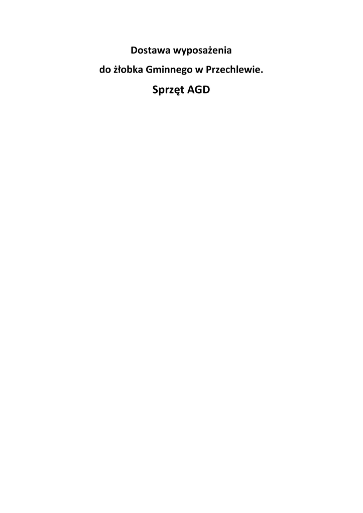 Dostawa wyposażenia do żłobka Gminnego w Przechlewie. Sprzęt AGD I. lp 1 ZMYWALNIA – pom. 0.20 parter. nazwa Zmywarko wyparzarka ilość 1 jm SZT. opis Opis urządzenia: czas trwania cyklu: 120 s zużycie wody: 2l/cykl specjalnie zaprojektowane ramiona myjące i płuczące wykonane ze stali nierdzewnej wbudowany dozownik płynu nabłyszczającego i myjącego wymiary szer.x gł.x wys.: od 420 do 600 x od 500 do 600 x od 665 do 900 h mm wymiary kosza (mm): min. 350 x 350 pojemność bojlera (l): 3,2 moc grzałek zbiornika (kW): 3,0 moc grzałek bojlera (kW): 3,0 moc pompy myjącej (kW): 0,26 moc całkowita urządzenia (kW): 3,26 odpływ grawitacyjny (max 10cm od ziemi) spełnia normy HACCP - posiada funkcje wyparzania Wyposażenie: 2 kosze na szkło 1 kosz na sztućce 1 stelaż na 15 talerzyków dozownik płynu myjącego i nabłyszczającego Spełniająca normy Głównego Inspektoratu Sanitarnego. Świadectwo homologacji CE Foto przykładowe II. lp 1 ROZDZIELNIA POSIŁKÓW – pom. 0.18 parter. nazwa Kuchenka mikrofalowa ilość 1 jm SZT. 2 Czajnik elektryczny 2 SZT. 3 Płyta ceramiczna do grzania 1 SZT. opis Pojemność 20 litrów Moc mikrofal 800 W Sterowanie elektroniczne - sensorowe Funkcje podstawowe gotowanie, podgrzewanie, rozmrażanie Sposób otwierania drzwi w bok - w lewą stronę Automatyczny dobór czasu gotowania System rozprowadzania mikrofal przestrzenny Funkcje dodatkowe 6 poziomów mocy, funkcja oszczędzania energii, szybkie rozmrażanie, wyświetlacz LED, zegar Wykończenie wnętrza emalia ceramiczna Kolor stal nierdzewna - czarny Wymiary (szer. x wys. x gł.) 48,9 x 27,5 x 32,5 cm Wyposażenie instrukcja obsługi w języku polskim, karta gwarancyjna, talerz obrotowy Gwarancja minimum 24 miesiące Świadectwo homologacji CE Pojemność 1,7 litra Element grzejny płaska grzałka płytowa Moc 2200 W Kolor stalowy Wykonanie stal nierdzewna Filtr antyosadowy tak Obrotowa podstawa tak Wskaźnik poziomu wody tak Podświetlany wskaźnik poziomu wody nie Bezpieczeństwo użytkowania: automatyczny wyłącznik po zagotowaniu wody, bezpiecznik termiczny Wyposażenie instrukcja obsługi w języku polskim, karta gwarancyjna , podstawka Gwarancja 24 miesiące Świadectwo homologacji CE Wymiary (szer. x wys. x gł.) 59,2 x 3,9 x 52,2 cm Kolor płyty grzewczej czarny Moc przyłączeniowa 6,6 kW Napięcie zasilania 230V, 400V Pola grzewcze 4 pola ceramiczne Sterowanie płyty grzewczej elektroniczne dotykowe (sensorowe) na płycie grzewczej Wykonanie płyty grzewczej ceramiczne - bez ramki Funkcje dodatkowe 17 poziomów mocy grzania, pola "HighSpeed", programowanie czasowe każdego pola, timer, wyłącznik główny Bezpieczeństwo użytkowania: wskaźnik ciepła resztkowego, blokada przed przypadkowym uruchomieniem, blokada przed zmianą ustawień, wyłącznik bezpieczeństwa Wyposażenie instrukcja obsługi w języku polskim, karta gwarancyjna Świadectwo homologacji CE Gwarancja 24 miesiące Foto przykładowe 4 Lodówka 5 Podgrzewacz do butelek 1 SZT. 3 SZT Właściwości urządzenia Rodzaj lodówki jednodrzwiowa, Rozmieszczenie zamrażarki na górze, Kolor stalowy, Kolor boków stalowy, Opcja drzwi dwustronnych tak, Klasa klimatyczna ST, Minimalna temperatura otoczenia16 stopni Celsjusza, Maksymalna temperatura otoczenia38 stopni Celsjusza Pojemność Całkowita pojemność brutto 111 l, Całkowita pojemność netto 105 l, Pojemność netto chłodziarki 93 l, Pojemność netto zamrażarki 12 l Właściwości chłodzenia Zdolność zamrażania 2 kg/24h, Czas przechowywania w czasie awarii 14 h, Poziom hałasu 40 dB, Liczba kompresorów/agregatów1, Technologia chłodzenia chłodziarki No Frost, Automatyczne rozmrażanie chłodziarki tak Wnętrze Kolor wnętrza biały, Kolor plastików bezbarwny, Powłoka antybakteryjna tak, Materiał półek szkło, Liczba półek/szuflad w lodówce 3/1, Rodzaj półek/szuflad w lodówce 3 półki szklane, 1 szuflada, 3 balkoniki, Liczba półek/szuflad w zamrażarce1, Rodzaj półek/szuflad w zamrażarce1 półka, Oświetlenie tak, Inne informacje Anti Bacteria System, Klasa energetyczna A+, Zużycie energii na rok 161 kWh, Napięcie zasilania 230 V Wymiary i waga Wysokość od 84.5 do 60 cm, Szerokość z uchwytem od 54.6 do 56cm, Głębokość z uchwytem od 55 do 57.1 cm Gwarancja producenta24 miesiące Świadectwo homologacji CE Podgrzewacz elektroniczny 2 w 1 dzięki szerokiemu zakresowi ustawienia temperatury umożliwia precyzyjne podgrzanie pokarmu w butelkach i gotowych dań w słoiczkach, a także podgrzanie gęstego pokarmu na parze w specjalnie dołączonej miseczce. Ma również możliwość wyparzenia smoczków i drobnych elementów butelek. Posiada funkcje podtrzymywania temperatury oraz jej precyzyjny wybór, a także zabezpieczenie przed przegrzaniem. Dzięki podświetlanemu wyświetlaczowi widoczny w godzinach nocnych, natomiast po wyparowaniu wody automatycznie wyłącza się. Podgrzewacz elektroniczny pasuje do wszystkich rodzajów butelek i słoiczków z pokarmem. wykonany został z trwałych i bezpiecznych materiałów, co zapewnia najwyższą jakość i bezpieczeństwo produktu. Charakterystyka: delikatne podgrzanie naturalnego pokarmu w kąpieli wodnej, zachowując jego wartości odżywcze precyzyjne podgrzanie pokarmu w butelkach i gotowych dań w słoiczkach wyparzenie smoczków i drobnych elementów butelek podgrzanie gęstego pokarmu na parze w specjalnie dołączonej do tego miseczce funkcja podtrzymywania temperatury widoczny w nocy, podświetlany wyświetlacz precyzyjny wybór poziomu temperatury intuicyjna obsługa pasuje do wszystkich butelek i słoiczków z pokarmem dostępnych na rynku zabezpieczenie przed przegrzaniem automatyczne wyłączenie po wyparowaniu wody Dane techniczne: zakres temperatury: 36˚C - 100˚C komora podgrzewacza: 10 x 8,5 cm Świadectwo homologacji CE III. ZMYWALNIA – pom. 1.10 piętro. lp nazwa 1 Zmywarko wyparzarka ilość 1 jm SZT. opis Opis urządzenia: czas trwania cyklu: 120 s zużyc