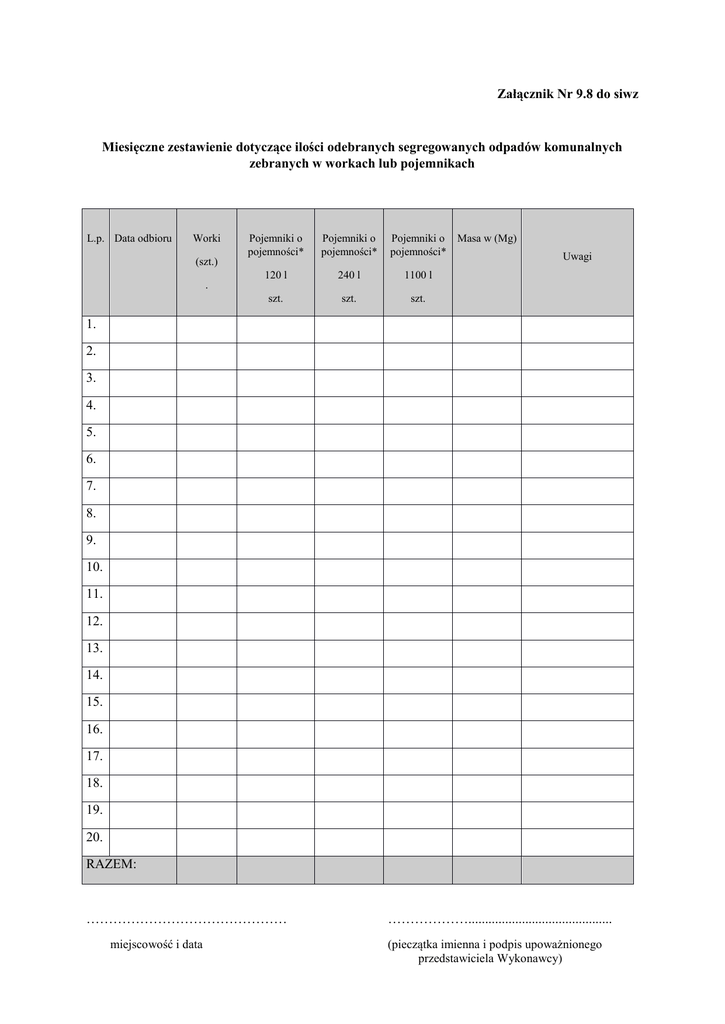Załącznik Nr 9.8 do siwz Miesięczne zestawienie dotyczące ilości odebranych segregowanych odpadów komunalnych zebranych w workach lub pojemnikach L.p. Data odbioru Worki (szt.) . Pojemniki o Masa w (Mg) pojemności* Pojemniki o pojemności* Pojemniki o pojemności* 120 l 240 l 1100 l szt. szt. szt. Uwagi 1. 2. 3. 4. 5. 6. 7. 8. 9. 10. 11. 12. 13. 14. 15. 16. 17. 18. 19. 20. RAZEM: ……………………………………… miejscowość i data ………………........................................... (pieczątka imienna i podpis upoważnionego przedstawiciela Wykonawcy)