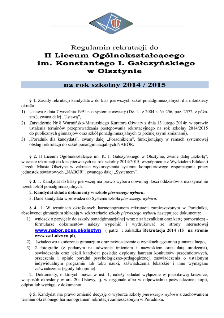Regulamin rekrutacji do II Liceum Ogólnokształcącego im. Konstantego I. Gałczyńskiego w Olsztynie na rok szkolny 2014 / 2015 § 1. Zasady rekrutacji kandydatów do klas pierwszych szkół ponadgimnazjalnych dla młodzieży określa: 1) Ustawa z dnia 7 września 1991 r. o systemie oświaty (Dz. U. z 2004 r. Nr 256, poz. 2572, z późn. zm.), zwana dalej „Ustawą”, 2) Zarządzenie Nr 8 Warmińsko-Mazurskiego Kuratora Oświaty z dnia 13 lutego 2014r. w sprawie ustalenia terminów przeprowadzania postępowania rekrutacyjnego na rok szkolny 2014/2015 do publicznych gimnazjów oraz szkół ponadgimnazjalnych (z późniejszymi zmianami), 3) „Poradnik dla kandydata”, zwany dalej „Poradnikiem”, funkcjonujący w ramach systemowej obsługi rekrutacji do szkół ponadgimnazjalnych NABÓR. § 2. II Liceum Ogólnokształcące im. K. I. Gałczyńskiego w Olsztynie, zwane dalej „szkołą”, w czasie rekrutacji do klas pierwszych na rok szkolny 2014/2015, współpracuje z Wydziałem Edukacji Urzędu Miasta Olsztyna w zakresie wykorzystania systemu komputerowego wspomagania pracy jednostek oświatowych „NABÓR”, zwanego dalej „Systemem”. § 3. 1. Kandydat do klasy pierwszej ma prawo wyboru dowolnej ilości oddziałów z maksymalnie trzech szkół ponadgimnazjalnych. 2. Kandydat składa dokumenty w szkole pierwszego wyboru. 3. Dane kandydata wprowadza do Systemu szkoła pierwszego wyboru. § 4. 1. W terminach określonych harmonogramem rekrutacji zamieszczonym w Poradniku, absolwenci gimnazjum składają w sekretariacie szkoły pierwszego wyboru następujące dokumenty: 1) wniosek o przyjęcie do szkoły ponadgimnazjalnej wraz z załącznikiem oraz kartę pomocniczą formularze dokumentów należy wypełnić i wydrukować ze strony internetowej www.nabor.pcss.pl/olsztyn ( patrz : zakładka Rekrutacja 2014 /15 na stronie www.zso1.olsztyn.pl), 2) świadectwo ukończenia gimnazjum oraz zaświadczenie o wynikach egzaminu gimnazjalnego, 3) 2 fotografie (z podanym na odwrocie imieniem i nazwiskiem oraz datą urodzenia), oświadczenia oraz jeżeli kandydat posiada: dyplomy laureata konkursów przedmiotowych, orzeczenia i opinie poradni psychologiczno-pedagogicznej, zaświadczenia o ustalonym indywidualnym programie lub toku nauki, zaświadczenia lekarskie i inne wymagane zaświadczenia (zgody lub opinie). 2. Dokumenty, o których mowa w ust. 1, należy składać wyłącznie w plastikowej koszulce, w sposób określony w art. 20t Ustawy, tj. w oryginale albo w odpowiednio poświadczonej kopii, odpisu lub wyciągu z dokumentu. § 5. Kandydat ma prawo zmienić decyzję o wyborze szkoły pierwszego wyboru z zachowaniem terminu określonego harmonogramem rekrutacji zamieszczonym w Poradniku. § 6. 1. Postępowanie rekrutacyjne do szkoły, uwzględniając kryteria wymienione w § 7 i 8, przeprowadza komisja rekrutacyjna powołana przez dyrektora szkoły, który wyznacza jej przewodniczącego i określa zadania członków komisji. 2. Komisja, o której mowa w ust. 1, po otrzymaniu wymaganych dokumentów przeprowadza z wykorzystaniem Systemu postępowanie rekrutacyjne, w wyniku którego podaje do publicznej wiadomości listę kandydatów zakwalifikowanych i kandydatów niezakwalifikowanych do szkoły oraz listę kandydatów przyjętych i kandydatów nieprzyjętych do szkoły lub informację o liczbie wolnych miejsc. § 7. 1. Z zastrzeżeniem ust. 2 – 4, o przyjęciu kandydata do szkoły decyduje suma punktów uzyskanych w postępowaniu rekrutacyjnym według następujących zasad: 1) liczba punktów uzyskanych z przeliczenia wyników egzaminu gimnazjalnego: a) liczba % z języka polskiego x 0,2 ……………..…..... do 20 punktów b) liczba % z historii i wiedzy o społeczeństwa x 0,2 ..... do 20 punktów c) liczba % z matematyki x 0,2 ………………………... do 20 punktów … max 100 pkt., d) liczba % z przedmiotów przyrodniczych: biologii, geografii, fizyki i chemii x 0,2 …….…..….. do 20 punktów e) liczba % z języka obcego nowożytnego poziom podstawowy x 0,2 ………………………...... do 20 punktów 2) liczba punktów uzyskanych z przeliczenia ocen z 4 przedmiotów na świadectwie ukończenia gimnazjum: a) liczbowo określona ocena z j. polskiego x 3 ………………………….……......... max 18 pkt., b) liczbowo określona ocena z obowiązkowego j. obcego x 3 …………………...… max 18 pkt., c) liczbowo określona z ocena matematyki x 3 ……………………………….….… max 18 pkt., d) liczbowo określona ocena z przedmiotu wskazanego przez komisję w kolumnie 4 poniższej tabeli x 3 .................................................................................................................. max 18 pkt., W roku szkolnym 2014 /2015 utworzone zostaną następujące oddziały Język obcy **: Punktowany przedmiot Planowane przedmioty nauczane Symbol oddziału 1) pierwszy wskazany przez szkolną w zakresie rozszerzonym * komisję rekrutacyjną 2) drugi 1 2 3 4 1) angielski Oddział ogólny Oddział angielskojęzyczny Uczniowie wybierają samodzielnie przedmioty, które będą realizowali w zakresie rozszerzonym wg zasad określonych w tabeli poniżej. Uczniowie wybierają samodzielnie przedmioty, które będą realizowali w zakresie rozszerzonym wg zasad określonych w tabeli poniżej. Język angielski nauczany jest w wymiarze 6 godzin tygodniowo. W języku angielskim realizowana będzie część treści nauczania z biologii, geografii, podstaw przedsiębiorczości i wiedzy o kulturze . 2) do wyboru : niemiecki, francuski, hiszpański rosyjski 1) angielski Biologia 2) do wyboru : niemiecki, francuski, hiszpański rosyjski Drugi język obcy 2 Oddział niemieckojęzyczny Uczniowie wybierają samodzielnie przedmioty, które będą realizowali w zakresie rozszerzonym wg zasad określonych w tabeli poniżej. Język niemiecki nauczany jest w wymiarze 6 godzin tygodniowo. W języku niemieckim realizowana będzie część treści nauczania