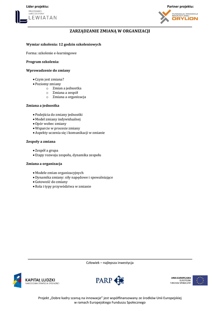 Lider projektu: Partner projektu: ZARZĄDZANIE ZMIANĄ W ORGANIZACJI Wymiar szkolenia: 12 godzin szkoleniowych Forma: szkolenie e-learningowe Program szkolenia: Wprowadzenie do zmiany Czym jest zmiana? Poziomy zmiany o Zmian a jednostka o Zmiana a zespół o Zmiana a organizacja Zmiana a jednostka Podejścia do zmiany jednostki Model zmiany indywidualnej Opór wobec zmiany Wsparcie w procesie zmiany Aspekty uczenia się i komunikacji w zmianie Zespoły a zmiana Zespół a grupa Etapy rozwoju zespołu, dynamika zespołu Zmiana a organizacja Modele zmian organizacyjnych Dynamika zmiany: siły napędowe i spowalniające Gotowość do zmiany Rola i typy przywództwa w zmianie Człowiek – najlepsza inwestycja Projekt „Dobre kadry szansą na innowacje” jest współfinansowany ze środków Unii Europejskiej w ramach Europejskiego Funduszu Społecznego