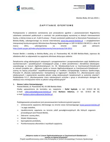 Bielsko-Biała, 02 luty 2015 r. ZAPYTANIE OFERTOWE Postepowanie o udzielenie zamówienia jest prowadzone zgodnie z postanowieniami Regulaminu udzielania zamówień publicznych o wartości nie przekraczającej wyrażonej w złotych równowartości kwoty, o której mowa w art. 4 pkt 8 ustawy – Prawo zamówień publicznych w Starostwie Powiatowym w Bielsku-Białej, udostępnionego na stronie internetowej www.bip.powiat.bielsko.pl z uwzględnieniem Interpretacji konkurencyjności Ministerstwa Rozwoju Regionalnego nr DZF-IV-82252-158 KP/11 z dnia 16 marca 2011, udostępnionej na stronie www pod adresem: http://pokl.up.gov.pl/index.php/pl/dokumenty/interpretacje/156-2011 Powiat Bielski z siedzibą w Bielsku-Białej, przy ul. Piastowskiej 40, 43-300 Bielsko-Biała, zaprasza do składania ofert w odpowiedzi na zapytanie ofertowe dotyczące zadania: Świadczenie usług edukacyjnych związanych z przygotowaniem i przeprowadzeniem zajęć dydaktycznowyrównawczych i pozalekcyjnych rozwijających pasje, a także poradnictwa i doradztwa edukacyjnozawodowego w Liceum Ogólnokształcącym im. M. Skłodowskiej-Curie w Czechowicach-Dziedzicach w ramach projektu pn.: „Aktywna nauka w Liceum Ogólnokształcącym w Czechowicach-Dziedzicach – szansą na lepszą przyszłość” współfinansowanego ze środków Europejskiego Funduszu Społecznego, Priorytet IX „Rozwój wykształcenia i kompetencji w regionach”, Działanie 9.1 „Wyrównywanie szans edukacyjnych i zapewnienie wysokiej jakości usług edukacyjnych świadczonych w systemie oświaty”, Poddziałanie 9.1.2 „Wyrównywanie szans edukacyjnych uczniów z grup o utrudnionym dostępie do edukacji oraz zmniejszanie różnic w jakości usług edukacyjnych” 1. Nazwa i adres Zamawiającego: Powiat Bielski, ul. Piastowska 40, 43-300 Bielsko-Biała. Osoby upoważniona do kontaktu ws. zapytania – Rafał Sędziak, nr tel. 33 813 68 02, e-mail: [email protected] oraz Barbara Adamus, nr tel. 33 813 68 02, e-mail: [email protected] Podstępowanie prowadzone jest poszanowaniem konkurencyjności poprzez: • Umieszczenie zapytania ofertowego na stronie www Zamawiającego (www.powiat.bielsko.pl) i w jego siedzibie, • Upublicznienie zapytania na terenie szkół ponadgimnazjalnych dla których organem prowadzącym jest Powiat Bielski, • Zebranie i ocenę ofert, • Wybór Wykonawcy, • Sporządzenie protokołu, • Poinformowania oferentów o wynikach zapytania. „Aktywna nauka w Liceum Ogólnokształcącym w Czechowicach-Dziedzicach – szansą na lepszą przyszłość” Projekt współfinansowany przez Unię Europejską w ramach Europejskiego Funduszu Społecznego 1 2. Specyfikacja zamówienia Kody CPV: 80000000-4 Usługi edukacyjne i szkoleniowe 3. Przedmiot zamówienia Przedmiotem zamówienia jest przygotowanie i przeprowadzenie zajęć dydaktyczno-wyrównawczych oraz dodatkowych pozalekcyjnych rozwijających pasje, opieki psychologiczno-pedagogicznej, a także poradnictwa i doradztwa edukacyjno-zawodowego dla uczniów Liceum Ogólnokształcącego im. M. Skłodowskiej-Curie, dla której Powiat jest organem prowadzącym. Zajęcia wyrównawcze będą przeznaczone dla uczniów o niskich wynikach w nauce i mają na celu podniesienie poziomu ich wiedzy, zajęcia dodatkowe pozalekcyjne rozwijające pasje będą przeznaczone dla uczniów z uzdolnieniami. Ich treść merytoryczna będzie zawierać treści wykraczające poza program nauczania. Dla każdej grupy wykonawca samodzielnie określi poziom wiedzy na początku realizacji zamówienia i dostosuje program zajęć do poziomu i potrzeb grupy. W ramach realizacji zamówienia wykonawca przeprowadzi na początku i na końcu zajęć testy wiedzy uczestników, tak aby możliwe było określenie poziomu wzrostu wiedzy. Zajęcia będą odbywały się w salach lekcyjnych i salach gimnastycznych szkoły objętej projektem. Szczegółowy harmonogram zostanie ustalony z wybranym wykonawcą po podpisaniu umowy. W ramach projektu Zamawiający przewiduje realizację następujących zajęć: Zajęcia dydaktyczno-wyrównawcze: 1. j. polski (4gr. x24h=96h) 2. j. angielski (4gr. x24h=96h) 3. matematyka ((4gr. x24h=96h) Zajęcia pozalekcyjne: 1. j. polski (2gr. x48h=96h) 2. j. angielski (3gr. x48h=144h) 3. j. niemiecki (1gr. x48h) 4. j. francuski (1gr. x48h) 5. matematyka (3gr. x48h=144h) 6. fizyka (1gr. x48h) 7. chemia (1gr. x48h) 8. biologia (1gr. x48h) 9. geografia (1gr. x48h) 10. historia (1gr. x48h) 11. Wiedza o Społeczeństwie (1gr. x48h) 12. Informatyka (1gr. x48h) 13. Sportowo-integracyjne (3gr x48h=144h) 14. Społeczno-kulturalne (2gr x48h=96h) 15. Pomoc i wsparcie psychologiczno-pedagogiczne (zajęcia indywidualne – 40Ux 2h - ogółem 80h) Szkolny Ośrodek Kariery: 1. Doradztwo edukacyjno-zawodowe (zajęcia indywidualne 50U x2h – ogółem 100h). W ramach realizacji zajęć Wykonawca zobowiązany będzie zrealizować: 1) Testy wiedzy na początku i na końcu zajęć (poza sportowo-rekreacyjnymi, społecznokulturalnymi i psychologicznymi), 2) Opracowanie programu zajęć, „Aktywna nauka w Liceum Ogólnokształcącym w Czechowicach-Dziedzicach – szansą na lepszą przyszłość” Projekt współfinansowany przez Unię Europejską w ramach Europejskiego Funduszu Społecznego 2 3) Przeprowadzenie zajęć zgodnie z harmonogramem, 4) Analizę porównawczą testów wiedzy (poza sportowo-rekreacyjnymi, społecznokulturalnymi i psychologicznymi). 4. Zamawiający dopuszcza składanie ofert częściowych. Oferty częściowe wykonawcy mogą składać na realizację jednej lub większej liczby części. Zamówienie zostało podzielone przez Zamawiającego na następujące części: • Część 1 – zajęcia dydaktyczno-wyrównawcze – język polski w zakresie tworzenia własnych tekstów – 1gr x 24h • Część 2 – zajęcia dydaktyczno-wyrównawcze – język polski w zakresie tworzenia wypowiedzi ustnych – 1gr x 24h • Część 3 – zajęcia dydaktyczno-wyrównawcze – język polski w zakresie 