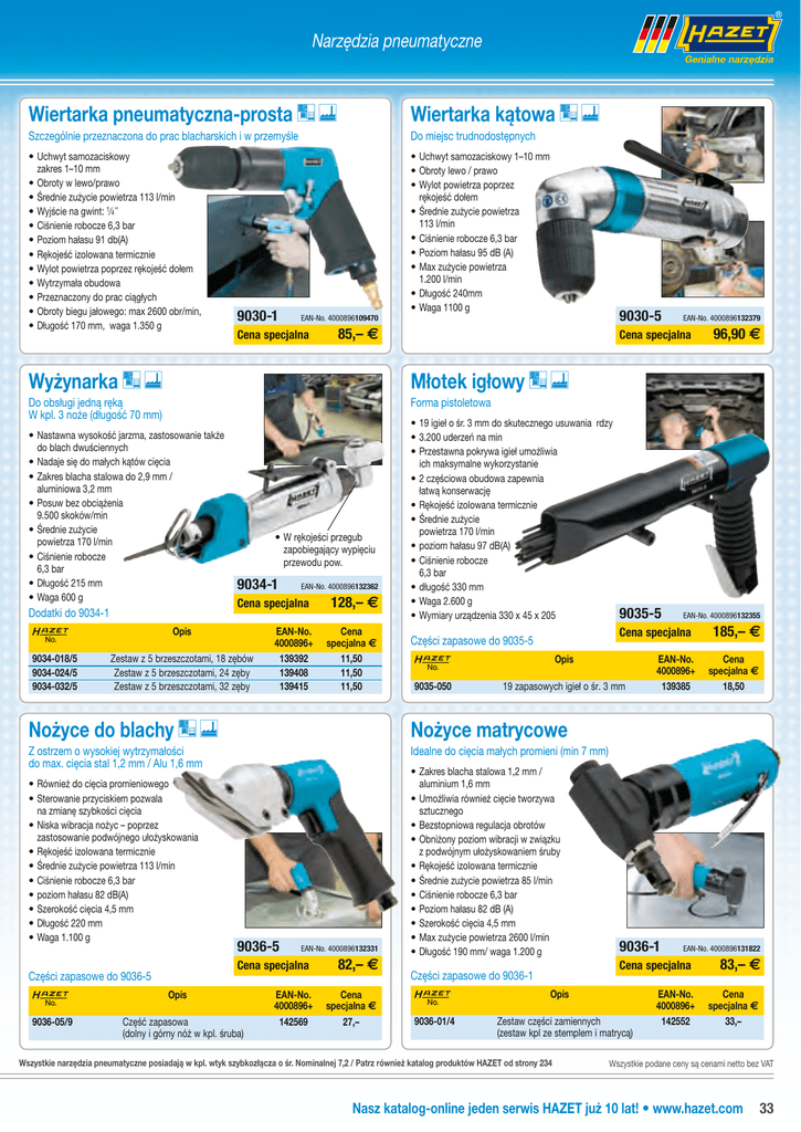 Narzędzia pneumatyczne Genialne narzędzia Wiertarka pneumatyczna-prosta S X Wiertarka kątowa S X Szczególnie przeznaczona do prac blacharskich i w przemyśle Do miejsc trudnodostępnych •Uchwyt samozaciskowy zakres 1–10 mm •Obroty w lewo/prawo •Średnie zużycie powietrza 113 l/min •Wyjście na gwint: 1⁄4” •Ciśnienie robocze 6,3 bar •Poziom hałasu 91 db(A) •Rękojeść izolowana termicznie •Wylot powietrza poprzez rękojeść dołem •Wytrzymała obudowa •Przeznaczony do prac ciągłych •Obroty biegu jałowego: max 2600 obr/min, •Długość 170 mm, waga 1.350 g •Uchwyt samozaciskowy 1–10 mm •Obroty lewo / prawo •Wylot powietrza poprzez rękojeść dołem •Średnie zużycie powietrza 113 l/min •Ciśnienie robocze 6,3 bar •Poziom hałasu 95 dB (A) •Max zużycie powietrza 1.200 l/min •Długość 240mm •Waga 1100 g 9030-1 EAN-No.4000896109470 Cena specjalna 9030-5 85,– W Cena specjalna Wyżynarka S X Młotek igłowy S X Do obsługi jedną ręką W kpl. 3 noże (długość 70 mm) Forma pistoletowa •Nastawna wysokość jarzma, zastosowanie także do blach dwuściennych •Nadaje się do małych kątów cięcia •Zakres blacha stalowa do 2,9 mm / aluminiowa 3,2 mm •Posuw bez obciążenia 9.500 skoków/min •Średnie zużycie powietrza 170 l/min •Ciśnienie robocze 6,3 bar •Długość 215 mm •Waga 600 g Dodatki do 9034-1 1 9034-018/5 9034-024/5 9034-032/5 •W rękojeści przegub zapobiegający wypięciu przewodu pow. 9034-1 EAN-No.4000896132362 Cena specjalna Opis Zestaw z 5 brzeszczotami, 18 zębów Zestaw z 5 brzeszczotami, 24 zęby Zestaw z 5 brzeszczotami, 32 zęby EAN-No. 4000896+ 139392 139408 139415 128,– W Cena specjalna ø 11,50 11,50 11,50 •19 igieł o śr. 3 mm do skutecznego usuwania rdzy •3.200 uderzeń na min •Przestawna pokrywa igieł umożliwia ich maksymalne wykorzystanie •2 częściowa obudowa zapewnia łatwą konserwację •Rękojeść izolowana termicznie •Średnie zużycie powietrza 170 l/min •poziom hałasu 97 dB(A) •Ciśnienie robocze 6,3 bar •długość 330 mm •Waga 2.600 g •Wymiary urządzenia 330 x 45 x 205 Części zapasowe do 9035-5 Części zapasowe do 9036-5 1 9036-05/9 EAN-No.4000896132331 Cena specjalna 82,– W EAN-No. 4000896+ 142569 Cena specjalna ø 27,– Opis Część zapasowa (dolny i górny nóż w kpl. śruba) EAN-No. 4000896+ 139385 Cena specjalna ø 18,50 19 zapasowych igieł o śr. 3 mm Idealne do cięcia małych promieni (min 7 mm) •Zakres blacha stalowa 1,2 mm / aluminium 1,6 mm •Umożliwia również cięcie tworzywa sztucznego •Bezstopniowa regulacja obrotów •Obniżony poziom wibracji w związku z podwójnym ułożyskowaniem śruby •Rękojeść izolowana termicznie •Średnie zużycie powietrza 85 l/min •Ciśnienie robocze 6,3 bar •Poziom hałasu 82 dB (A) •Szerokość cięcia 4,5 mm •Max zużycie powietrza 2600 l/min •Długość 190 mm/ waga 1.200 g Części zapasowe do 9036-1 1 9036-01/4 9036-1 EAN-No.4000896131822 Cena specjalna 83,– W EAN-No. 4000896+ 142552 Cena specjalna ø 33,– Opis Zestaw części zamiennych (zestaw kpl ze stemplem i matrycą) Wszystkie narzędzia pneumatyczne posiadają w kpl. wtyk szybkozłącza o śr. Nominalnej 7,2 / Patrz również katalog produktów HAZET od strony 234 EAN-No.4000896132355 185,– W 9035-050 Nożyce matrycowe 96,90 W Cena specjalna Opis Z ostrzem o wysokiej wytrzymałości do max. cięcia stal 1,2 mm / Alu 1,6 mm 9036-5 9035-5 1 Nożyce do blachy S X •Również do cięcia promieniowego •Sterowanie przyciskiem pozwala na zmianę szybkości cięcia •Niska wibracja nożyc – poprzez zastosowanie podwójnego ułożyskowania •Rękojeść izolowana termicznie •Średnie zużycie powietrza 113 l/min •Ciśnienie robocze 6,3 bar •poziom hałasu 82 dB(A) •Szerokość cięcia 4,5 mm •Długość 220 mm •Waga 1.100 g EAN-No.4000896132379 Wszystkie podane ceny są cenami netto bez VAT Nasz katalog-online jeden serwis Hazet już 10 lat! • www.hazet.com 33 Narzędzia pneumatyczne Nitownica (pneumatyczna / hydrauliczna) Nitownica (pneumatyczna / hydrauliczna) W kpl. zintegrowany system podciśnienia do usuwania zużytych nitów Do pracy ciągłej z nitami ze stali, aluminium ,stali nierdzewnej, miedzi do 6,4 mm •Do pracy ciągłej z nitami ze stali, stali nierdzewnej, aluminium, miedzi. •Możliwe średnice nitów 3 – 3,2 – 4,0 – 4,8 mm •Lekka i odporna obudowa wykonana z tworzywa •Średnie zużycie powietrza: 2 l/suw •Wyjście na gwint: 1⁄4” •Ciśnienie robocze: 6,3 bar •Poziom hałasu: Lp A 75 dB(A) •Moc: 10.700 N •Długość: 290 mm •Waga: 1.600 g 9037-1 •Możliwe średnice nitów: 2,4 – 3,2 – 4,0 – 4,8 – 5,6 i 6,4 mm •6 głowic (głowica 4,8 jest zamontowana) •Złącze obrotowe •Z trwałą obudową wykonaną z metalu •Średnie zużycie powietrza: 1,8 l/suw •Wyjście na gwint: 1⁄4” •Ciśnienie robocze: 6,3 bar •Posuw: 19 mm •Długość: 260 mm •Waga: 2.000 g 9037-2 EAN-No.4000896150175 Cena specjalna 197,– W Nitownica pneumatycznohydrauliczna Do nitów miękkich nitów o śr. Do wszystkich mm od 2,4 do 6,4 7N Duża moc 13.84 praca Niezwykle cicha (A) Lp A 73,3 dB towym do Ze złączem obroej pracy wygodniejsz EAN-No.4000896153466 Cena specjalna Nowość special worldwide | 2009 319,– W części w walizce z sztucznego Przecinak pneumatyczny-zestaw 6tworzywa Narzędzie opracowane do prac karoseryjnych ze sprężonym powietrzem oraz w przemyśle •Znakomicie nadaje się do usuwania śrub mocno zardzewiałych •Wejście: h 10 mm •Regulacja szybkości uderzeń spustem •Wyjście na gwint: 1⁄4” •Ciśnienie robocze: 6,3 bar •Rękojeść izolowana termicznie •W kpl. 5 przecinaków (każdy o dł. 175mm) •Waga: 1.700 g •Możliwe średnice nitów: 2,4 – 3 – 3,2 – 4,0 – 4,8 mm •Z trwałą obudową wykonaną z metalu •Średnie zużycie powietrza: 1 l/suw •Wyjście na gwint: 1⁄4” •Ciśnien