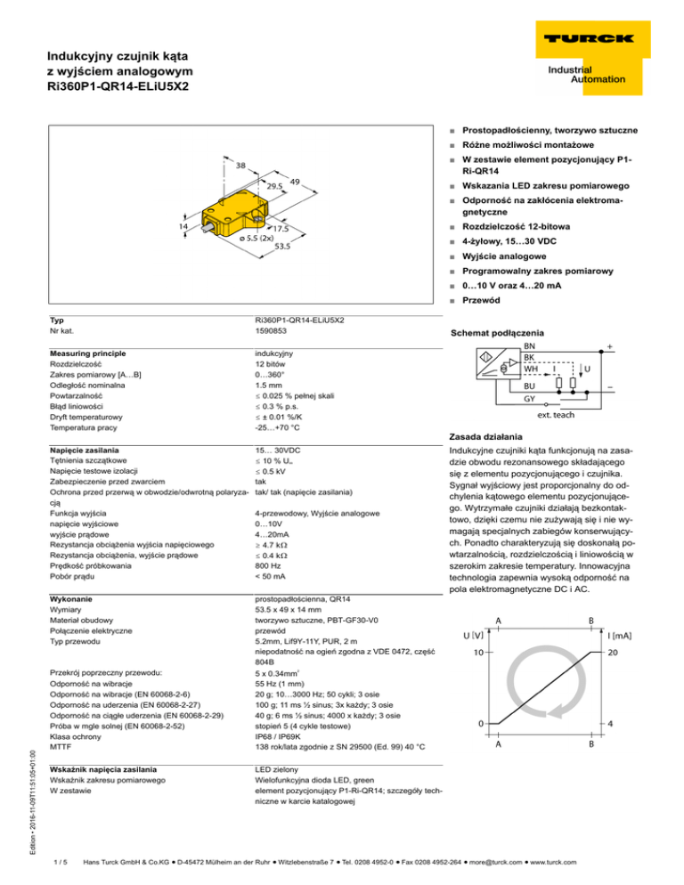 Indukcyjny czujnik kąta z wyjściem analogowym Ri360P1-QR14-ELiU5X2 ■ Prostopadłościenny, tworzywo sztuczne ■ Różne możliwości montażowe ■ W zestawie element pozycjonujący P1Ri-QR14 ■ Wskazania LED zakresu pomiarowego ■ Odporność na zakłócenia elektromagnetyczne ■ Rozdzielczość 12-bitowa ■ 4-żyłowy, 15…30 VDC ■ Wyjście analogowe ■ Programowalny zakres pomiarowy ■ 0…10 V oraz 4…20 mA Edition • 2016-11-09T11:51:05+01:00 ■ Przewód Typ Nr kat. Ri360P1-QR14-ELiU5X2 1590853 Measuring principle Rozdzielczość Zakres pomiarowy [A…B] Odległość nominalna Powtarzalność Błąd liniowości Dryft temperaturowy Temperatura pracy indukcyjny 12 bitów 0…360° 1.5 mm ð 0.025 % pełnej skali ð 0.3 % p.s. ð ± 0.01 %/K -25…+70 °C Napięcie zasilania Tętnienia szczątkowe Napięcie testowe izolacji Zabezpieczenie przed zwarciem Ochrona przed przerwą w obwodzie/odwrotną polaryzacją Funkcja wyjścia napięcie wyjściowe wyjście prądowe Rezystancja obciążenia wyjścia napięciowego Rezystancja obciążenia, wyjście prądowe Prędkość próbkowania Pobór prądu 15… 30VDC ð 10 % Uss ð 0.5 kV tak tak/ tak (napięcie zasilania) Wykonanie Wymiary Materiał obudowy Połączenie elektryczne Typ przewodu prostopadłościenna, QR14 53.5 x 49 x 14 mm tworzywo sztuczne, PBT-GF30-V0 przewód 5.2mm, Lif9Y-11Y, PUR, 2 m niepodatność na ogień zgodna z VDE 0472, część 804B Przekrój poprzeczny przewodu: 5 x 0.34mm 55 Hz (1 mm) 20 g; 10…3000 Hz; 50 cykli; 3 osie 100 g; 11 ms ½ sinus; 3x każdy; 3 osie 40 g; 6 ms ½ sinus; 4000 x każdy; 3 osie stopień 5 (4 cykle testowe) IP68 / IP69K 138 rok/lata zgodnie z SN 29500 (Ed. 99) 40 °C Odporność na wibracje Odporność na wibracje (EN 60068-2-6) Odporność na uderzenia (EN 60068-2-27) Odporność na ciągłe uderzenia (EN 60068-2-29) Próba w mgle solnej (EN 60068-2-52) Klasa ochrony MTTF Wskaźnik napięcia zasilania Wskaźnik zakresu pomiarowego W zestawie 1/5 4-przewodowy, Wyjście analogowe 0…10V 4…20mA ï 4.7 kò ð 0.4 kò 800 Hz < 50 mA Schemat podłączenia Zasada działania Indukcyjne czujniki kąta funkcjonują na zasadzie obwodu rezonansowego składającego się z elementu pozycjonującego i czujnika. Sygnał wyjściowy jest proporcjonalny do odchylenia kątowego elementu pozycjonującego. Wytrzymałe czujniki działają bezkontaktowo, dzięki czemu nie zużywają się i nie wymagają specjalnych zabiegów konserwujących. Ponadto charakteryzują się doskonałą powtarzalnością, rozdzielczością i liniowością w szerokim zakresie temperatury. Innowacyjna technologia zapewnia wysoką odporność na pola elektromagnetyczne DC i AC. 2 LED zielony Wielofunkcyjna dioda LED, green element pozycjonujący P1-Ri-QR14; szczegóły techniczne w karcie katalogowej Hans Turck GmbH & Co.KG ñ D-45472 Mülheim an der Ruhr ñ Witzlebenstraße 7 ñ Tel. 0208 4952-0 ñ Fax 0208 4952-264 ñ [email protected] ñ www.turck.com Indukcyjny czujnik kąta z wyjściem analogowym Ri360P1-QR14-ELiU5X2 Adapter podłączeniowy zapewniający większą elastyczność Szeroki zakres akcesoriów montażowych ułatwiających dostosowanie do różnych średnic wałka. Funkcja diody LED Napięcie zasilania Zielona: Zasilanie zał. Zakres pomiarowy Zielona: Element pozycjonujący jest w zakresie pomiarowym Zielona migająca: Element pozycjonujący w zakresie pomiarowym, sygnał niski (np. za duża odległość) Dioda LED jest wyłączona: Element pozycjonujący poza zakresem detekcji Indukcyjna zasada pomiaru zapewnia bezpieczeństwo funkcjonalne W oparciu o zasadę oddziaływania obwodów RLC, czujnik działa całkowicie bezkontaktowo i jest odporny na namagnesowane opiłki metali czy inne zakłócenia. W przypadku odchyleń elementu pozycjonującego od położenia idealnego, sygnał wyjściowy pozostaje prawie niezmienny. Pomimo, że wartość nominalna między czujnikiem i elementem pozycjonującym wynosi 1,5mm Edition • 2016-11-09T11:51:05+01:00 to może ona zwiększyć się nawet do 5 mm. 2/5 Hans Turck GmbH & Co.KG ñ D-45472 Mülheim an der Ruhr ñ Witzlebenstraße 7 ñ Tel. 0208 4952-0 ñ Fax 0208 4952-264 ñ [email protected] ñ www.turck.com Indukcyjny czujnik kąta z wyjściem analogowym Ri360P1-QR14-ELiU5X2 Instrukcje uczące Indywidualnie (nauka z elementem pozycjonującym) Mostek z wejściem uczącym Masa Ub pin 5 (szary) Pin 3 (nieb.) Pin 1 (brąz.) LED 2 sekundy wartość startowa wartość końcowa 10 sekund Rotacja CCW i powrót do ostat- Rotacja CW i powrót do ostatniej po 10 sek. dioda LED stanu szyb- niej wprowadzonej wartości wprowadzonej wartości ko miga przez 2 sek. ustawienia domyślne (360°, CW) po 15 sek. diody LED stanu i zasi- dioda LED stanu miga, po 2 sek. świeci stale 15 sekund - lania migają na zmianę Tryb ustawień fabrycznych (nauka bez elementu pozycjonującego) Mostek z wejściem uczącym Masa Ub pin 5 (szary) Pin 3 (nieb.) Pin 1 (brąz.) LED 2 sekundy aktywowanie trybu ustawień aktywowanie trybu ustawień 10 sekund Rotacja CCW i powrót do Rotacja CW i powrót do ostatniej dioda LED stanu świeci stale, po 2 sek. miga ostatniej wprowadzonej warto- wprowadzonej wartości po 10 sek. dioda LED stanu szybko miga przez 2 sek. ści 15 sekund - ustawienia domyślne (360°, CW) po 15 sek. diody LED stanu i zasilania migają na zmianę Zakres kątowy Masa Ub Pin 3 (nieb.) Pin 1 (brąz.) dioda LED stanu naciśnij raz - 1 x mignięcie 45° naciśnij dwa razy - 2 x mignięcie 60° naciśnij trzy razy - 3 x mignięcie 90° - naciśnij raz 1 x mignięcie 180° - naciśnij dwa razy 2 x mignięcie 270° - naciśnij trzy razy 3 x mignięcie 360° - naciśnij cztery razy 4 x mignięcie Edition • 2016-11-09T11:51:05+01:00 30° 3/5 Hans Turck GmbH & Co.KG ñ D-45472 Mülheim an der Ruhr ñ Witzlebenstraße 7 ñ Tel. 0208 4952-0 ñ Fax 0208 4952-264 ñ [email protected] ñ www.turck.com Indukcyjny czujnik kąta z wyjściem analogowym Ri360P1-QR14-ELiU5X2 Akcesoria montażowe Typ N