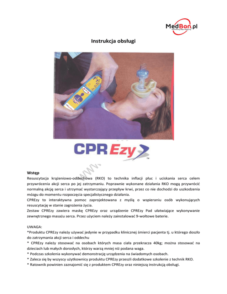 Instrukcja obsługi Wstęp Resuscytacja krążeniowo-oddechowa (RKO) to technika inflacji płuc i uciskania serca celem przywrócenia akcji serca po jej zatrzymaniu. Poprawnie wykonane działania RKO mogą przywrócid normalną akcję serca i utrzymad wystarczający przepływ krwi, przez co nie dochodzi do uszkodzenia mózgu do momentu rozpoczęcia specjalistycznego działania. CPREzy to interaktywna pomoc zaprojektowana z myślą o wspieraniu osób wykonujących resuscytację w stanie zagrożenia życia. Zestaw CPREzy zawiera maskę CPREzy oraz urządzenie CPREzy Pad ułatwiające wykonywanie zewnętrznego masażu serca. Przez użyciem należy zainstalowad 9-woltowe baterie. UWAGA: *Produktu CPREzy należy używad jedynie w przypadku klinicznej śmierci pacjenta tj. u którego doszło do zatrzymania akcji serca i oddechu * CPREzy należy stosowad na osobach których masa ciała przekracza 40kg; można stosowad na dzieciach lub małych dorosłych, którzy warzą mniej niż podana waga. * Podczas szkolenia wykonywad demonstrację urządzenia na świadomych osobach. * Zaleca się by wszyscy użytkownicy produktu CPREzy przeszli dodatkowe szkolenie z technik RKO. * Ratownik powinien zaznajomid się z produktem CPREzy oraz niniejszą instrukcją obsługi. INSTRUKCJA OBSŁUGI CPREzy PAD 1. Postępowad zgodnie z pierwszymi krokami resuscytacji (BLS) sprawdzając bezpieczeostwo miejsca oraz oznaki życia poszkodowanego. 2. Jeśli pacjent jest świadomy – wezwad pomoc. 3. Jeśli pacjent nie jest świadomy, natychmiast wezwad pomoc i udrożnid drogi oddechowe. 4. Sprawdzid czy pacjent oddycha. Jeśli nie, wezwad pogotowie i rozpocząd reanimację. 5. Umieścid CPREzy Pad na klatce piersiowej pacjenta w dolnej części mostka – na środku klatki piersiowej. 6. Włączyd urządzenie CPREzy Pad. Uruchomiony zostanie dźwięk – 100 uderzeo na minutę. 7. Wybrad odpowiednią kategorię uciśnięd określając wielkośd pacjenta. W razie niepewności zastosowad następującą, najwyższą kategorię Wielkośd Waga Uciśnięcia klatki piersiowej Dziecko: 40-54kg 4-5cm Miały dorosły: 55-75kg 4-5cm Średni dorosły: 75-89kg 4-5cm Duży dorosły: 90-104kg 4-5cm Bardzo duży dorosły: >= 105kg 4-5cm 8. Z wyprostowanymi rękoma i połączonymi/zablokowanymi palcami, pochylid się bezpośrednio nad pacjentem i wykonad 30 uciśnięd urządzenia CPREzy Pad według metronomu (100 uderzeo na minutę). 9. Wskaźniki na urządzeniu wskazują stosowaną siłę uciśnięd. Ratownik powinien uciskad klatkę tak mocno, by uzyskad odpowiednią siłę do wielkości pacjenta. Następnie można użyd odpowiedniego wskaźnika by uzyskad odpowiednią głębokośd nacisku. 10. Po 30 uciśnięciach podad 2 wdechy przy użyciu maski CPREzy (patrz instrukcja dot. zakładania maski). 11. Jeśli reanimację wykonuje więcej niż jeden ratownik, celem uniknięcia zmęczenia należy zmieniad się po każdych 2 minutach przeprowadzania RKO. 12. Kontynuowad wykonywanie 30 uciśnięd, po których należy podad 2 wdechy do momentu przybycia pomocy medycznej, która przejmie działania resuscytacyjne, pacjent zacznie oddychad normalnie lub ratownik jest w stanie fizycznego zmęczenia uniemożliwiającego kontynuowanie działao. Uwaga: Niniejsza instrukcja nie jest pełnym przewodnikiem przedstawiającym techniki RKO i nie zastępuje szkolenia z tego zakresu. 30 uciśnięd: 2 wdechy 100 uciśnięd na minutę INSTRUKCJA ZAKŁADANIA MASKI 1. Włożyd ustnik do otworu maski. Przekręcid go tak, by uzyskad odpowiednią pozycję do wykonania wdechu. 2. Umieścid maskę wokół ust i nosa pacjenta i upewnid się, że rurka ustna jest umieszczona między zębami pacjenta. 3. Trzymając maskę i brodę pacjenta ręką delikatnie odgiąd głowę pacjenta do tyłu tak, by uzyskad prawidłową pozycję do wykonywania działao RKO. 4. Z założoną maską, podad dwa wdechy przez ustnik przy każdym wdechu obserwując unoszenie i opadanie klatki piersiowej. Jeśli klatka nie unosi się należy sprawdzid czy nie doszło do zablokowania dróg oddechowych lub czy maska została prawidłowo założona. Kiedy wezwad pomoc? Jeśli możliwe jest przeprowadzenie reanimacji przez dwóch ratowników, jeden powinien rozpocząd działania RKO a drugi służyd jako wsparcie. W przypadku dzieci lub niemowląt jeśli dostępny jest tylko jeden ratownik, należy przeprowadzid 1-minutową reanimację a następnie udad się po pomoc. Jeśli poszkodowanym jest niemowlę lub małe dziecko możliwe jest zabranie ich ze sobą. Jeśli zatrzymanie było nagłe tj. niewywołane przez uraz lub zatrucie a ofiarą jest dziecko z historią chorób serca, należy natychmiast wezwad pomoc. Czyszczenie Maska CPREzy jest maską wielokrotnego użytku. Czyścid zanurzając ją w roztworze wybielacza (1:50) na 10 minut. Nie należy pasteryzowad, gotowad lub sterylizowad w autoklawie. Ustnik może byd czyszczony i ponownie zastosowany na fantomie. Niemniej zaleca się wyrzucid ustnik po stosowaniu na pacjencie. Ustnik jest łatwo odłącza się od maski CPREzy i może byd zakupiony osobno. Automatyczne sprawdzanie baterii Po włączeniu urządzenia CPREzy Pad słyszalne są 3 dźwięki. Oznacza to automatyczne sprawdzanie baterii. 3 ostre dźwięki – baterie naładowane 3 niskie tony i mrugający czerwony wskaźnik – niski poziom naładowania baterii Baterie muszą byd wymienione raz w roku lub wcześniej jeśli wskaże na to urządzenie sprawdzające ich poziom. Zatrzymywanie metronomu Urządzenie CPREzy Pad jest fabrycznie ustawione by emitowad dźwięki – 100 uderzeo na minutę, co stanowi zalecaną szybkośd uciśnięd podczas wykonywania RKO. By wyciszyd metronom należy przytrzymad przycisk „On/Off” przez 5 sekund. Po tym czasie urządzenie CPREzy zostanie wyciszone. Urządzenie pozostaje wyciszone do momentu wyłączenia i ponownego uruchomienia. By z powrotem przywrócid dźwięk metronomu należy powtórzyd powyższą procedurę. Rozwiązywanie problemów Jeśl