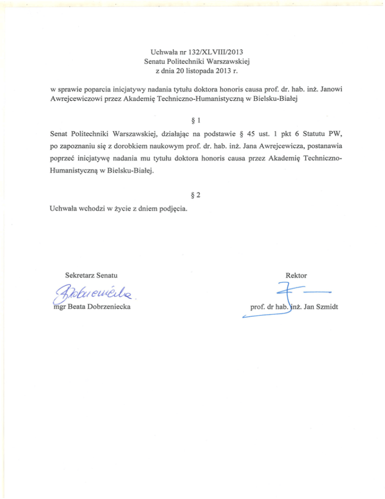 Uchwala nr 132/XLVIIII2013 Senatu Politechniki Warszawskiej z dnia 20 listopada 2013 r. w sprawie poparcia inicjatywy nadania tytulu doktora honoris causa prof. dr. hab. inz. lanowi Awrejcewiczowi przez Akademiy Techniczno-Humanistyczn,! w Bielsku-Bialej §1 Senat Politechniki Warszawskiej, dzialaj,!c na podstawie § 45 ust. 1 pkt 6 Statutu PW, po zapoznaniu siy z dorobkiem naukowym prof. dr. hab. inz. lana Awrejcewicza, postanawia poprzec inicjatywy nadania mu tytulu doktora honoris causa przez Akademiy Techniczno Humanistyczn,! w Bielsku-Bialej. §2 Uchwala wchodzi w zycie z dniem podjycia. Sekretarz Senatu fJ?vfvf'~ . mgr Beata Dobrzeniecka Rektor