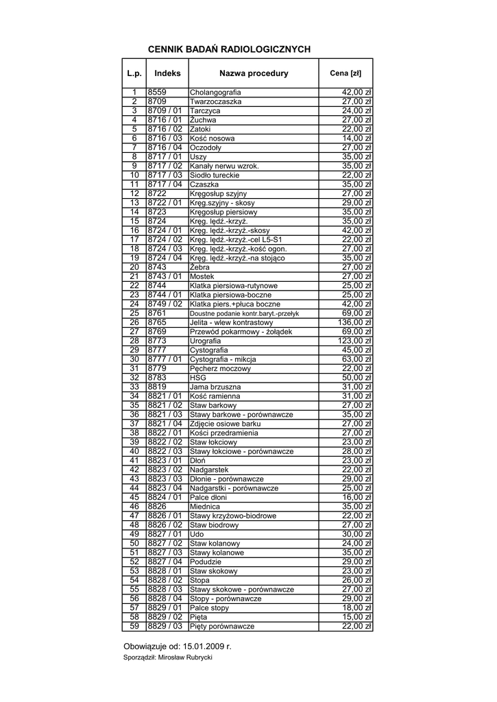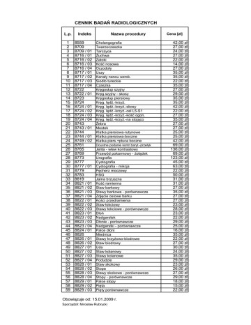 CENNIK BADAŃ RADIOLOGICZNYCH L.p. 1 2 3 4 5 6 7 8 9 10 11 12 13 14 15 16 17 18 19 20 21 22 23 24 25 26 27 28 29 30 31 32 33 34 35 36 37 38 39 40 41 42 43 44 45 46 47 48 49 50 51 52 53 54 55 56 57 58 59 Indeks Nazwa procedury 8559 8709 8709 / 01 8716 / 01 8716 / 02 8716 / 03 8716 / 04 8717 / 01 8717 / 02 8717 / 03 8717 / 04 8722 8722 / 01 8723 8724 8724 / 01 8724 / 02 8724 / 03 8724 / 04 8743 8743 / 01 8744 8744 / 01 8749 / 02 8761 8765 8769 8773 8777 8777 / 01 8779 8783 8819 8821 / 01 8821 / 02 8821 / 03 8821 / 04 8822 / 01 8822 / 02 8822 / 03 8823 / 01 8823 / 02 8823 / 03 8823 / 04 8824 / 01 8826 8826 / 01 8826 / 02 8827 / 01 8827 / 02 8827 / 03 8827 / 04 8828 / 01 8828 / 02 8828 / 03 8828 / 04 8829 / 01 8829 / 02 8829 / 03 Cholangografia Twarzoczaszka Tarczyca Żuchwa Zatoki Kość nosowa Oczodoły Uszy Kanały nerwu wzrok. Siodło tureckie Czaszka Kręgosłup szyjny Kręg.szyjny - skosy Kręgosłup piersiowy Kręg. lędź.-krzyż. Kręg. lędź.-krzyż.-skosy Kręg. lędź.-krzyż.-cel L5-S1 Kręg. lędź.-krzyż.-kość ogon. Kręg. lędź.-krzyż.-na stojąco Żebra Mostek Klatka piersiowa-rutynowe Klatka piersiowa-boczne Klatka piers.+płuca boczne Doustne podanie kontr.baryt.-przełyk Jelita - wlew kontrastowy Przewód pokarmowy - żołądek Urografia Cystografia Cystografia - mikcja Pęcherz moczowy HSG Jama brzuszna Kość ramienna Staw barkowy Stawy barkowe - porównawcze Zdjęcie osiowe barku Kości przedramienia Staw łokciowy Stawy łokciowe - porównawcze Dłoń Nadgarstek Dłonie - porównawcze Nadgarstki - porównawcze Palce dłoni Miednica Stawy krzyżowo-biodrowe Staw biodrowy Udo Staw kolanowy Stawy kolanowe Podudzie Staw skokowy Stopa Stawy skokowe - porównawcze Stopy - porównawcze Palce stopy Pięta Pięty porównawcze Obowiązuje od: 15.01.2009 r. Sporządził: Mirosław Rubrycki Cena [zł] 42,00 zł 27,00 zł 24,00 zł 27,00 zł 22,00 zł 14,00 zł 27,00 zł 35,00 zł 35,00 zł 22,00 zł 35,00 zł 27,00 zł 29,00 zł 35,00 zł 35,00 zł 42,00 zł 22,00 zł 27,00 zł 35,00 zł 27,00 zł 27,00 zł 25,00 zł 25,00 zł 42,00 zł 69,00 zł 136,00 zł 69,00 zł 123,00 zł 45,00 zł 63,00 zł 22,00 zł 50,00 zł 31,00 zł 31,00 zł 27,00 zł 35,00 zł 27,00 zł 27,00 zł 23,00 zł 28,00 zł 23,00 zł 22,00 zł 29,00 zł 25,00 zł 16,00 zł 35,00 zł 22,00 zł 27,00 zł 30,00 zł 24,00 zł 35,00 zł 29,00 zł 23,00 zł 26,00 zł 27,00 zł 29,00 zł 18,00 zł 15,00 zł 22,00 zł