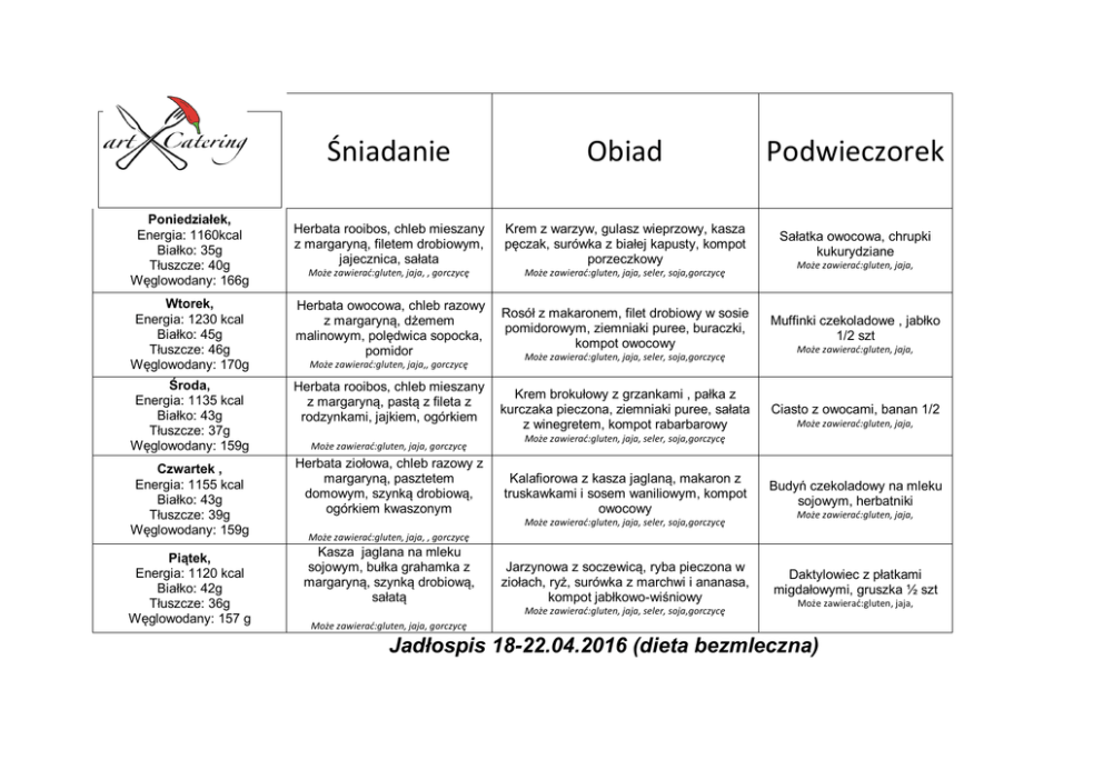 Śniadanie Obiad Podwieczorek Poniedziałek, Energia: 1160kcal Białko: 35g Tłuszcze: 40g Węglowodany: 166g Herbata rooibos, chleb mieszany z margaryną, filetem drobiowym, jajecznica, sałata Krem z warzyw, gulasz wieprzowy, kasza pęczak, surówka z białej kapusty, kompot porzeczkowy Sałatka owocowa, chrupki kukurydziane Może zawierać:gluten, jaja, , gorczycę Może zawierać:gluten, jaja, seler, soja,gorczycę Wtorek, Energia: 1230 kcal Białko: 45g Tłuszcze: 46g Węglowodany: 170g Herbata owocowa, chleb razowy z margaryną, dżemem malinowym, polędwica sopocka, pomidor Rosół z makaronem, filet drobiowy w sosie pomidorowym, ziemniaki puree, buraczki, kompot owocowy Środa, Energia: 1135 kcal Białko: 43g Tłuszcze: 37g Węglowodany: 159g Herbata rooibos, chleb mieszany z margaryną, pastą z fileta z rodzynkami, jajkiem, ogórkiem Czwartek , Energia: 1155 kcal Białko: 43g Tłuszcze: 39g Węglowodany: 159g Piątek, Energia: 1120 kcal Białko: 42g Tłuszcze: 36g Węglowodany: 157 g Może zawierać:gluten, jaja,, gorczycę Może zawierać:gluten, jaja, gorczycę Herbata ziołowa, chleb razowy z margaryną, pasztetem domowym, szynką drobiową, ogórkiem kwaszonym Może zawierać:gluten, jaja, seler, soja,gorczycę Krem brokułowy z grzankami , pałka z kurczaka pieczona, ziemniaki puree, sałata z winegretem, kompot rabarbarowy Może zawierać:gluten, jaja, Muffinki czekoladowe , jabłko 1/2 szt Może zawierać:gluten, jaja, Ciasto z owocami, banan 1/2 Może zawierać:gluten, jaja, Może zawierać:gluten, jaja, seler, soja,gorczycę Kalafiorowa z kasza jaglaną, makaron z truskawkami i sosem waniliowym, kompot owocowy Może zawierać:gluten, jaja, seler, soja,gorczycę Budyń czekoladowy na mleku sojowym, herbatniki Może zawierać:gluten, jaja, Może zawierać:gluten, jaja, , gorczycę Kasza jaglana na mleku sojowym, bułka grahamka z margaryną, szynką drobiową, sałatą Jarzynowa z soczewicą, ryba pieczona w ziołach, ryż, surówka z marchwi i ananasa, kompot jabłkowo-wiśniowy Może zawierać:gluten, jaja, seler, soja,gorczycę Daktylowiec z płatkami migdałowymi, gruszka ½ szt Może zawierać:gluten, jaja, Może zawierać:gluten, jaja, gorczycę Jadłospis 18-22.04.2016 (dieta bezmleczna)