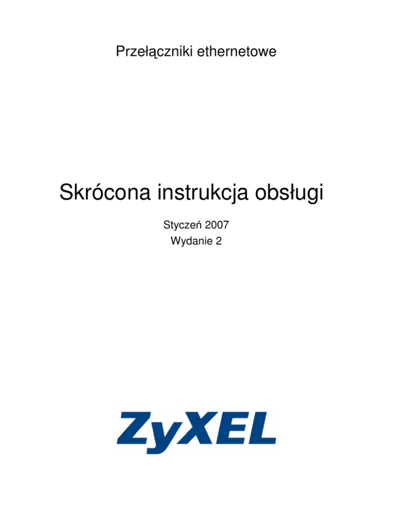 Przełączniki ethernetowe Skrócona instrukcja obsługi Styczeń 2007 Wydanie 2 1. Wprowadzenie Niniejsza instrukcja dotyczy wszystkich przełączników ethernetowych firmy ZyXEL. Twoje urządzenie może różnić się od pokazanego na poniższych ilustracjach. 2. Instalacja Wszystkie przełączniki mogą być używane jako urządzenia wolnostojące. Niektóre można również instalować na standardowych stelażach EIA. Uwaga: Aby zapewnić prawidłową wentylację, pozostaw przynajmniej 10centymetrowy odstęp z przodu, a 8-centymetrowy z tyłu przełącznika. Jeśli ustawiasz przełączniki jeden na drugim, pozostaw odstęp między nimi. 2.1. Instalacja na biurku 1. Ustaw przełącznik na równej, płaskiej powierzchni. 2. Jeśli do urządzenia dołączono luzem gumowe podstawki, przymocuj je w każdym rogu przełącznika. Podstawki te chronią przełącznik przed wstrząsami i wibracją oraz zapewniają odstęp w razie ustawiania urządzeń jedno na drugim. 2.2. Instalacja na stelażu 1. Wyrównaj wspornik z otworami na jednym boku urządzenia i przykręć go za pomocą mniejszych śrub. W podobny sposób przykręć drugi wspornik. 2. Po przykręceniu obu wsporników umieść przełącznik w stelażu i wyrównaj otwory we wspornikach z odpowiednimi otworami w stelażu. Zamocuj przełącznik za pomocą większych śrub montażowych. 3. Połączenia sprzętowe 3.1. Porty RJ-45 z automatyczną negocjacją i wykrywaniem połączeń krosowych Przełącznik jest wyposażony w porty z automatyczną negocjacją i wykrywaniem połączeń krosowych. W zależności od modelu są to albo porty Fast Ethernet (10/100 Mb/s), albo Gigabit Ethernet (10/100/1000 Mb/s). Porty automatycznie wykrywają szybkość transmisji i obsługują zarówno tryb półdupleksowy (tylko 10/100 Mb/s), jak i pełnodupleksowy. Dzięki automatycznemu wykrywaniu połączeń krosowych można podłączyć przełącznik do komputera lub koncentratora za pomocą zwykłego lub krosowego kabla ethernetowego. 3.2. Kable sieciowe Do portów RJ-45 można podłączać nieekranowane (UTP) lub ekranowane (STP) kable ethernetowe. Upewnij się, że długość kabla między gniazdami nie przekracza 100 metrów (328 stóp). W poniższej tabeli opisano typy kabli używane przy różnych szybkościach transmisji. Tabela 1. Typy kabli sieciowych SZYBKOŚĆ TYP KABLA SIECIOWEGO 10 Mb/s 100Ω 2 pary UTP/STP kategoria 3,4 lub 5 100 Mb/s 100Ω 2 pary UTP/STP kategoria 5 1000 Mb/s 100Ω 4 pary UTP/STP kategoria 5 Wskaźnik LNK/ACT powinien migać podczas przesyłania danych między przełącznikiem a podłączonym do niego urządzeniem. 3.3. Podłączanie zasilania Podłącz jeden kabel elektryczny (albo kabel zasilacza) do gniazda na tylnym panelu przełącznika, a drugi — do odpowiedniego gniazda elektrycznego. Kiedy przełącznik jest podłączony do prądu, wskaźnik PWR powinien świecić w sposób ciągły. 3.4. Port konsoli (tylko przełączniki zarządzane) Jeśli Twój przełącznik ma port konsoli, możesz nim zarządzać lokalnie za pomocą emulatora terminalu. Podłącz 9-stykową, męską wtyczkę kabla konsoli do portu w przełączniku. Podłącz wtyczkę żeńską do portu szeregowego (COM1, COM2 albo innego portu COM) w komputerze. W programie emulatora terminalu ustaw następujące parametry: • Emulacja terminala VT100 • 9600 b/s • Brak parzystości, 8 bitów danych, 1 bit stopu • Brak kontroli przepływu 4. Rozwiązywanie problemów PROBLEM ROZWIĄZANIE Po podłączeniu zasilania nie zapala się żaden ze wskaźników LED Upewnij się, że kabel elektryczny albo kabel zasilacza jest podłączony do gniazda zasilania w przełączniku i do odpowiedniego źródła prądu. Jeśli problem nie ustąpi, przełącznik prawdopodobnie jest uszkodzony; skontaktuj się ze sprzedawcą. Wskaźnik LNK/ACT nie zapala się lub nie miga po podłączeniu urządzenia Sprawdź, czy urządzenie jest włączone i prawidłowo podłączone do przełącznika. Upewnij się też, czy działa karta ethernetowa w podłączonym urządzeniu. Sprawdź, czy długość kabla sieciowego nie przekracza 100 metrów.