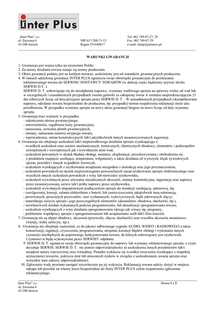 „Inter Plus” s.c. ul. Zaciszna 6 63-200 Jarocin NIP 617-209-71-12 Regon 251644817 Tel. 062 749-87-27, 28 Fax. 062 749-87-29 e-mail: [email protected] _________________________________________________________________________________________________ WARUNKI GWARANCJI 1. Gwarancja jest ważna tylko na terytorium Polski. 2. Za normy działania towaru uznaje się normy producenta. 3. Okres gwarancji podany jest na każdym towarze, uzależniony jest od warunków gwarancyjnych producenta. 4. W ramach udzielonej gwarancji INTER PLUS ogranicza swoje obowiązki gwarancyjne do przekazania reklamowanego towaru do SERWISU DOSTAWCY TOWARÓW (w dalszej części będziemy używać skrótu SERWIS D.T. ). SERWIS D. T. zobowiązuje się do nieodpłatnej naprawy, wymiany wadliwego sprzętu na sprawny wolny od wad lub w szczególnych i uzasadnionych przypadkach zwrotu gotówki za zakupiony towar w terminie nieprzekraczającym 21 dni roboczych licząc od dnia przyjęcia sprzętu przez SERWIS D. T. . W uzasadnionych przypadkach (skomplikowana naprawa, odesłanie towaru bezpośrednio do producenta, itp. przypadki) termin rozpatrzenia reklamacji może ulec przedłużeniu. W przypadku wymiany sprzętu na nowy okres gwarancji biegnie na nowo licząc od daty wymiany sprzętu. 5. Gwarancja traci ważność w przypadku: - zakończenia okresu gwarancyjnego, - unieważnienia, zagubienia karty gwarancyjnej, - naruszenia, zerwania plomb gwarancyjnych, - zmiany, zamazania numeru seryjnego towaru, - wprowadzenia, zmian konstrukcyjnych lub/i jakichkolwiek innych nieautoryzowanych ingerencji. 6. Gwarancja nie obejmuje uszkodzeń lub/i nieprawidłowego działania sprzętu wynikającego z: - wszelkich uszkodzeń oraz urazów mechanicznych, termicznych, chemicznych obudowy, elementów i podzespołów zewnętrznych i wewnętrznych jak i wywołanymi nimi wad, - uszkodzeń powstałych w skutek błędnej obsługi, montażu, eksploatacji, przechowywania i obchodzenia się z produktem (napięcie zasilające, temperatura, wilgotność), a także działania sił wyższych, klęsk żywiołowych (pożar, powódź) i innych wypadków losowych, - uszkodzeń wynikających z użytkowania urządzenia niezgodnie z instrukcją oraz jego przeznaczeniem, - uszkodzeń powstałych na skutek nieprzestrzegania powszechnych zasad użytkowania sprzętu elektronicznego oraz wszelkich innych uszkodzeń powstałych z winy lub niewiedzy użytkownika, - uszkodzeń wywołanych przez używanie niezalecanych akcesorii, zmiany konstrukcyjne, ingerencję oraz naprawy przez nieautoryzowany serwis lub/i próbę naprawy przez użytkownika, - uszkodzeń wywołanych niepoprawnym podłączeniem sprzętu do instalacji zasilającej, antenowej, itp, - zawilgocenia, korozji, zalania elektrolitem z baterii, lub zanieczyszczenia jakąkolwiek inną substancją, - przerwanych, przeciętych przewodów, oraz wyłamanych, wykrzywionych, bądź oderwanych złączy, - naturalnego zużycia sprzętu i jego poszczególnych elementów (akumulator, obudowa, słuchawki, itp.), - niewłaściwych działań wykonanych podczas programowania, lub aktualizacji oprogramowania towaru, - uszkodzeń wynikających z winy działania oprogramowania takiego jak wirusy itp. programy, - problemów współpracy sprzętu z oprogramowaniem lub urządzeniami osób lub/i firm trzecich. 7. Gwarancją nie są objęte obudowy, akcesoria (przewody, złącza, słuchawki) oraz wszelkie akcesoria montażowe (wkręty, śruby uchwyty, itp.). 8. Gwarancja nie obejmuje zastrzeżeń, co do jakości odbieranego sygnału AUDIO, WIDEO i RADIOWEGO a także konserwacji, regulacji, czyszczenia, programowania, strojenia, korekcji błędów obsługi i wykonania innych czynności niezbędnych do poprawnego funkcjonowania towaru, do których zobowiązany jest użytkownik. Czynności te będą wykonywane przez SERWISY odpłatnie. 9. SERWIS D. T. ogranicza swoje obowiązki gwarancyjne do naprawy lub wymiany reklamowanego sprzętu, o czym decyduje SERWIS. SERWIS D. T. nie ponosi odpowiedzialności za uszkodzenia innych przedmiotów lub/i urządzeń natury rzeczywistej oraz wirtualnej. Ponadto wyklucza się wszelkie roszczenia wynikające z niepełnej użyteczności towarów, pokrycia strat lub utraconych zysków w związku z uszkodzeniem, awarią sprzętu oraz wszystkie inne zakresy odpowiedzialności. 10. Zgłoszenie wady powinno nastąpić niezwłocznie po jej wykryciu. Reklamację towaru należy złożyć w miejscu zakupu lub przesłać na własny koszt bezpośrednio do firmy INTER PLUS celem rozpatrzenia zgłoszenia reklamacyjnego. Inter Plus” s.c. ul. Zaciszna 6 63-200 Jarocin Strona 1 z 2 „Inter Plus” s.c. ul. Zaciszna 6 63-200 Jarocin NIP 617-209-71-12 Regon 251644817 Tel. 062 749-87-27, 28 Fax. 062 749-87-29 e-mail: [email protected] _________________________________________________________________________________________________ 11. Warunkiem przyjęcia reklamacji przez SERWIS D. T. jest: - dostarczenie sprzętu w stanie kompletnym (wraz ze wszystkimi oryginalnymi akcesoriami oraz dokumentacją) w oryginalnym opakowaniu, - dostarczenie ważnej karty gwarancyjnej wraz z dokumentem potwierdzającym zakup towaru (paragon fiskalny lub faktura VAT zawierająca czytelną datę zakupu, nazwę produktu oraz dane sprzedawcy), - dostarczenie czytelnego opisu ujawnionej wady/usterki reklamowanego towaru poprzez wypełnienie zgłoszenia reklamacyjnego. 12. Autoryzowany serwis nie ponosi odpowiedzialności za: - utratę danych zapisanych w pamięci reklamowanych towarów, - zmiany w ustawieniach reklamowanego sprzętu, - wszelkie inne akcesoria dołączone do opakowania nie należące do oryginalnego towaru, - akcesoria oraz opakowanie, które nie zostały dostarczone wraz z reklamowanym sprzętem, - stan urządzenia oraz załączonych akcesoriów w przypadku braku oryginalnego opakowania, - stan opakowania i towaru w przypadku braku odpowiedniego zabezpieczenia podczas wysyłki do serwisu, - przedłużenie terminu rozpatrzen
