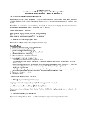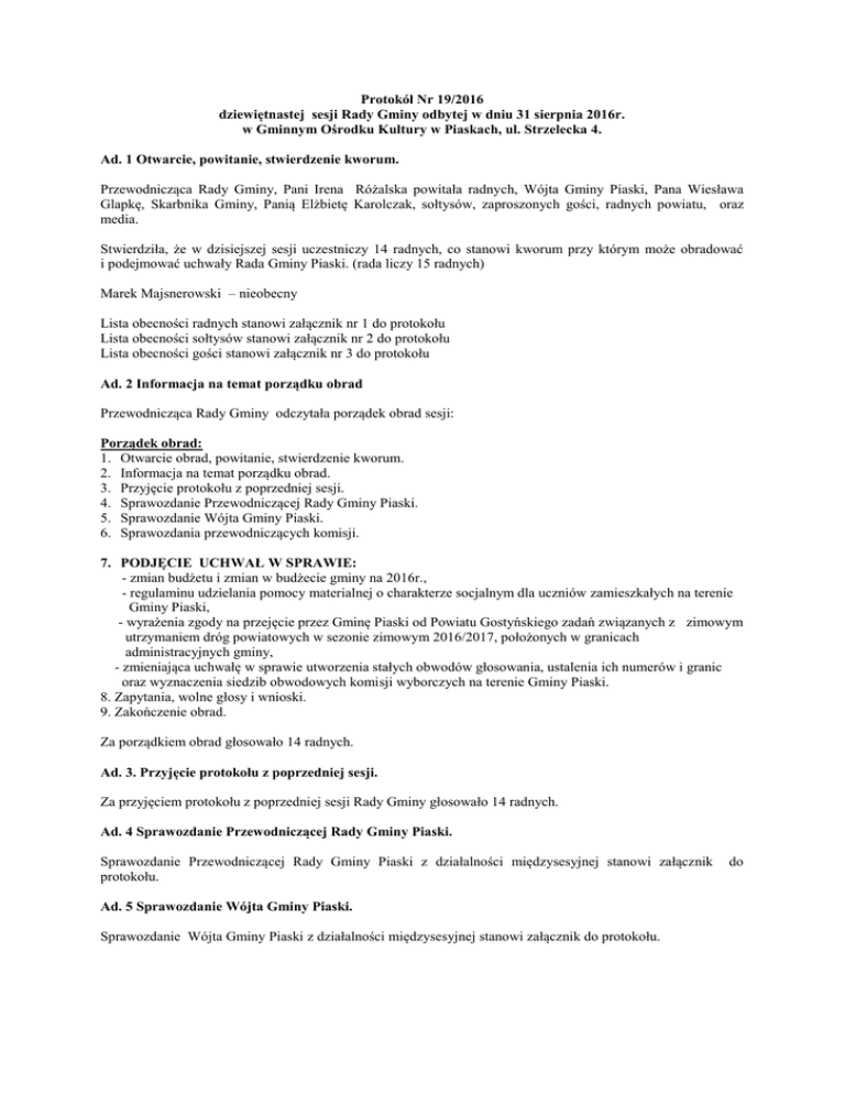 Protokół Nr 19/2016 dziewiętnastej sesji Rady Gminy odbytej w dniu 31 sierpnia 2016r. w Gminnym Ośrodku Kultury w Piaskach, ul. Strzelecka 4. Ad. 1 Otwarcie, powitanie, stwierdzenie kworum. Przewodnicząca Rady Gminy, Pani Irena Różalska powitała radnych, Wójta Gminy Piaski, Pana Wiesława Glapkę, Skarbnika Gminy, Panią Elżbietę Karolczak, sołtysów, zaproszonych gości, radnych powiatu, oraz media. Stwierdziła, że w dzisiejszej sesji uczestniczy 14 radnych, co stanowi kworum przy którym może obradować i podejmować uchwały Rada Gminy Piaski. (rada liczy 15 radnych) Marek Majsnerowski – nieobecny Lista obecności radnych stanowi załącznik nr 1 do protokołu Lista obecności sołtysów stanowi załącznik nr 2 do protokołu Lista obecności gości stanowi załącznik nr 3 do protokołu Ad. 2 Informacja na temat porządku obrad Przewodnicząca Rady Gminy odczytała porządek obrad sesji: Porządek obrad: 1. Otwarcie obrad, powitanie, stwierdzenie kworum. 2. Informacja na temat porządku obrad. 3. Przyjęcie protokołu z poprzedniej sesji. 4. Sprawozdanie Przewodniczącej Rady Gminy Piaski. 5. Sprawozdanie Wójta Gminy Piaski. 6. Sprawozdania przewodniczących komisji. 7. PODJĘCIE UCHWAŁ W SPRAWIE: - zmian budżetu i zmian w budżecie gminy na 2016r., - regulaminu udzielania pomocy materialnej o charakterze socjalnym dla uczniów zamieszkałych na terenie Gminy Piaski, - wyrażenia zgody na przejęcie przez Gminę Piaski od Powiatu Gostyńskiego zadań związanych z zimowym utrzymaniem dróg powiatowych w sezonie zimowym 2016/2017, położonych w granicach administracyjnych gminy, - zmieniająca uchwałę w sprawie utworzenia stałych obwodów głosowania, ustalenia ich numerów i granic oraz wyznaczenia siedzib obwodowych komisji wyborczych na terenie Gminy Piaski. 8. Zapytania, wolne głosy i wnioski. 9. Zakończenie obrad. Za porządkiem obrad głosowało 14 radnych. Ad. 3. Przyjęcie protokołu z poprzedniej sesji. Za przyjęciem protokołu z poprzedniej sesji Rady Gminy głosowało 14 radnych. Ad. 4 Sprawozdanie Przewodniczącej Rady Gminy Piaski. Sprawozdanie Przewodniczącej Rady Gminy Piaski z działalności międzysesyjnej stanowi załącznik protokołu. Ad. 5 Sprawozdanie Wójta Gminy Piaski. Sprawozdanie Wójta Gminy Piaski z działalności międzysesyjnej stanowi załącznik do protokołu. do Przed przystąpieniem do sprawozdań przewodniczących komisji Przewodnicząca Rady Gminy poinformowała, że na Sali znajduje się 15 radnych. W trakcie sprawozdania Wójta Gminy Piaski na obrady przybył Radny Marek Majsnerowski. Ad. 6 Sprawozdania przewodniczących komisji. Przewodnicząca Komisji Rewizyjnej, Pani Maria Wesołek złożyła sprawozdanie z posiedzenia Komisji Rewizyjnej. Radna poinformowała, że tematami kontroli komisji była: analiza wykorzystania środków z Funduszu Sołeckiego za I półrocze 2016r., analiza wykonania budżetu za I półrocze 2016 roku, analiza wydatkowania środków finansowych przez Gminny Ośrodek Pomocy Społecznej za rok 2015, informacja na temat realizacji programu rządowego 500+. Środki funduszu sołeckiego oraz informacje z wykonania budżetu szczegółowo omówiła Skarbnik Gminy, Pani Elżbieta Karolczak. Komisja rewizyjna nie wniosła uwag do w/w analiz. Sprawy dotyczące Gminnego Ośrodka Pomocy Społecznej w Piaskach oraz programu rządowego 500+ szczegółowo omówiła Pani Maria Ratajczak, Straszy pracownik Socjalny GOPS w Piaskach. Komisja Rewizyjna również nie wniosła uwag. W wolnych głosach i wnioskach poruszono tematy dotyczące: odpadów komunalnych, poboczy na drogach : Taniecznica – Grabonóg, droga koło cmentarza w Strzelcach Wielkich, czyszczenia studzienek kanalizacji deszczowej, remontów dróg, postawienia parkometru na Rynku w Piaskach, parkingu przy ul. Leśnej, sprzedaży działek na terenie Gminy, budowy sieci wodociągowej w miejscowościach Józefowo, Rębowo oraz Łódź, prowadzonych inwestycjach na terenie Gminy. Radny Stefan Śląski złożył sprawozdanie z posiedzenia trzech stałych komisji Rady. Przewodniczący poinformował, że podczas obrad komisji omawiano projekty uchwał podejmowane na dzisiejszej sesji. Zmiany budżetu szczegółowo omówiła Skarbnik Gminy. Pani Elżbieta Karolczak, poinformowała, że informacja z wykonania budżetu Gminy Piaski za I półrocze 2016r. została zamieszczona w Biuletynie Informacji Publicznej Gminy Piaski oraz przekazana do RIO dnia 16 sierpnia 2016r.Opinia RIO zostanie zamieszczona na stronie BIP Piaski. Dnia 25 sierpnia odbyła się komisja Rewizyjna, na której ww. informację omówiono szczegółowo, punkt po punkcie. Skarbnik Gminy zapytała Radnych czy ponownie przedstawiać, czy ktoś zapoznał się z informacją i w związku z tym ma pytania co do wykonania budżetu za I półrocze 2016r. Radni uznali, że jeżeli Komisja Rewizyjna zapoznała się z informacją i nie wniosła uwag, a sama informacja znajduje się na stronie Gminy, nie ma potrzeby szczegółowego omawiania. Projekt uchwały w sprawie: regulaminu udzielania pomocy materialnej o charakterze socjalnym dla uczniów zamieszkałych na terenie Gminy Piaski szczegółowo omówił Sekretarz Gminy, Pan Andrzej Konieczny. Projekty uchwał w sprawie: wyrażenia zgody na przejęcie przez Gminę Piaski od Powiatu Gostyńskiego zadań związanych z zimowym utrzymaniem dróg powiatowych w sezonie zimowym 2016/2017, położonych w granicach administracyjnych gminy oraz zmieniająca uchwałę w sprawie utworzenia stałych obwodów głosowania, ustalenia ich numerów i granic oraz wyznaczenia siedzib obwodowych komisji wyborczych na terenie Gminy Piaski szczegółowo omówił Wójt Gminy. W wolnych głosach i wnioskach Sekretarz Gminy poinformował Radnych o : składanych wnioskach i otrzymanych dofinansowaniach, programach do których przystąpi Oświata (Cyfrowa Szkoła Wielkopolsk@ 2020), 30 leciu Kapeli Piaskowianie, które odbędzie się w październiku 2016r., ponowieniu wnio