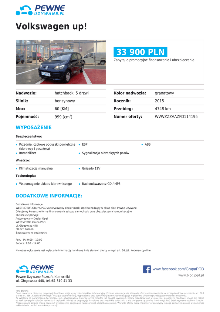 Volkswagen up! 33 900 PLN Zapytaj o promocyjne finansowanie i ubezpieczenie. Nadwozie: hatchback, 5 drzwi Kolor nadwozia: granatowy Silnik: benzynowy Rocznik: 2015 Moc: 60 [KM] Przebieg: 4748 km Pojemność: 999 [cm ] Numer oferty: WVWZZZAAZFD114195 3 WYPOSAŻENIE Bezpieczeństwo: Przednie, czołowe poduszki powietrzne (kierowcy i pasażera) Immobilizer ESP ABS Sygnalizacja niezapiętych pasów Wnętrze: Klimatyzacja manualna Gniazdo 12V Technologia: Wspomaganie układu kierowniczego Radioodtwarzacz CD / MP3 DODATKOWE INFORMACJE: Dodatkowe informacje: WESTMOTOR GRUPA PGD Autoryzowany dealer marki Opel wchodzący w skład sieci Pewne Używane. Oferujemy korzystne formy finansowania zakupu samochodu oraz ubezpieczenia komunikacyjne. Miejsce ekspozycji: Autoryzowany Dealer Opel WESTMOTOR Grupa PGD ul. Głogowska 448 60-226 Poznań Zapraszamy w godzinach: Pon. - Pt: 9:00 – 19:00 Sobota: 9:00 - 14:00 Niniejsze ogłoszenie jest wyłącznie informacją handlową i nie stanowi oferty w myśl art. 66, §1. Kodeksu cywilne Pewne Używane Poznań, Komorniki ul. Głogowska 448, tel.:61 610 41 33 www.blog.pgd.pl Nota prawna Dane zawarte w niniejszej propozycji handlowej mają wyłącznie charakter informacyjny. Podane informacje nie stanowią oferty ani zapewnienia, w szczególności w rozumieniu art. 66 § 1 oraz art. 5561 Kodeksu cywilnego. Wiążące ustalenie ceny, wyposażenia oraz specyfikacji samochodu następuje w pisemnej umowie sprzedaży/zamówienia samochodu. Ze względu na ograniczenia techniczne (np. odwzorowanie kolorów przez monitor lub sposób wydruku), kolory przedstawione w niniejszej propozycji handlowej mogą się różnić od rzeczywistych kolorów nadwozia i tapicerki. Niniejsza propozycja handlowa oraz wszelkie załączniki z nią związane są poufne i nie mogą być przekazywane osobom trzecim. Prezentowane zdjęcia mogą zawierać wyposażenie opcjonalne (akcesoryjne), dodatkowo płatne. Warunki oferty maja charakter orientacyjny i mogą zostać zmienione w momencie uaktualnienia cen lub warunków promocji.