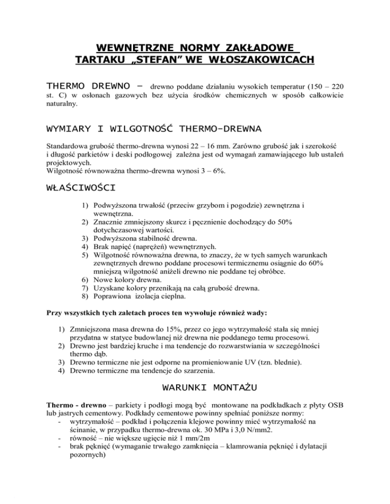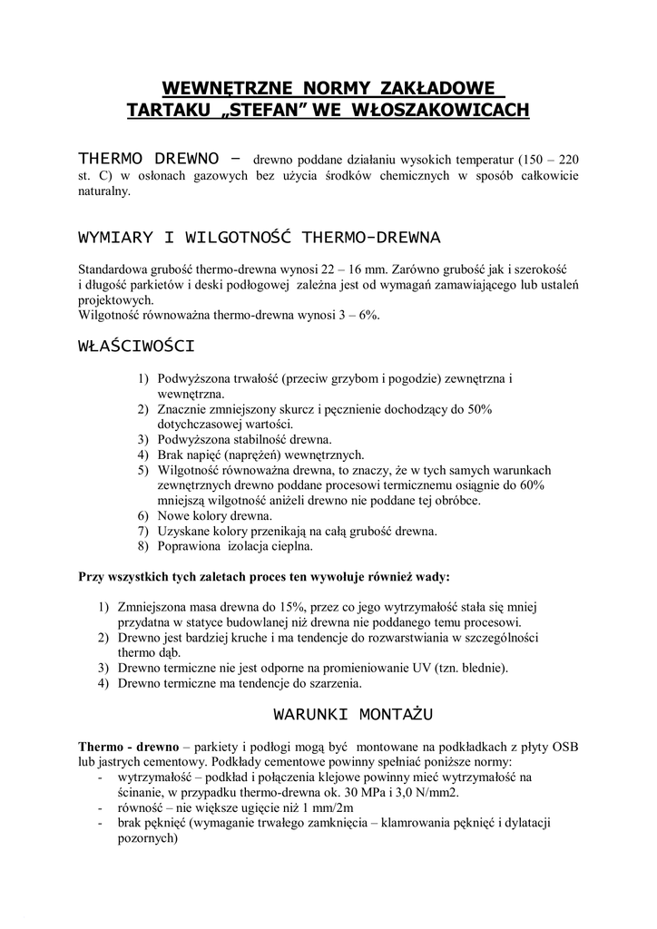 WEWNĘTRZNE NORMY ZAKŁADOWE TARTAKU „STEFAN” WE WŁOSZAKOWICACH THERMO DREWNO – drewno poddane działaniu wysokich temperatur (150 – 220 st. C) w osłonach gazowych bez użycia środków chemicznych w sposób całkowicie naturalny. WYMIARY I WILGOTNOŚĆ THERMO-DREWNA Standardowa grubość thermo-drewna wynosi 22 – 16 mm. Zarówno grubość jak i szerokość i długość parkietów i deski podłogowej zależna jest od wymagań zamawiającego lub ustaleń projektowych. Wilgotność równoważna thermo-drewna wynosi 3 – 6%. WŁAŚCIWOŚCI 1) Podwyższona trwałość (przeciw grzybom i pogodzie) zewnętrzna i wewnętrzna. 2) Znacznie zmniejszony skurcz i pęcznienie dochodzący do 50% dotychczasowej wartości. 3) Podwyższona stabilność drewna. 4) Brak napięć (naprężeń) wewnętrznych. 5) Wilgotność równoważna drewna, to znaczy, że w tych samych warunkach zewnętrznych drewno poddane procesowi termicznemu osiągnie do 60% mniejszą wilgotność aniżeli drewno nie poddane tej obróbce. 6) Nowe kolory drewna. 7) Uzyskane kolory przenikają na całą grubość drewna. 8) Poprawiona izolacja cieplna. Przy wszystkich tych zaletach proces ten wywołuje również wady: 1) Zmniejszona masa drewna do 15%, przez co jego wytrzymałość stała się mniej przydatna w statyce budowlanej niż drewna nie poddanego temu procesowi. 2) Drewno jest bardziej kruche i ma tendencje do rozwarstwiania w szczególności thermo dąb. 3) Drewno termiczne nie jest odporne na promieniowanie UV (tzn. blednie). 4) Drewno termiczne ma tendencje do szarzenia. WARUNKI MONTAŻU Thermo - drewno – parkiety i podłogi mogą być montowane na podkładkach z płyty OSB lub jastrych cementowy. Podkłady cementowe powinny spełniać poniższe normy: - wytrzymałość – podkład i połączenia klejowe powinny mieć wytrzymałość na ścinanie, w przypadku thermo-drewna ok. 30 MPa i 3,0 N/mm2. - równość – nie większe ugięcie niż 1 mm/2m - brak pęknięć (wymaganie trwałego zamknięcia – klamrowania pęknięć i dylatacji pozornych) - wilgotność podkładu z jastrychu cementowego nie większa niż 2% (pomiar CM) podkłady niepylące, twarde, zwarte. Thermo-drewno może być montowane jedynie na kleje gwarantujące mocne i trwałe łączenie z podkładem. Zalecane kleje do montażu parkietu i podłóg to kleje poliuretanowe jedno- i dwuskładnikowe. SZLIFOWANIE Zamontowane thermo-drewno wymaga wykończenia, podobnie jak każdy inny rodzaj surowego parkietu litego. Szlifowanie parkietu powinno nastąpić po okresie tzw. aklimatyzacji drewna w pomieszczeniu, który w zależności od gatunku drewna, jego wymiarów i warunków panujących w pomieszczeniu, powinien wynosić od 3 tygodni do 4 tygodni. Szlifowanie odbywa się, aż do osiągnięcia szlifu o granulacji 100 lub 120 (w razie rozwarstwienia należy taką klepkę wymienić przed lakierowaniem i olejowaniem), następnie wyrób jest polerowany i lakierowany lub olejowany i woskowany, według zaleceń zamawiającego lub ustaleń projektowych. PRZECHOWYWANIE Thermo – drewno, o ile to możliwe, należy montować po 2- 3 tygodniach po dostarczeniu na teren budowy. W razie konieczności przechowywania należy składować thermo-drewno w suchym i przewiewnym miejscu, nie wystawionym na bezpośrednie działanie promieni słonecznych. Paczki thermo-drewna należy izolować od podłoża składując je np. na podestach. Warunki klimatyczne pomieszczenia w trakcie przechowywania, montażu i użytkowania parkietów określone są normami, które odpowiednio wynoszą: - wilgotność powietrza : 45 – 65% - temperatura powietrza : 18 – 22 st. C Klient ma prawo reklamować towar tylko przed położeniem. Zapoznałem(am) się i akceptuję normy zakładowe Tartaku „STEFAN” we Włoszakowicach .............................. (Data i podpis)