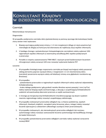Czerniak Rekomendacje merytoryczne Diagnostyka W przypadku podejrzenia czerniaka skóry (potwierdzonej za pomocą ręcznego dermatoskopu) każdy chory winien mieć wykonane: 1. Biopsję wycinającą podejrzanej zmiany z 1-2 mm marginesem (długa oś cięcia powinna być równoległa do długiej osi kończyny lub skierowana do najbliższej stacji węzłów chłonnych). 2. U każdego chorego z potwierdzonym histopatologicznie czerniakiem należy wykonać USG regionalnych węzłów chłonnych (z ewentualną weryfikacją BAC węzłów podejrzanych o przerzuty). 3. Ponadto w stopniu zaawansowania TNM IIIB/C i wyższym przed każdorazowym leczeniem chirurgicznym należy oznaczyć LDH oraz rozważyć wykonanie badanie PET Leczenie 1. W przypadku histologicznego rozpoznania czerniaka po biopsji wycinającej należy poszerzyć zabieg pierwotny poprzez wycięcie blizny z marginesem 1-2 cm niezmienionej skóry (szerokość poszerzenia wycięcia zależy od lokalizacji zmiany oraz głębokości naciekania wg Breslowa). 2. W przypadku: - potwierdzenia przerzutów w regionalnych węzłach chłonnych należy wykonać odpowiednią limfadenektomię; - braku takiego podejrzenia i gdy grubość nacieku Breslow wynosi powyżej 1 mm (>pT1a) należy wykonać biopsję węzła wartowniczego, a decyzję o uzupełniającej limfadenektomii uzależnić od ewentualnej obecności przerzutu w węźle wartowniczym. 3. U chorego po terapeutycznej limfadenektomii charakteryzującego się dużym ryzykiem nawrotu regionalnego należy rozważyć uzupełniającą radioterapię. 4. W przypadku izolowanych przerzutów odległych (np. w tkance podskórnej, węzłach chłonnych, tkankach miękkich, narządach jamy brzusznej, płucu, mózgu) należy rozważyć leczenie operacyjne (z założeniem całkowitego usunięcia zmian przerzutowych) . 5. W przypadku izolowanych, ale nieresekcyjnych przerzutów odległych lub rozsiewu systemowego należy rozważyć zastosowanie leczenia systemowego lub kwalifikację chorego do badań klinicznych. 6. W przypadku potwierdzenia przerzutów odległych czerniaka należy wykonać oznaczenie mutacji BRAF
