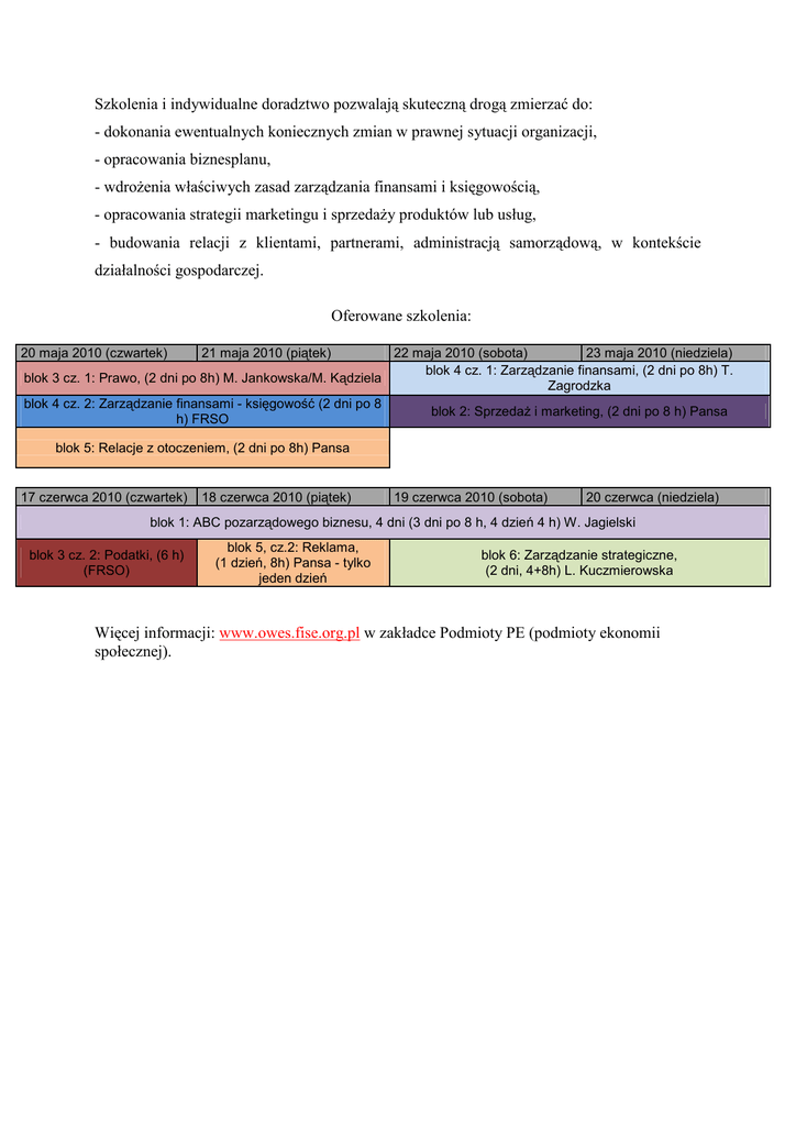 Szkolenia i indywidualne doradztwo pozwalają skuteczną drogą zmierzać do: - dokonania ewentualnych koniecznych zmian w prawnej sytuacji organizacji, - opracowania biznesplanu, - wdroŜenia właściwych zasad zarządzania finansami i księgowością, - opracowania strategii marketingu i sprzedaŜy produktów lub usług, - budowania relacji z klientami, partnerami, administracją samorządową, w kontekście działalności gospodarczej. Oferowane szkolenia: 20 maja 2010 (czwartek) 21 maja 2010 (piątek) 22 maja 2010 (sobota) 23 maja 2010 (niedziela) blok 4 cz. 1: Zarządzanie finansami, (2 dni po 8h) T. blok 3 cz. 1: Prawo, (2 dni po 8h) M. Jankowska/M. Kądziela Zagrodzka blok 4 cz. 2: Zarządzanie finansami - księgowość (2 dni po 8 blok 2: SprzedaŜ i marketing, (2 dni po 8 h) Pansa h) FRSO blok 5: Relacje z otoczeniem, (2 dni po 8h) Pansa 17 czerwca 2010 (czwartek) 18 czerwca 2010 (piątek) 19 czerwca 2010 (sobota) 20 czerwca (niedziela) blok 1: ABC pozarządowego biznesu, 4 dni (3 dni po 8 h, 4 dzień 4 h) W. Jagielski blok 3 cz. 2: Podatki, (6 h) (FRSO) blok 5, cz.2: Reklama, (1 dzień, 8h) Pansa - tylko jeden dzień blok 6: Zarządzanie strategiczne, (2 dni, 4+8h) L. Kuczmierowska Więcej informacji: www.owes.fise.org.pl w zakładce Podmioty PE (podmioty ekonomii społecznej).