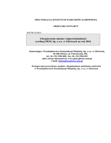 SPECYFIKACJA ISTOTNYCH WARUNKÓW ZAMÓWIENIA PRZETARG OTWARTY PO/TR/14/2015 Ubezpieczenie mienia i odpowiedzialności cywilnej PKM, Sp. z o.o. w Gliwicach na rok 2016 Zamawiający: Przedsiębiorstwo Komunikacji Miejskiej, Sp. z o.o. w Gliwicach, 44-100 Gliwice, ul. Chorzowska 150, tel.: (0...32) 3304 600; fax: (0...32) 3304 601 adres strony internetowej: www.pkm-gliwice.com.pl e’mail: [email protected] Postępowanie prowadzone zgodnie z Regulaminem udzielania zamówień w Przedsiębiorstwie Komunikacji Miejskiej, Sp. z o.o. w Gliwicach SPIS TREŚCI Rozdział I. PRZEDMIOT ZAMÓWIENIA ............................................................................................. 2 1. Informacje o Zamawiającym 2 2. Postanowienia ogólne 2 3. Okres ubezpieczenia 2 4. Opis przedmiotu zamówienia 2 5. Podstawowe wymagania 3 6. Klauzule obligatoryjne 8 7. Istotne informacje uzupełniające 12 8. Warunki płatności 14 9. Istotne informacje uzupełniające 14 Rozdział II. INSTRUKCJA DLA UBEZPIECZYCIELI...................................................................... 15 1. Informacja o dokumentach, które mają złożyć Ubezpieczyciele 15 2. Sposób przygotowywania ofert 15 3. Kryteria wyboru najkorzystniejszej oferty: cena - 100% 16 4. Miejsce i termin składania ofert 17 5. Termin, do którego Ubezpieczyciel będzie związany złożoną ofertą 17 6. Miejsce i termin otwarcia ofert 17 7. Informacje o trybie otwarcia i oceny ofert 17 8. Sposób porozumiewania się Zamawiającego z Ubezpieczycielami oraz przekazywania oświadczeń i dokumentów. Osoby uprawnione do kontaktowania się z Ubezpieczycielami 17 Rozdział III. OPIS SPOSOBU OBLICZANIA CENY OFERTY I OCENA OFERT ....................... 19 Rozdział IV. WZÓR UMOWY – ISTOTNE POSTANOWIENIA ...................................................... 20 Załącznik nr 1 do Umowy Generalnej – Ogólne Warunki Ubezpieczenia ........................................... 24 Załącznik nr 2 do Umowy Generalnej – tabela stawek i składek ......................................................... 24 Rozdział V. WYKAZ MIENIA ................................................................................................................ 25 Rozdział VI. FORMULARZ OFERTOWY ......................................... Błąd! Nie zdefiniowano zakładki. FORMULARZ OFERTOWY ................................................................ Błąd! Nie zdefiniowano zakładki. Załącznik B1: Oświadczenie Wykonawcy o spełnieniu warunków udziału w postępowaniuBłąd! Nie zdef Załącznik B2: Oświadczenie Wykonawcy o braku podstaw do wykluczeniaBłąd! Nie zdefiniowano zakład . Ubezpieczenie mienia i odpowiedzialności cywilnej PKM, Sp. z o.o. w Gliwicach na 2016r. PO/TR/14/2015 Rozdział I. PRZEDMIOT ZAMÓWIENIA 1. Informacje o Zamawiającym Przedsiębiorstwo Komunikacji Miejskiej Spółka z ograniczoną odpowiedzialnością ul. Chorzowska 150 44-100 Gliwice kapitał zakładowy: 42 714 500 zł nr KRS 0000102832 – Rejestr Przedsiębiorców Krajowego Rejestru Sądowego, Sąd rejonowy w Gliwicach, X Wydział Gospodarczy NIP: 631-21-25-476 tel.: 32/ 33 04 600; fax: 32/ 33 04 601 adres e-mail: [email protected] adres strony internetowej: www.pkm-gliwice.com.pl 2. Postanowienia ogólne 2.1. Postępowanie o udzielenie zamówienia prowadzone jest w trybie przetargu otwartego zgodnie z Regulaminem udzielania zamówień w Przedsiębiorstwie Komunikacji Miejskiej, Sp. z o.o. w Gliwicach. 2.2. Ilekroć w treści jest mowa o SIWZ rozumie się przez to Specyfikację Istotnych Warunków Zamówienia. 2.3. Ilekroć w treści jest mowa o OWU rozumie się przez to ogólne warunki ubezpieczenia. 2.4. Treść złożonych ofert musi być zgodna z treścią SIWZ pod rygorem ich odrzucenia. 2.5. Wszelkie rozliczenia związane z realizacją zamówienia, którego dotyczy niniejsza SIWZ dokonywane będą w PLN. 2.6. Zamawiający zastrzega sobie prawo przeprowadzenia w każdym czasie dodatkowych negocjacji, także po złożeniu ofert przez Ubezpieczycieli. 3. Okres ubezpieczenia Zamówienie dotyczy ubezpieczeń z okresem odpowiedzialności Ubezpieczyciela w okresie od 01.01.2016r. do 31.12.2016r. włącznie. 4. Opis przedmiotu zamówienia 4.1 Przedmiotem zamówienia są ubezpieczenia mienia i odpowiedzialności cywilnej. 4.1.1 Ubezpieczenie odpowiedzialności cywilnej (OC); 4.1.2 Ubezpieczenie sprzętu elektronicznego (EEI); 4.1.3 Ubezpieczenie od kradzieży, rabunku i dewastacji (MK); 4.1.4 Ubezpieczenie maszyn elektrycznych od szkód elektrycznych (ME); 4.1.5 Ubezpieczenie od ognia i innych zdarzeń losowych (MO). 4.2 Podstawą zawarcia umów ubezpieczenia będą odpowiednie OWU. Wymagania określone w SIWZ mają pierwszeństwo przed OWU oraz warunkami szczególnymi przedstawionymi w ofercie. . Ubezpieczenie mienia i odpowiedzialności cywilnej PKM, Sp. z o.o. w Gliwicach na 2016r. PO/TR/14/2015 4.3 Zaoferowane warunki szczególne nie mogą zawężać ochrony ubezpieczeniowej zawartej w standardzie OWU będących podstawą złożonej oferty. 5. Podstawowe wymagania 5.1 Ubezpieczenie odpowiedzialności cywilnej (OC) 5.1.1. Wymagany zakres ochrony: odpowiedzialność cywilna deliktowa i kontraktowa Zamawiającego za szkody osobowe lub rzeczowe będące następstwem wypadku, który miał miejsce w okresie ubezpieczenia z tytułu prowadzenia działalności i z tytułu posiadania mienia, z włączeniem w szczególności odpowiedzialności cywilnej z tytułu: a) posiadania i administrowania nieruchomościami będących własnością Zamawiającego; b) wypadków przy pracy, które dotknęły pracowników Zamawiającego (OC pracodawcy); c) szkód w mieniu pracowników Zamawiającego lub osób im bliskich – w tym w pojazdach, przy czym zakres ubezpieczenia nie obejmuje szkód polegających na kradzieży pojazdu limit odpowiedzialności Ubezpieczyciela wynosi 100 000 zł na jeden i wszystkie wypadki w okresie ubezpieczenia; d) organizacji imprez typu festyn lub „Dni otwartych PK