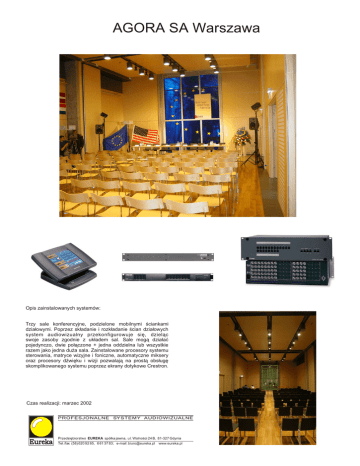 AGORA SA Warszawa Opis zainstalowanych systemów: Trzy sale konferencyjne, podzielone mobilnymi œciankami dzia³owymi. Poprzez sk³adanie i rozk³adanie œcian dzia³owych system audiowizualny przekonfigurowuje siê, dziel¹c swoje zasoby zgodnie z uk³adem sal. Sale mog¹ dzia³aæ pojedynczo, dwie po³¹czone + jedna oddzielna lub wszystkie razem jako jedna du¿a sala. Zainstalowane procesory systemu sterowania, matryce wizyjne i foniczne, automatyczne miksery oraz procesory dŸwiêku i wizji pozwalaj¹ na prost¹ obs³ugê skomplikowanego systemu poprzez ekrany dotykowe Crestron. Czas realizacji: marzec 2002 PROFESJONALNE SYSTEMY AUDIOWIZUALNE Eureka Przedsiêbiorstwo EUREKA spó³ka jawna, u l. Wolnoœci 24 B, 81-327 Gdynia Tel./fax (58) 620 92 65, 6 61 37 83; e-mail: [email protected] www.eureka.pl