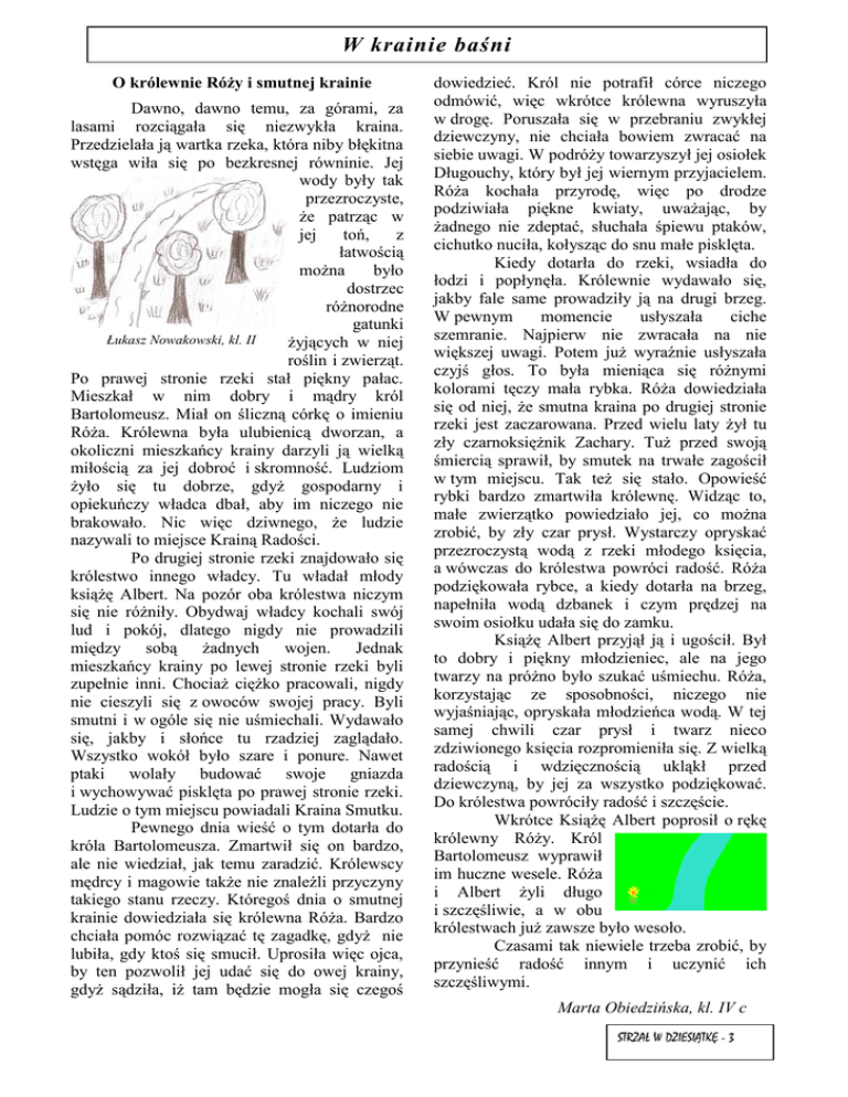 W krainie baśni O królewnie Róży i smutnej krainie Dawno, dawno temu, za górami, za lasami rozciągała się niezwykła kraina. Przedzielała ją wartka rzeka, która niby błękitna wstęga wiła się po bezkresnej równinie. Jej wody były tak przezroczyste, że patrząc w jej toń, z łatwością można było dostrzec różnorodne gatunki Łukasz Nowakowski, kl. II żyjących w niej c roślin i zwierząt. Po prawej stronie rzeki stał piękny pałac. Mieszkał w nim dobry i mądry król Bartolomeusz. Miał on śliczną córkę o imieniu Róża. Królewna była ulubienicą dworzan, a okoliczni mieszkańcy krainy darzyli ją wielką miłością za jej dobroć i skromność. Ludziom żyło się tu dobrze, gdyż gospodarny i opiekuńczy władca dbał, aby im niczego nie brakowało. Nic więc dziwnego, że ludzie nazywali to miejsce Krainą Radości. Po drugiej stronie rzeki znajdowało się królestwo innego władcy. Tu władał młody książę Albert. Na pozór oba królestwa niczym się nie różniły. Obydwaj władcy kochali swój lud i pokój, dlatego nigdy nie prowadzili między sobą żadnych wojen. Jednak mieszkańcy krainy po lewej stronie rzeki byli zupełnie inni. Chociaż ciężko pracowali, nigdy nie cieszyli się z owoców swojej pracy. Byli smutni i w ogóle się nie uśmiechali. Wydawało się, jakby i słońce tu rzadziej zaglądało. Wszystko wokół było szare i ponure. Nawet ptaki wolały budować swoje gniazda i wychowywać pisklęta po prawej stronie rzeki. Ludzie o tym miejscu powiadali Kraina Smutku. Pewnego dnia wieść o tym dotarła do króla Bartolomeusza. Zmartwił się on bardzo, ale nie wiedział, jak temu zaradzić. Królewscy mędrcy i magowie także nie znaleźli przyczyny takiego stanu rzeczy. Któregoś dnia o smutnej krainie dowiedziała się królewna Róża. Bardzo chciała pomóc rozwiązać tę zagadkę, gdyż nie lubiła, gdy ktoś się smucił. Uprosiła więc ojca, by ten pozwolił jej udać się do owej krainy, gdyż sądziła, iż tam będzie mogła się czegoś dowiedzieć. Król nie potrafił córce niczego odmówić, więc wkrótce królewna wyruszyła w drogę. Poruszała się w przebraniu zwykłej dziewczyny, nie chciała bowiem zwracać na siebie uwagi. W podróży towarzyszył jej osiołek Długouchy, który był jej wiernym przyjacielem. Róża kochała przyrodę, więc po drodze podziwiała piękne kwiaty, uważając, by żadnego nie zdeptać, słuchała śpiewu ptaków, cichutko nuciła, kołysząc do snu małe pisklęta. Kiedy dotarła do rzeki, wsiadła do łodzi i popłynęła. Królewnie wydawało się, jakby fale same prowadziły ją na drugi brzeg. W pewnym momencie usłyszała ciche szemranie. Najpierw nie zwracała na nie większej uwagi. Potem już wyraźnie usłyszała czyjś głos. To była mieniąca się różnymi kolorami tęczy mała rybka. Róża dowiedziała się od niej, że smutna kraina po drugiej stronie rzeki jest zaczarowana. Przed wielu laty żył tu zły czarnoksiężnik Zachary. Tuż przed swoją śmiercią sprawił, by smutek na trwałe zagościł w tym miejscu. Tak też się stało. Opowieść rybki bardzo zmartwiła królewnę. Widząc to, małe zwierzątko powiedziało jej, co można zrobić, by zły czar prysł. Wystarczy opryskać przezroczystą wodą z rzeki młodego księcia, a wówczas do królestwa powróci radość. Róża podziękowała rybce, a kiedy dotarła na brzeg, napełniła wodą dzbanek i czym prędzej na swoim osiołku udała się do zamku. Książę Albert przyjął ją i ugościł. Był to dobry i piękny młodzieniec, ale na jego twarzy na próżno było szukać uśmiechu. Róża, korzystając ze sposobności, niczego nie wyjaśniając, opryskała młodzieńca wodą. W tej samej chwili czar prysł i twarz nieco zdziwionego księcia rozpromieniła się. Z wielką radością i wdzięcznością ukląkł przed dziewczyną, by jej za wszystko podziękować. Do królestwa powróciły radość i szczęście. Wkrótce Książę Albert poprosił o rękę królewny Róży. Król Bartolomeusz wyprawił im huczne wesele. Róża i Albert żyli długo i szczęśliwie, a w obu królestwach już zawsze było wesoło. Czasami tak niewiele trzeba zrobić, by przynieść radość innym i uczynić ich szczęśliwymi. Marta Obiedzińska, kl. IV c STRZAŁ W DZIESIĄTKĘ - 3