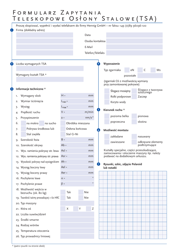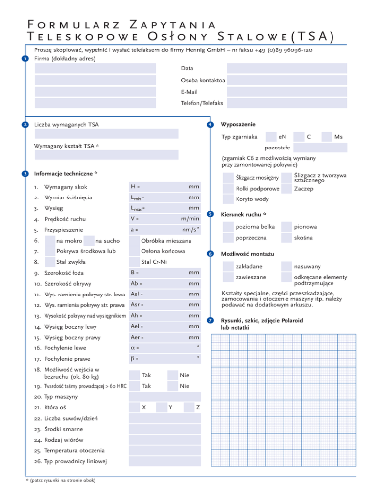 Formularz Zapytania Teleskopowe Osłony Stalowe(TSA) 1 Proszę skopiować, wypełnić i wysłać telefaksem do firmy Hennig GmbH – nr faksu +49 (0)89 96096-120 Firma (dokładny adres) Data Osoba kontaktoa E-Mail Telefon/Telefaks 2 4 Liczba wymaganych TSA Wyposażenie eN Typ zgarniaka Wymagany kształt TSA * C Ms pozostałe (zgarniak C6 z możliwością wymiany przy zamontowanej pokrywie) 3 Informacje techniczne * Ślizgacz mosiężny 1. Wymagany skok H= mm Rolki podporowe 2. Wymiar ściśnięcia Lmin = mm Koryto wody 3. Wysięg Lmax = mm 4. Prędkość ruchu V= m/min 5. Przyspieszenie a= nm/s 2 5 6. na mokro 7. Pokrywa środkowa lub Osłona końcowa 8. Stal zwykła Stal Cr-Ni Obróbka mieszana na sucho 6 9. Szerokość łoża B= mm 10. Szerokość okrywy Ab = mm 11. Wys. ramienia pokrywy str. lewa Asl = mm 12. Wys. ramienia pokrywy str. prawa Asr = mm 13. Wysokość pokrywy nad wysięgnikiem Ah = mm 14. Wysięg boczny lewy Ael = mm 15. Wysięg boczny prawy Aer = mm 16. Pochylenie lewe α= ° 17. Pochylenie prawe β= ° 18. Możliwość wejścia w bezruchu (ok. 80 kg) Tak Nie 19. Twardość taśmy prowadzącej > 60 HRC Tak Nie 20. Typ maszyny 21. Która oś 22. Liczba suwów/dzień 23. Środki smarne 24. Rodzaj wiórów 25. Temperatura otoczenia 26. Typ prowadnicy liniowej * (patrz rysunki na stronie obok) X Y Z Ślizgacz z tworzywa sztucznego Zaczep Kierunek ruchu * pozioma belka pionowa poprzeczna skośna Możliwość montażu zakładane nasuwany zawieszane odkręcane elementy podtrzymujące Kształty specjalne, części przeszkadzające, zamocowania i otoczenie maszyny itp. należy podawać na dodatkowym arkuszu. 7 Rysunki, szkic, zdjęcie Polaroid lub notatki Formularz Zapytania Mieszek Falisty Proszę skopiować, wypełnić i wysłać telefaksem do firmy Hennig GmbH – nr faksu +49 (0)89 96096-120 1 Firma (dokładny adres) Data Osoba kontaktoa E-Mail Telefon/Telefaks 2 3 Informacje techniczne * Materiał ramy końcowej 1. Wymagany skok H= mm Stal CrNi 2. Wymiar ściśnięcia Lmin = mm PVC Alu 3. Wysięg Lmax = mm 4. Wysokość składania e= mm Standard wysunięty Kołnierz 5. Długość lamelek g= mm na rzep wystający węża 6. Szerokość mieszka a= mm 7. Mieszek (wewnątrz) d= mm 8. Mieszek (zewnątrz) D= mm 9. Podchwyt I= mm 10. Prędkość ruchu v= m/min 11. Przyspieszenie a= m/s2 12. Szerokość toru B= mm 13. Wysokość ramienia lewa (zewnątrz) c1 = 14. Wysokość ramienia prawa (zewnątrz) c2 = 15. Wysokość mieszka nad podporą h= 4 5 6 16. Typ maszyny X 17. Oś 18. Liczba suwów/dzień Y pozioma belka pionowo poprzeczna pozostałe Warunki eksploatacyjne Wióry Ruszt Drewno Płyn chłodzący ** Temperatura Olej Pyl Iskry Kształt standardowy * 8 Liczba zamawianych części 9 Rysunki, szkic, zdjęcie lub notatki Z 20. Rodzaj wiórów 21. Temperatura otoczenia 22. Typ prowadnicy liniowej a e a c2 d * patrz odpowiednia strona w tym prospekcie Sposób działania 7 19. Chłodziwa i smary c1 Rodzaj zamocowania * ** bez natywnych olejów