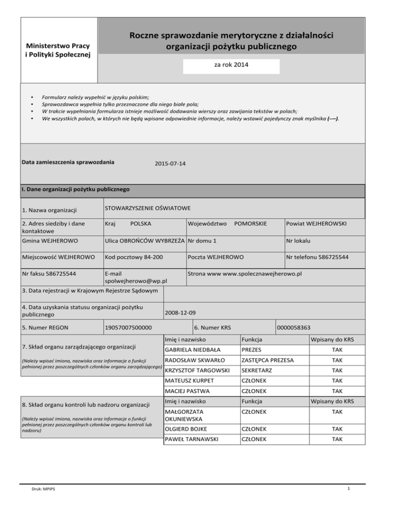 ZŽĐnjŶĞƐƉƌĂǁŽnjĚĂŶŝĞŵĞƌLJƚŽƌLJĐnjŶĞnjĚnjŝĂųĂůŶŽƑĐŝ ŽƌŐĂŶŝnjĂĐũŝƉŽǏLJƚŬƵƉƵďůŝĐnjŶĞŐŽ Ministerstwo Pracy ŝWŽůŝƚLJŬŝ^ƉŽųĞĐnjŶĞũ za rok 2014 • • • • &ŽƌŵƵůĂƌnjŶĂůĞǏLJǁLJƉĞųŶŝđǁũħnjLJŬƵƉŽůƐŬŝŵ͖ ^ƉƌĂǁŽnjĚĂǁĐĂǁLJƉĞųŶŝĂƚLJůŬŽƉƌnjĞnjŶĂĐnjŽŶĞĚůĂŶŝĞŐŽďŝĂųĞƉŽůĂ͖ tƚƌĂŬĐŝĞǁLJƉĞųŶŝĂŶŝĂĨŽƌŵƵůĂƌnjĂŝƐƚŶŝĞũĞŵŽǏůŝǁŽƑđĚŽĚĂǁĂŶŝĂǁŝĞƌƐnjLJŽƌĂnjnjĂǁŝũĂŶŝĂƚĞŬƐƚſǁǁƉŽůĂĐŚ͖ tĞǁƐnjLJƐƚŬŝĐŚƉŽůĂĐŚ͕ǁŬƚſƌLJĐŚŶŝĞďħĚČǁƉŝƐĂŶĞŽĚƉŽǁŝĞĚŶŝĞŝŶĨŽƌŵĂĐũĞ͕ŶĂůĞǏLJǁƐƚĂǁŝđƉŽũĞĚLJŶĐnjLJnjŶĂŬŵLJƑůŶŝŬĂ (--–). Data zamieszczenia sprawozdania 2015-07-14 /͘ĂŶĞŽƌŐĂŶŝnjĂĐũŝƉŽǏLJƚŬƵƉƵďůŝĐnjŶĞŐŽ 1. Nazwa organizacji ^dKtZz^E/K_t/dKt 2. Adres siedziby i dane kontaktowe Kraj Gmina WEJHEROWO hůŝĐĂKZKFMttzZ Nr domu 1 Nr lokalu DŝĞũƐĐŽǁŽƑđt:,ZKtK Kod pocztowy 84-200 Poczta WEJHEROWO Nr telefonu 586725544 Nr faksu 586725544 E-mail [email protected] Strona www www.spolecznawejherowo.pl POLSKA Województwo POMORSKIE Powiat WEJHEROWSKI ϯ͘ĂƚĂƌĞũĞƐƚƌĂĐũŝǁ<ƌĂũŽǁLJŵZĞũĞƐƚƌnjĞ^ČĚŽǁLJŵ ϰ͘ĂƚĂƵnjLJƐŬĂŶŝĂƐƚĂƚƵƐƵŽƌŐĂŶŝnjĂĐũŝƉŽǏLJƚŬƵ publicznego 5. Numer REGON 19057007500000 ϳ͘^ŬųĂĚŽƌŐĂŶƵnjĂƌnjČĚnjĂũČĐĞŐŽŽƌŐĂŶŝnjĂĐũŝ ;EĂůĞǏLJǁƉŝƐĂđŝŵŝŽŶĂ͕ŶĂnjǁŝƐŬĂŽƌĂnjŝŶĨŽƌŵĂĐũĞŽĨƵŶŬĐũŝ ƉĞųŶŝŽŶĞũƉƌnjĞnjƉŽƐnjĐnjĞŐſůŶLJĐŚĐnjųŽŶŬſǁŽƌŐĂŶƵnjĂƌnjČĚnjĂũČĐĞŐŽͿ ϴ͘^ŬųĂĚŽƌŐĂŶƵŬŽŶƚƌŽůŝůƵďŶĂĚnjŽƌƵŽƌŐĂŶŝnjĂĐũŝ ;EĂůĞǏLJǁƉŝƐĂđŝŵŝŽŶĂ͕ŶĂnjǁŝƐŬĂŽƌĂnjŝŶĨŽƌŵĂĐũĞŽĨƵŶŬĐũŝ ƉĞųŶŝŽŶĞũƉƌnjĞnjƉŽƐnjĐnjĞŐſůŶLJĐŚĐnjųŽŶŬſǁŽƌŐĂŶƵŬŽŶƚƌŽůŝůƵď nadzoru) Druk: MPiPS 2008-12-09 6. Numer KRS 0000058363 /ŵŝħŝŶĂnjǁŝƐŬŽ Funkcja Wpisany do KRS 'Z/>E/B PREZES TAK ZK^Bt^<tZBK ^d%WWZ^ TAK KRZYSZTOF TARGOWSKI SEKRETARZ TAK MATEUSZ KURPET BKE< TAK MACIEJ PASTWA BKE< TAK /ŵŝħŝŶĂnjǁŝƐŬŽ Funkcja DB'KZd OKUNIEWSKA BKE< TAK OLGIERD BOJKE BKE< TAK WtBdZEt^</ BKE< TAK Wpisany do KRS 1 9. Cele statutowe organizacji ;EĂůĞǏLJŽƉŝƐĂđĐĞůĞŶĂƉŽĚƐƚĂǁŝĞƐƚĂƚƵƚƵŽƌŐĂŶŝnjĂĐũŝͿ ĞůĞŵ^ƚŽǁĂƌnjLJƐnjĞŶŝĂũĞƐƚƉƌŽǁĂĚnjĞŶŝĞŽĚƉųĂƚŶĞũŝŶŝĞŽĚƉųĂƚŶĞũ ĚnjŝĂųĂůŶŽƑĐŝƉŽǏLJƚŬƵ ƉƵďůŝĐnjŶĞŐŽŶĂƌnjĞĐnjŽŐſųƵŵŝĞƐnjŬĂŷĐſǁǁnjĂŬƌĞƐŝĞ͗ 1ͿŶĂƵŬŝ͕ĞĚƵŬĂĐũŝ͕ŽƑǁŝĂƚLJŝǁLJĐŚŽǁĂŶŝĂ͕ 2ͿǁLJƉŽĐnjLJŶŬƵĚnjŝĞĐŝŝŵųŽĚnjŝĞǏLJ͕ 3) kultury, sztuki, ochrony dóbr kultury i tradycji, 4) upowszechniania kultury fizycznej, sportu i turystyki, 5) upowszechniania i rozwijania kultury regionalnej. ^ƚŽǁĂƌnjLJƐnjĞŶŝĞƌĞĂůŝnjƵũĞƐǁŽũĞĐĞůĞƌſǁŶŝĞǏƉŽƉƌnjĞnj͗ 1ͿŽƌŐĂŶŝnjŽǁĂŶŝĞƉƌĂĐLJƐƉŽųĞĐnjŶĞũĐnjųŽŶŬſǁŶĂƌnjĞĐnjƐnjŬſųŝŝŶŶLJĐŚ placówek, 10. Sposób realizacji celów statutowych organizacji 2) propagowanie nowych form pedagogicznych i dydaktycznych, 3) zdobywanie materialnego i moralnego wsparcia osób i instytucji, ;EĂůĞǏLJŽƉŝƐĂđƐƉŽƐſďƌĞĂůŝnjĂĐũŝĐĞůſǁƐƚĂƚƵƚŽǁLJĐŚŽƌŐĂŶŝnjĂĐũŝŶĂ 4ͿŝŶŝĐũŽǁĂŶŝĞ͕ƉŽƉŝĞƌĂŶŝĞŝƉƌŽǁĂĚnjĞŶŝĞĚnjŝĂųĂůŶŽƑĐŝŶĂƵŬŽǁĞũ͕ kulturalnej i artystycznej, w podstawie statutu organizacji) ƚLJŵŽƌŐĂŶŝnjŽǁĂŶŝĞŬſųŶĂƵŬŽǁLJĐŚ͕ƐĂŵŽŬƐnjƚĂųĐĞŶŝŽǁLJĐŚ͕ƐĞŵŝŶĂƌŝſǁŝ ƐƉŽƚŬĂŷ dyskusyjnych oraz bibliotek i wydawnictw, 5ͿƉƌŽǁĂĚnjĞŶŝĞŝŶŶLJĐŚĚnjŝĂųĂŷƐƉƌnjLJũĂũČĐLJĐŚƌĞĂůŝnjĂĐũŝƐƚĂƚƵƚŽǁLJĐŚĐĞůſǁ Stowarzyszenia. //͘ŚĂƌĂŬƚĞƌLJƐƚLJŬĂĚnjŝĂųĂůŶŽƑĐŝŽƌŐĂŶŝnjĂĐũŝƉŽǏLJƚŬƵƉƵďůŝĐnjŶĞŐŽǁŽŬƌĞƐŝĞƐƉƌĂǁŽnjĚĂǁĐnjLJŵ ϭ͘KƉŝƐĚnjŝĂųĂůŶŽƑĐŝƉŽǏLJƚŬƵƉƵďůŝĐnjŶĞŐŽ ϭ͘ϭ͘KƉŝƐŐųſǁŶLJĐŚ ĚnjŝĂųĂŷƉŽĚũħƚLJĐŚ ƉƌnjĞnjŽƌŐĂŶŝnjĂĐũħ ůĂƌĞĂůŝnjĂĐũŝĐĞůſǁƐƚĂƚƵƚŽǁLJĐŚ^ƚŽǁĂƌnjLJƐnjĞŶŝĞƉƌŽǁĂĚnjŝĚnjŝĂųĂůŶŽƑđƉŽǏLJƚŬƵƉƵďůŝĐnjŶĞŐŽ͕ŬƚſƌĞũ przedmiotem jest zgodne z PKD: ĂͿǁLJĐŚŽǁĂŶŝĞƉƌnjĞĚƐnjŬŽůŶĞ;ƌĞĂůŝnjŽǁĂŶĞďLJųŽǁĚǁſĐŚŐƌƵƉĂĐŚƉƌnjĞĚƐnjŬŽůŶLJĐŚͿ ďͿƐnjŬŽųLJƉŽĚƐƚĂǁŽǁĞ;njĂĚĂŶŝĂƌĞĂůŝnjŽǁĂŶŽǁĚnjŝĞǁŝħĐŝƵŽĚĚnjŝĂųĂĐŚͿ ĐͿŐŝŵŶĂnjũƵŵ;njĂĚĂŶŝĂƌĞĂůŝnjŽǁĂŶŽǁƚƌnjĞĐŚŽĚĚnjŝĂųĂĐŚͿ d) pozaszkolne formy edukacji ^ƚŽǁĂƌnjLJƐnjĞŶŝĞƌĞĂůŝnjƵũĞƐǁŽũĞĐĞůĞƌſǁŶŝĞǏƉŽƉƌnjĞnj͗ 1ͿŽƌŐĂŶŝnjŽǁĂŶŝĞƉƌĂĐLJƐƉŽųĞĐnjŶĞũĐnjųŽŶŬſǁŶĂƌnjĞĐnjƐnjŬſųŝŝŶŶLJĐŚƉůĂĐſǁĞŬ͕ 2) propagowanie nowych form pedagogicznych i dydaktycznych, 3) zdobywanie materialnego i moralnego wsparcia osób i instytucji, 4ͿŝŶŝĐũŽǁĂŶŝĞ͕ƉŽƉŝĞƌĂŶŝĞŝƉƌŽǁĂĚnjĞŶŝĞĚnjŝĂųĂůŶŽƑĐŝŶĂƵŬŽǁĞũ͕ŬƵůƚƵƌĂůŶĞũŝĂƌƚLJƐƚLJĐnjŶĞũ͕ǁ ƚLJŵŽƌŐĂŶŝnjŽǁĂŶŝĞŬſųŶĂƵŬŽǁLJĐŚ͕ƐĂŵŽŬƐnjƚĂųĐĞŶŝŽǁLJĐŚ͕ƐĞŵŝŶĂƌŝſǁŝƐƉŽƚŬĂŷ dyskusyjnych oraz bibliotek i wydawnictw, 5ͿƉƌŽǁĂĚnjĞŶŝĞŝŶŶLJĐŚĚnjŝĂųĂŷƐƉƌnjLJũĂũČĐLJĐŚƌĞĂůŝnjĂĐũŝƐƚĂƚƵƚŽǁLJĐŚĐĞůſǁ^ƚŽǁĂƌnjLJƐnjĞŶŝĂ ^njŬŽųĂWŽĚƐƚĂǁŽǁĂĐĞůĞ^ƚŽǁĂƌnjLJƐnjĞŶŝĂƌĞĂůŝnjƵũĞƉŽƉƌnjĞnj͗ 1͘ĂǁĂŶŝĞƉŽĚƐƚĂǁƌnjĞƚĞůŶĞũǁŝĞĚnjLJƵŵŽǏů