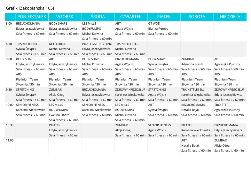 Grafik [Zakopiańska 105] PONIEDZIAŁEK 8:00 WTOREK ŚRODA CZWARTEK PIĄTEK BRZUCHOMANIA BODY SHAPE LES MILLS ABT GT WOD Edyta Jaszczykiewicz Edyta Jaszczykiewicz BODYPUMP® Agata Wójcik Blanka Potępa Sala fitness I / 60 min Sala fitness I / 60 min Michał Dziwina Sala fitness I / 60 min Sala fitness I / 60 min SOBOTA NIEDZIELA Sala fitness I / 60 min 8:30 TRX/KETTLEBELL KETTLEBELL PILATES/STRETCHING TRX/KETTLEBELL Sylwia Świątek Michał Dziwina Edyta Jaszczykiewicz Michał Dziwina Sala fitness II / 60 min Sala fitness II / 60 min Sala fitness II / 60 min Sala fitness II / 60 min 9:00 9:30 BODY SHAPE ABT BODY SHAPE BRZUCHOMANIA BODY SHAPE ZUMBA® ABT Edyta Jaszczykiewicz Edyta Jaszczykiewicz Michał Dziwina Agata Wójcik Sylwia Świątek Adrianna Frasik Agnieszka Pulchny Sala fitness I / 60 min Sala fitness I / 60 min Sala fitness I / 60 min Sala fitness I / 60 min Sala fitness I / 60 min Sala fitness I / 60 min Sala fitness I / 60 min ABS ABS ABS ABS ABS ABS ABS Platinium Team Platinium Team Platinium Team Platinium Team Platinium Team Platinium Team Platinium Team Siłownia / 30 min Siłownia / 30 min Siłownia / 30 min Siłownia / 30 min Siłownia / 30 min Siłownia / 30 min Siłownia / 30 min STRETCHING ZUMBA® BRZUCHOMANIA ZDROWY KRĘGOSŁUP STRETCHING TRX/KETTLEBELL ZDROWY KRĘGOSŁUP Sylwia Świątek Alicja Ożóg Edyta Jaszczykiewicz Karolina Więckowska Karolina Więckowska Edyta Jaszczykiewicz Agata Wójcik Sala fitness II / 60 min Sala fitness II / 60 min Sala fitness II / 60 min Sala fitness II / 60 min Sala fitness II / 60 min Sala fitness II / 60 min Sala fitness II / 60 min 10:00 SENIOR FITNESS 10:30 11:00 LES MILLS SENIOR FITNESS LES MILLS ABT BRZUCHOMANIA TBC+STEP Karolina Więckowska BODYPUMP® Karolina Więckowska BODYPUMP® Sylwia Świątek Natalia Bajak Agnieszka Pulchny Sala fitness I / 60 min Ewelina Oberc Sala fitness I / 60 min Michał Dziwina Sala fitness I / 60 min Sala fitness I / 60 min Sala fitness I / 60 min Sala fitness I / 60 min Sala fitness I / 60 min PILATES ZUMBA® SENIOR FITNESS PILATES BRZUCHOMANIA Edyta Jaszczykiewicz Alicja Ożóg Agata Wójcik Karolina Więckowska Edyta Jaszczykiewicz Sala fitness II / 60 min Sala fitness II / 60 min Sala fitness II / 60 min Sala fitness II / 60 min Sala fitness II / 60 min ABT ZUMBA® Natalia Bajak Alicja Ożóg Sala fitness I / 60 min Sala fitness I / 60 min 11:30 PILATES/STRETCHING Agnieszka Pulchny Sala fitness II / 60 min 12:30 GT MOBILITY Blanka Potępa Sala fitness II / 60 min 15:00 ABT ABT BODY SHAPE GT SPECJAL Edyta Jaszczykiewicz Edyta Jaszczykiewicz Edyta Jaszczykiewicz Blanka Potępa Sala fitness I / 60 min Sala fitness I / 60 min Sala fitness I / 60 min Sala fitness I / 60 min 16:00 BODY SHAPE BRZUCHOMANIA BODY SHAPE BRZUCHOMANIA ABT CARDIO BRZUCHOMANIA Edyta Jaszczykiewicz Edyta Jaszczykiewicz Kinga Sokół Edyta Jaszczykiewicz Justyna Mazur Platinium Team Marcelina Augustyn Sala fitness I / 60 min Sala fitness I / 60 min Sala fitness I / 60 min Sala fitness I / 60 min Sala fitness I / 60 min Siłownia / 30 min Sala fitness I / 60 min CARDIO CARDIO CARDIO CARDIO CARDIO CARDIO Platinium Team Platinium Team Platinium Team Platinium Team Platinium Team Platinium Team Siłownia / 30 min Siłownia / 30 min Siłownia / 30 min Siłownia / 30 min Siłownia / 30 min Siłownia / 30 min 16:30 STRETCHING PILATES ABT Wiktoria Mazan Sylwia Świątek Edyta Jaszczykiewicz Sala fitness II / 60 min Sala fitness II / 60 min Sala fitness II / 60 min 17:00 GT STRENGTH LES MILLS BRZUCHOMANIA ENERGY JUMP BRZUCHOMANIA ZUMBA® LES MILLS Blanka Potępa BODYPUMP® Kinga Sokół Anna Zemla Justyna Mazur Alicja Ożóg BODYPUMP® Sala fitness I / 60 min Sylwia Zgłobik - Sala fitness I / 60 min Sala fitness I / 60 min Sala fitness I / 60 min Sala fitness I / 60 min Marcelina Augustyn Kapuścińska Sala fitness I / 60 min Sala fitness I / 60 min 17:30 TRX Hanna Olbińska CROSS FITNESS PUPOMANIA Platinium Team Platinium Team Siłownia / 30 min Siłownia / 30 min PILATES TRX TRX/KETTLEBELL SALSATION Wiktoria Mazan Sylwia Świątek Sylwia Świątek Aleksandra Milczarek Sala fitness II / 60 min Sala fitness II / 60 min Sala fitness II / 60 min Sala fitness II / 60 min Sala fitness II / 60 min 18:00 LES MILLS SALSATION ZUMBA® XCO LES MILLS BODY SHAPE ZUMBA® BODYPUMP® Aleksandra Milczarek Paulina Paluch Anna Zemla BODYPUMP® Edyta Jaszczykiewicz Paulina Paluch Michał Dziwina Sala fitness I / 60 min Sala fitness I / 60 min Sala fitness I / 60 min Sylwia Zgłobik - Sala fitness I / 60 min Sala fitness I / 60 min Sala fitness I / 60 min Kapuścińska Sala fitness I / 60 min ABS ABS ABS ABS ABS ABS ABS Platinium Team Platinium Team Platinium Team Platinium Team Platinium Team Platinium Team Platinium Team Siłownia / 30 min Siłownia / 30 min Siłownia / 30 min Siłownia / 30 min Siłownia / 30 min Siłownia / 30 min Siłownia / 30 min 18:30 BRZUCHOMANIA TRX/KETTLEBELL ABT STRETCHING TRX Martyna Kundera Hanna Olbińska Sylwia Świątek Sylwia Świątek TRENING TRENING Hanna Olbińska Sala fitness II / 60 min Sala fitness II / 60 min Sala fitness II / 60 min Sala fitness II / 60 min Sala fitness II / 60 min 19:00 ENERGY JUMP BODY SHAPE ENERGY JUMP ZUMBA® Natalia Bajak Ewelina Oberc Kinga Sokół Agnieszka Sobolewska Sylwia Zgłobik - OBWODOWY DLA OBWODOWY DLA Sala fitness I / 60 min Sala fitness I / 60 min Sala fitness I / 60 min Sala fitness I / 60 min Kapuścińska PAŃ PAŃ Sala fitness I / 60 min Platinium Team Platinium Team Siłownia / 30 min Siłownia / 30 min TRENING TRENING OBWODOWY DLA OBWODOWY DLA PAŃ PAŃ Platinium Team Platinium Team Siłownia / 30 min Siłownia / 30 min 19:30 ZUMBA® BRZUCHOMANIA Weronika Kosmowska Renata Mączyńska BODY SHAPE BOSU/KETTLEBELL BRZUCHOMANIA STRETCHING Renata Mączyńska Hanna Olbińska Sylwia Świątek Sala fitness II / 60 min Sala fitness II / 60 min Sala fitness II / 60 min Sala fitness II / 60 min Sala fitness II / 60 min 20:00 BRZUCHOMANIA ZDROWY KRĘGOSŁUP GT CORE GT COMPACT GT 