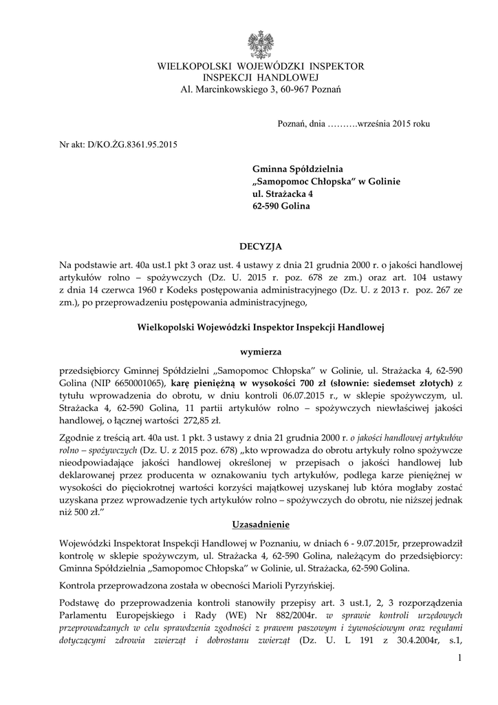 WIELKOPOLSKI WOJEWÓDZKI INSPEKTOR INSPEKCJI HANDLOWEJ Al. Marcinkowskiego 3, 60-967 Poznań Poznań, dnia ……….września 2015 roku Nr akt: D/KO.ŻG.8361.95.2015 Gminna Spółdzielnia „Samopomoc Chłopska” w Golinie ul. Strażacka 4 62-590 Golina DECYZJA Na podstawie art. 40a ust.1 pkt 3 oraz ust. 4 ustawy z dnia 21 grudnia 2000 r. o jakości handlowej artykułów rolno – spożywczych (Dz. U. 2015 r. poz. 678 ze zm.) oraz art. 104 ustawy z dnia 14 czerwca 1960 r Kodeks postępowania administracyjnego (Dz. U. z 2013 r. poz. 267 ze zm.), po przeprowadzeniu postępowania administracyjnego, Wielkopolski Wojewódzki Inspektor Inspekcji Handlowej wymierza przedsiębiorcy Gminnej Spółdzielni „Samopomoc Chłopska” w Golinie, ul. Strażacka 4, 62-590 Golina (NIP 6650001065), karę pieniężną w wysokości 700 zł (słownie: siedemset złotych) z tytułu wprowadzenia do obrotu, w dniu kontroli 06.07.2015 r., w sklepie spożywczym, ul. Strażacka 4, 62-590 Golina, 11 partii artykułów rolno – spożywczych niewłaściwej jakości handlowej, o łącznej wartości 272,85 zł. Zgodnie z treścią art. 40a ust. 1 pkt. 3 ustawy z dnia 21 grudnia 2000 r. o jakości handlowej artykułów rolno – spożywczych (Dz. U. z 2015 poz. 678) „kto wprowadza do obrotu artykuły rolno spożywcze nieodpowiadające jakości handlowej określonej w przepisach o jakości handlowej lub deklarowanej przez producenta w oznakowaniu tych artykułów, podlega karze pieniężnej w wysokości do pięciokrotnej wartości korzyści majątkowej uzyskanej lub która mogłaby zostać uzyskana przez wprowadzenie tych artykułów rolno – spożywczych do obrotu, nie niższej jednak niż 500 zł.” Uzasadnienie Wojewódzki Inspektorat Inspekcji Handlowej w Poznaniu, w dniach 6 - 9.07.2015r, przeprowadził kontrolę w sklepie spożywczym, ul. Strażacka 4, 62-590 Golina, należącym do przedsiębiorcy: Gminna Spółdzielnia „Samopomoc Chłopska” w Golinie, ul. Strażacka, 62-590 Golina. Kontrola przeprowadzona została w obecności Marioli Pyrzyńskiej. Podstawę do przeprowadzenia kontroli stanowiły przepisy art. Parlamentu Europejskiego i Rady (WE) Nr 882/2004r. w przeprowadzanych w celu sprawdzenia zgodności z prawem paszowym dotyczącymi zdrowia zwierząt i dobrostanu zwierząt (Dz. U. 3 ust.1, 2, 3 rozporządzenia sprawie kontroli urzędowych i żywnościowym oraz regułami L 191 z 30.4.2004r, s.1, 1 ze zm.), art.17 ust.3 ustawy z dn. 21.12.2000 r. o jakości handlowej artykułów rolno-spożywczych (Dz. U. z 2015 r. poz 678), art. 3 ust 1 pkt 1, 2, 6 ustawy z dn.15.12.2000 r. o Inspekcji Handlowej (Dz. U. z 2014r. poz.148 ze zm). Celem kontroli, sprecyzowanym w treści upoważnienia do przeprowadzenia kontroli nr D/KO.ŻG.8361.95.2015 z dnia 06.07.2015 r., była m.in. ocena prawidłowości oznakowania środków spożywczych oferowanych przez kontrolowanego przedsiębiorcę. Dowód: upoważnienie do przeprowadzenia kontroli nr D/KO.ŻG.8361.95.2015 (k. 4) protokół kontroli (k. 7-13) informacja odpowiadająca odpisowi aktualnemu z KRS (k. 31-34) W toku kontroli inspektorzy Inspekcji Handlowej stwierdzili nieprawidłowości w oznakowaniu nw. produktów oferowanych bez opakowania tj. a) maślany – (wg informacji na wywieszce; wg. osoby upoważnionej na dowodzie dostawy jako „chleb mazurski 0,4kg”) – 11 szt. w cenie 1,75 zł wartości 19,25 zł; dowód dostawy Nr 01/55/162 z dnia 06.07.2015r. od Gminna Spółdzielnia „Samopomoc Chłopska”, 62-590 Golina, ul. Strażacka 4, b) multiziarno (wg informacji na wywieszce; na dowodzie dostawy jako „chleb multiziarno 0,40kg”) – 9 szt. w cenie 1,40zł wartości 12,60 zł; dowód dostawy – j.w., c) chleb z pomidorami (wg informacji na wywieszce; na dowodzie dostawy jako „bułka marchewkowa 0,2kg”) – 10 szt. w cenie 1,40zł wartości 14 zł; dowód dostawy Nr 01/55/163 z dnia 07.07.2015r. od j.w., d) kaszanka – 3 kg w cenie 12,50 zł/kg wartości 37,50 zł; dowód dostawy – faktura VAT nr 1221/0/15 z dnia 04.07.2015r. od Rzeżnictwo i Masarstwo Kazimierz Derliński Sklep Firmowy, 62-720 Brudzew, Plac Wolności 6, e) wątrobianka – 1 kg w cenie 14,20 zł/kg wartości 14,20 zł; dowód dostawy – j.w, f) kiełbasa dobra – 1 kg w cenie 15,90 zł/kg wartości 15,90 zł; dowód dostawy – faktura VAT nr 7929/1/2015 z dnia 23.06.2015r. od Zakłady Mięsne Kazimierz Kołodziejczak, ul. Toruńska 6, 62-640 Grzegorzew; g) czekolada malinowa – 4 kg w cenie 10 zł/kg 40 zł; dowód dostawy – faktura VAT nr (S)FS4130/15/SHS z dnia 29.06.2015r. od Hurtowa Spółdzielnia „Samopomoc Chłopska”, 62-510 Konin, ul. Poznańska 74, h) czekolada tiramisu – 3 kg w cenie 10 zł/kg wartości 30 zł; dowód dostawy – faktura VAT nr (S)FS-3800/15/SHS z dnia 15.06.2015r. od j.w., i) czekolada truflowa – 5 kg w cenie 10 zł/kg wartości 50 zł; dowód dostawy – faktura VAT nr (S)FS-3800/15/SHS z dnia 15.06.2015r. od j.w. ze względu na nie podanie, na wywieszce bądź w inny sposób w miejscu dostępnym bezpośrednio konsumentom wymaganych informacji, tj.: − nazwy środka spożywczego wskazanej w sposób określony w art. 17 rozporządzenia nr 1169/2011 z dnia 25 października 2011 r. w sprawie przekazywania konsumentom informacji na temat żywności, zmiany rozporządzeń Parlamentu Europejskiego i Rady (WE) nr 1924/2006 i (WE) 1925/2006 oraz uchylenia dyrektywy Komisji 87/250/EWG, dyrektywy Rady 90/496/EWG, dyrektywy Komisji 1999/10/WE, dyrektywy 200/13/WE Parlamentu Europejskiego i Rady, dyrektyw Komisji 2002/67/WE i 2008/5/WE oraz rozporządzenia Komisji (WE) nr 608/2004 (Dz.U. L 304 z 22.11.2011r. str. 18 ze zm.), co jest naruszeniem §19 ust. 1 pkt 1 oraz ust. 2 rozporządzenia Ministra Rolnictwa i Rozwoju Wsi z dnia 23.12.2014r. w sprawie znakowania poszczególnych rodzajów środków spożywczych (Dz.U. z 2015r., poz. 29) – oceniane pieczywo oraz 1 partia wędlin wartości 15,90 zł (kiełbasa dobra), 2 − nazwy albo imienia i n