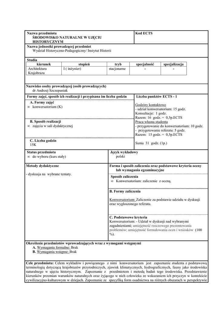 Nazwa przedmiotu ŚRODOWISKO NATURALNE W UJĘCIU HISTORYCZNYM Nazwa jednostki prowadzącej przedmiot Wydział Historyczno-Pedagogiczny/ Instytut Historii Studia kierunek Architektura Krajobrazu stopień I ( inżynier) tryb stacjonarne Kod ECTS specjalność - specjalizacja - Nazwisko osoby prowadzącej (osób prowadzących) dr Andrzej Szczepaniak Formy zajęć, sposób ich realizacji i przypisana im liczba godzin A. Formy zajęć • konwersatorium (K) B. Sposób realizacji • zajęcia w sali dydaktycznej C. Liczba godzin 15K Liczba punktów ECTS - 1 Godziny kontaktowe - udział konwersatorium: 15 godz. Konsultacje: 1 godz. Razem: 16 godz. = 0,5p.ECTS Praca własna studenta - przygotowanie do konwersatorium: 10 godz. - przygotowanie referatu: 5 godz. Razem: 15 godz. = 0,5p.ECTS Suma 31 godz. (1p.) Status przedmiotu • do wyboru (kurs stały) Język wykładowy polski Metody dydaktyczne Forma i sposób zaliczenia oraz podstawowe kryteria oceny lub wymagania egzaminacyjne - dyskusja na wybrane tematy. Sposób zaliczenia • Konwersatorium: zaliczenie z oceną. B. Formy zaliczenia Konwersatorium: Zaliczenie za podstawie udziału w dyskusji oraz wygłoszonego referatu. C. Podstawowe kryteria Konwersatorium: - Udział w dyskusji nad wybranymi zagadnieniami; umiejętność rzeczowego prezentowania problemów; umiejętność formułowania ocen i wniosków (100 %). Określenie przedmiotów wprowadzających wraz z wymogami wstępnymi A. Wymagania formalne: Brak B. Wymagania wstępne: Brak Cele przedmiotu: Celem wykładów i powiązanego z nimi konwersatorium jest zapoznanie studenta z podstawową terminologią dotyczącą krajobrazów przyrodniczych, zjawisk klimatycznych, hydrograficznych, fauny jako środowiska naturalnego w ujęciu historycznym. Zapoznanie z przedmiotem i metodą badań tego środowiska. Przedstawienie kierunków przemian warunków naturalnych oraz żyjącego w nich człowieka ze wskazaniem ich przyczyn w kontekście cywilizacyjno-kulturowym w dziejach. Zapoznanie ze specyfiką form osadnictwa na różnych obszarach w perspektywie historycznej oraz z metodami rekonstrukcji krajobrazu naturalnego i kulturalnego. Przekazanie podstawowego zasobu wiedzy na temat kształtowania się materialnych warunków życia w miastach. Pokazanie znaczenia działów wodnych w konstrukcjach geopolitycznych i społeczno-gospodarczym funkcjonowaniu państw i narodów. Treści programowe A. Problematyka konwersatorium 1. Mikrorzeźba – gleby, świat zwierząt w dawnej Polsce. 2. Metody rekonstrukcji krajobrazu naturalnego i kulturowego. 3. Orografia, hydrografia i szata roślinna ziem polskich. 4. Las w kulturze polskiej. 5. Przemiany środowiska geograficznego Polski do XV wieku. 6. Wpływ działalności gospodarczej wielkich majątków ziemskich na stan współczesny dziedzictwa przyrodniczego i kulturowego. 7. Obszar i granice Polski (od X do XX wieku) – uwarunkowania przyrodnicze. 8. Nazwy miejscowości i ich znaczenie . 9. Warunki sanitarne życia codziennego miast dawniej i dziś. 10.Rzeki w dziejach cywilizacji ze szczególnym uwzględnieniem Polski. 11.Geopolityczne znaczenie działów wodnych na przykładzie geopolitycznych koncepcji Eugeniusza Romera. 12.Rzeki a kształtowanie się regionów i euroregionów w planach Unii Europejskiej. 13. Międzymorze bałtycko-czarnomorskie. Podzielony i zapomniany centralny region Europy. 14. Wspólnota cywilizacyjna mieszkańców Europy Środkowo-Wschodniej. 15. Wpływ środowiska geograficznego na zjawiska historyczne i polityczne. Wykaz literatury A. Literatura wymagana do ostatecznego zaliczenia zajęć (zdania egzaminu): A.1. wykorzystywana podczas zajęć K. Buczek, Ziemie polskie przed tysiącem lat, Kraków 1967. A.Piskozub, Dziedzictwo polskiej przestrzeni. Geograficzno-historyczne podstawy struktur przestrzennych ziem polskich, Wrocław 1987. J.Tyszkiewicz,Ludzie i przyroda w Polsce średniowiecznej, Warszawa 1983. M. Kiełczewska-Zaleska, Geografia osadnictwa. Zarys problematyki, Warszawa 1978. Ze studiów nad życiem codziennym w średniowiecznym mieście, red. C. Buśko, J. Piekalski, Wratislavia Antiqua, t. 1, Wrocław, 1999. Przemiany środowiska geograficznego Polski, red. L.Starkel, Wrocław, 1988. A.Piskozub, Morze w dziejach cywilizacji, Toruń 1999. A.Piskozub, Rzeki w dziejach cywilizacji, Toruń 2001. A.2. studiowana samodzielnie przez studenta T. Dunin Wąsowicz, Klimat jako czynnik kształtujący środowisko człowieka w średniowieczu, w: Problemy nauk pomocniczych historii, t. 3, Katowice 1974, s. 17-35 H. Borek, Nazwy miejscowe jako źródło historyczno-osadnicze, w: Badania z dziejów osadnictwa i toponimii, Wrocław 1978, s. 37-53. Zmiany środowiska w okresie historycznym, [w:] Geografia Polski. Środowisko przyrodnicze, red. L. Starkel,Warszawa, 1999, s. 182-223. Wrocław na przełomie średniowiecza i czasów nowożytnych. Materialne przejawy życia codziennego, red. J. Piekalski, K. Wachowski, Wratislavia Antiqua, t. 6, Wrocław, 2004. T. Zipser, Rzeki a kształtowanie się regionów, “Rzeki. Kultura-Cywilizacja-Historia”, t.VI (1997), s.107-121. P. Furmański, Indywidualność geograficzna Polski w koncepcjach Eugeniusza Romera, „Geopolityka” nr 1, 2008, s. 85103. B. Literatura uzupełniająca Dzieje lasów, leśnictwa i drzewnictwa w Polsce, Warszawa 1965. J. Burszta, Od osady słowiańskiej do wsi współczesnej. O tworzeniu się Krajobrazu osadniczego ziem polskich i rozplanowań wsi, Wrocław 1958. Wpływ działalności gospodarczej wielkich majątków ziemskich na stan współczesny dziedzictwa przyrodniczego i kulturowego, red. E. Skowronek, Lublin , 2005. M.Kulesza, Zagadnienia morfogenezy i rozplanowania miast średniowiecznych w Polsce, Łódź 2011. Odniesienie do Efekty kształcenia efektów Po ukończeniu studiów student/studentka: kształcenia dla kierunku AK1A_W04 AK1A_W05 AK1A_W07 AK1A_U02 AK1A_U11 AK1_K01 AK1_K02 AK1_K08 AK1_K09 Kontakt [email protected] Wiedza - definiuje podstawową ter