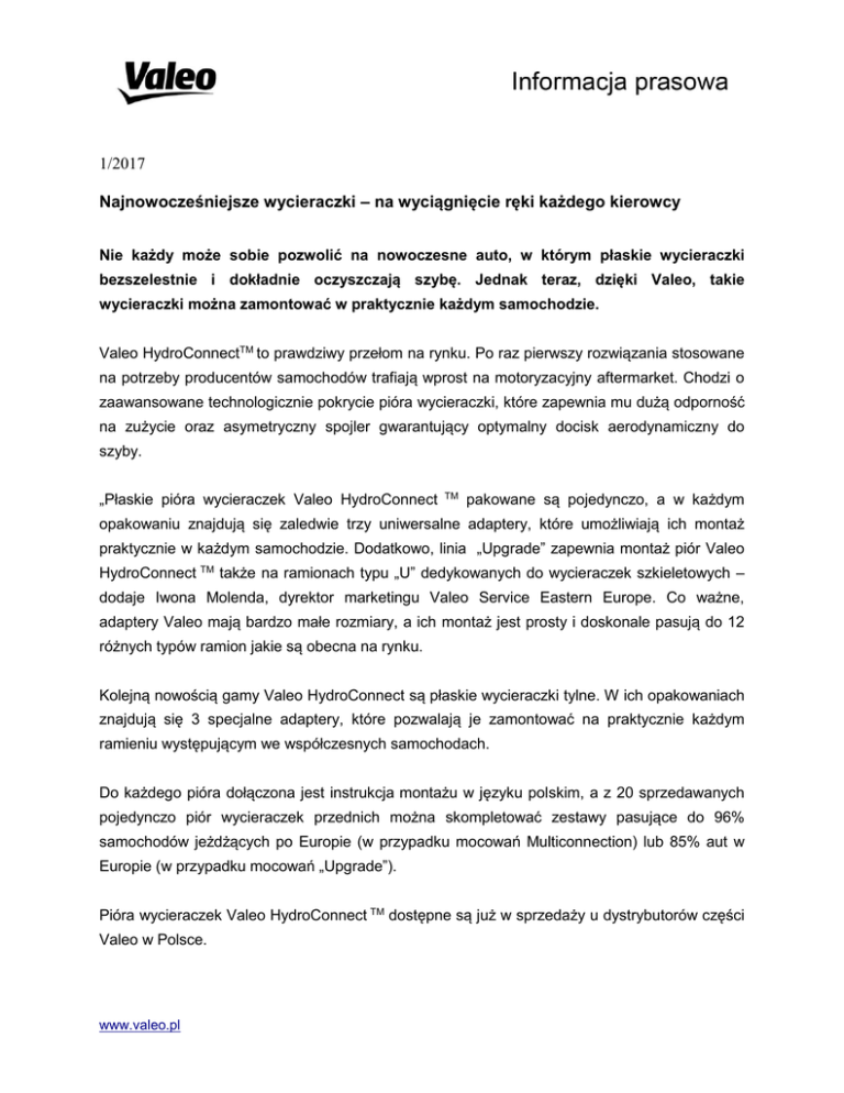 1/2017 Najnowocześniejsze wycieraczki – na wyciągnięcie ręki każdego kierowcy Nie każdy może sobie pozwolić na nowoczesne auto, w którym płaskie wycieraczki bezszelestnie i dokładnie oczyszczają szybę. Jednak teraz, dzięki Valeo, takie wycieraczki można zamontować w praktycznie każdym samochodzie. Valeo HydroConnectTM to prawdziwy przełom na rynku. Po raz pierwszy rozwiązania stosowane na potrzeby producentów samochodów trafiają wprost na motoryzacyjny aftermarket. Chodzi o zaawansowane technologicznie pokrycie pióra wycieraczki, które zapewnia mu dużą odporność na zużycie oraz asymetryczny spojler gwarantujący optymalny docisk aerodynamiczny do szyby. „Płaskie pióra wycieraczek Valeo HydroConnect TM pakowane są pojedynczo, a w każdym opakowaniu znajdują się zaledwie trzy uniwersalne adaptery, które umożliwiają ich montaż praktycznie w każdym samochodzie. Dodatkowo, linia „Upgrade” zapewnia montaż piór Valeo HydroConnect TM także na ramionach typu „U” dedykowanych do wycieraczek szkieletowych – dodaje Iwona Molenda, dyrektor marketingu Valeo Service Eastern Europe. Co ważne, adaptery Valeo mają bardzo małe rozmiary, a ich montaż jest prosty i doskonale pasują do 12 różnych typów ramion jakie są obecna na rynku. Kolejną nowością gamy Valeo HydroConnect są płaskie wycieraczki tylne. W ich opakowaniach znajdują się 3 specjalne adaptery, które pozwalają je zamontować na praktycznie każdym ramieniu występującym we współczesnych samochodach. Do każdego pióra dołączona jest instrukcja montażu w języku polskim, a z 20 sprzedawanych pojedynczo piór wycieraczek przednich można skompletować zestawy pasujące do 96% samochodów jeżdżących po Europie (w przypadku mocowań Multiconnection) lub 85% aut w Europie (w przypadku mocowań „Upgrade”). Pióra wycieraczek Valeo HydroConnect TM dostępne są już w sprzedaży u dystrybutorów części Valeo w Polsce. www.valeo.pl