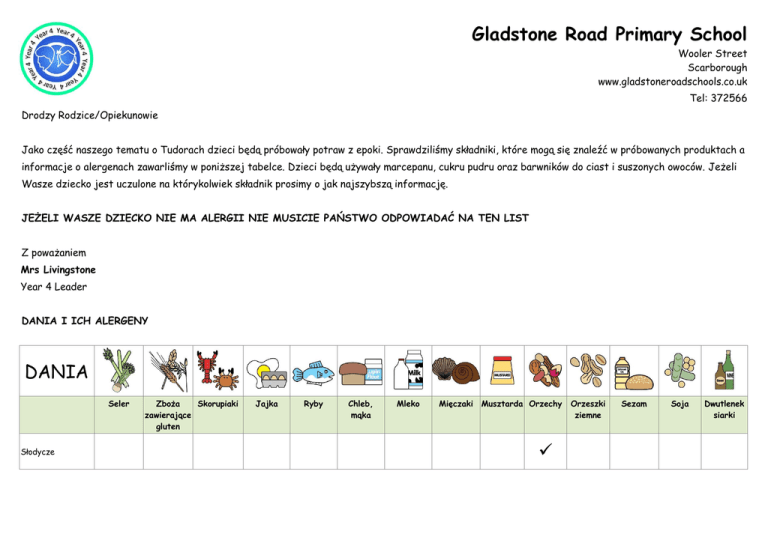 Gladstone Road Primary School Wooler Street Scarborough www.gladstoneroadschools.co.uk Tel: 372566 Drodzy Rodzice/Opiekunowie Jako część naszego tematu o Tudorach dzieci będą próbowały potraw z epoki. Sprawdziliśmy składniki, które mogą się znaleźć w próbowanych produktach a informacje o alergenach zawarliśmy w poniższej tabelce. Dzieci będą używały marcepanu, cukru pudru oraz barwników do ciast i suszonych owoców. Jeżeli Wasze dziecko jest uczulone na którykolwiek składnik prosimy o jak najszybszą informację. JEŻELI WASZE DZIECKO NIE MA ALERGII NIE MUSICIE PAŃSTWO ODPOWIADAĆ NA TEN LIST Z poważaniem Mrs Livingstone Year 4 Leader DANIA I ICH ALERGENY DANIA Seler Słodycze Zboża Skorupiaki zawierające gluten Jajka Ryby Chleb, mąka Mleko Mięczaki Musztarda Orzechy Orzeszki ziemne Sezam Soja Dwutlenek siarki